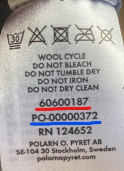 PO-nummer och artikelnummer finns på andra sidan av skötselrådslappen i plagget.