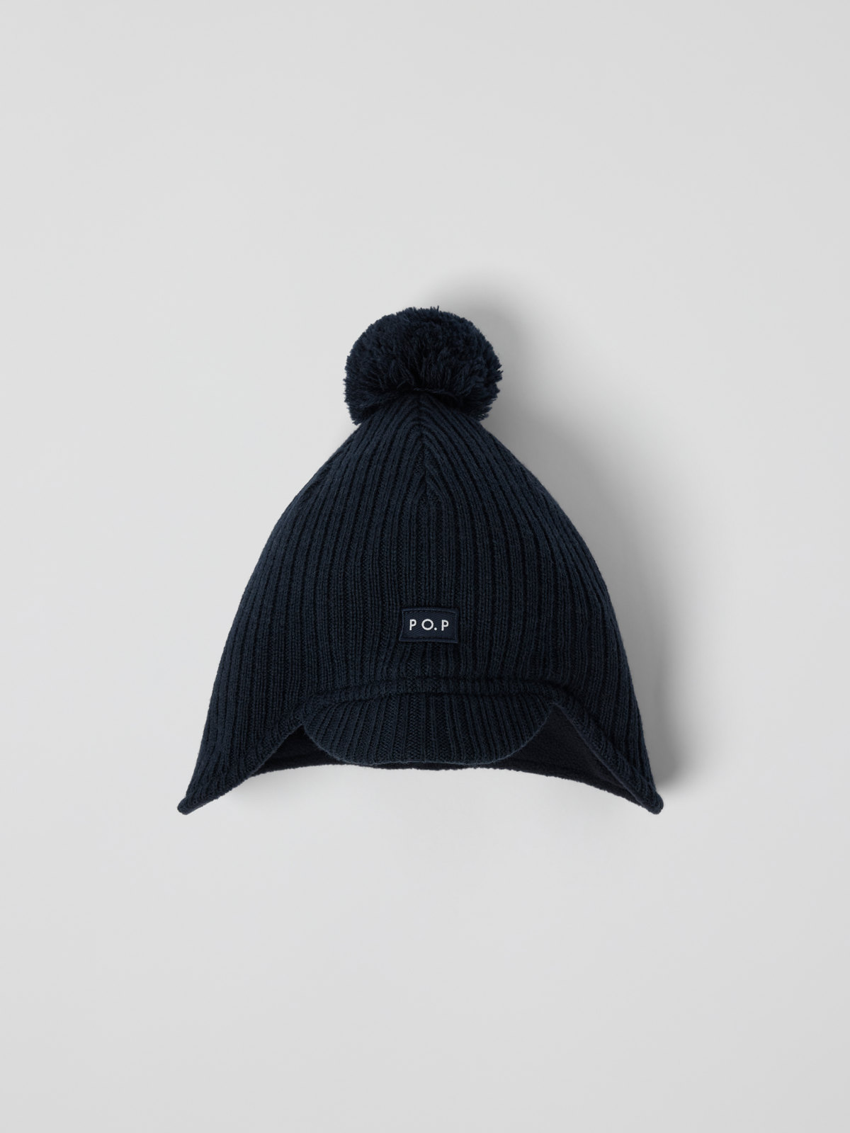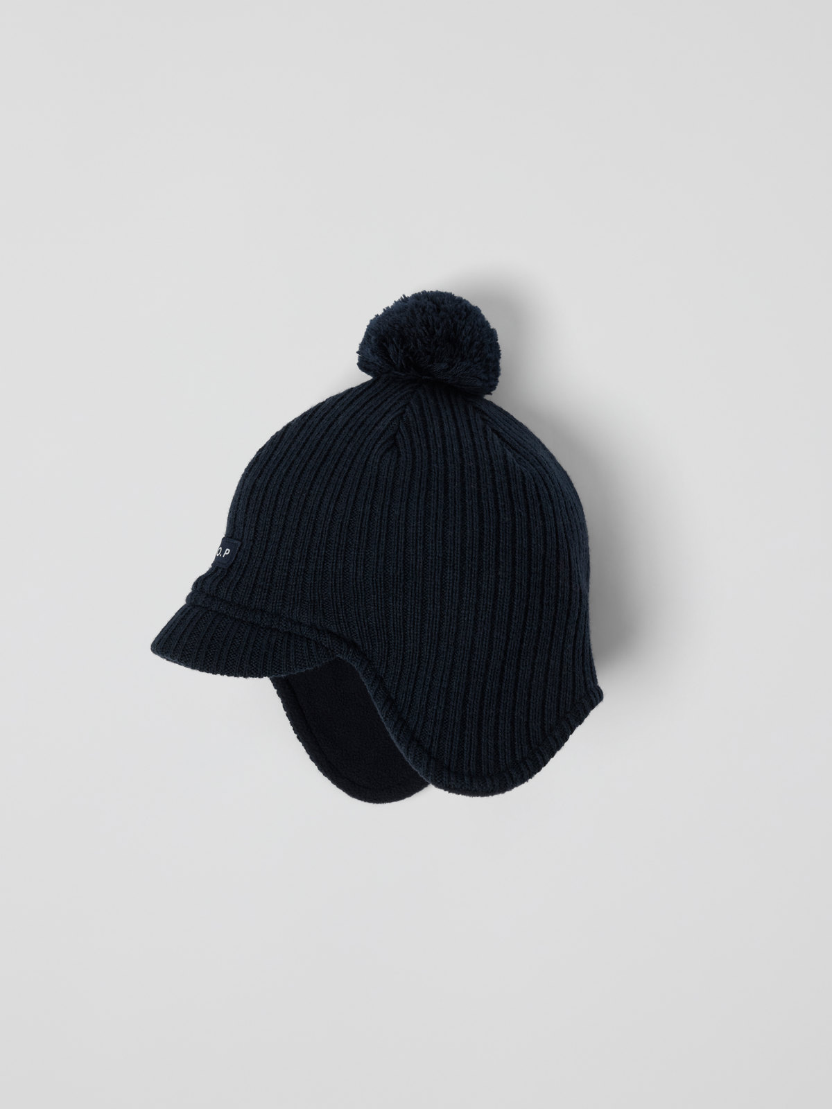 Ribbstickad mössa i varm ull med mjukt fleecefoder av återvunnen polyester. Mössan går ner ordentligt över öronen och har en skärm framtill som ger extra skydd mot väder och vind. Uppe på huvudet har mössan en dekorativ pom-pom.