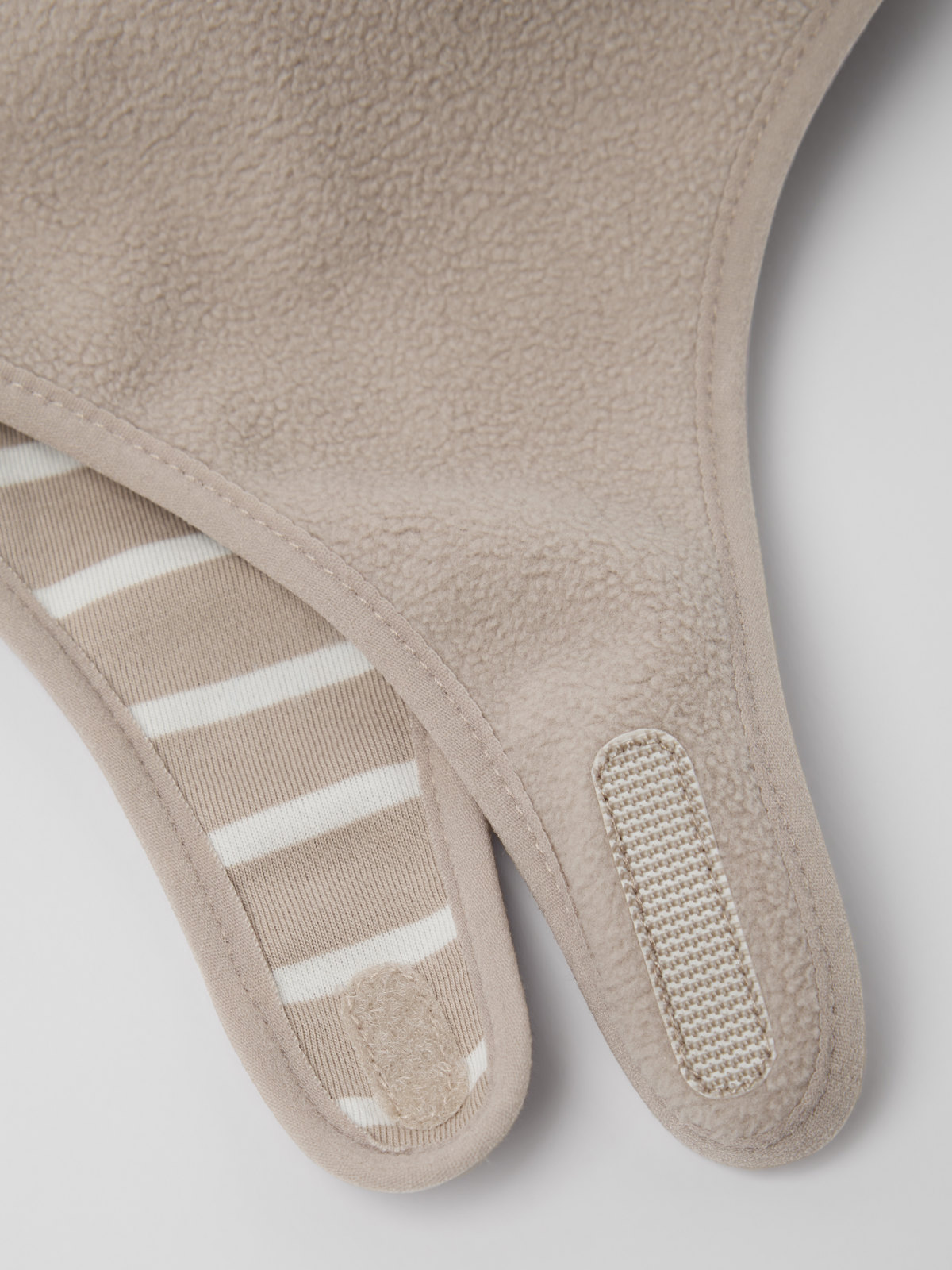 Vindtät och vattenavvisande hjälmmössa i mjuk fleece för baby. Mössan är tillverkad i återvunnen polyester och insidan är fodrad med mjuk ekologisk bomullstrikå med vår klassiska rand. Mössan stängs med kardborreband under hakan.
