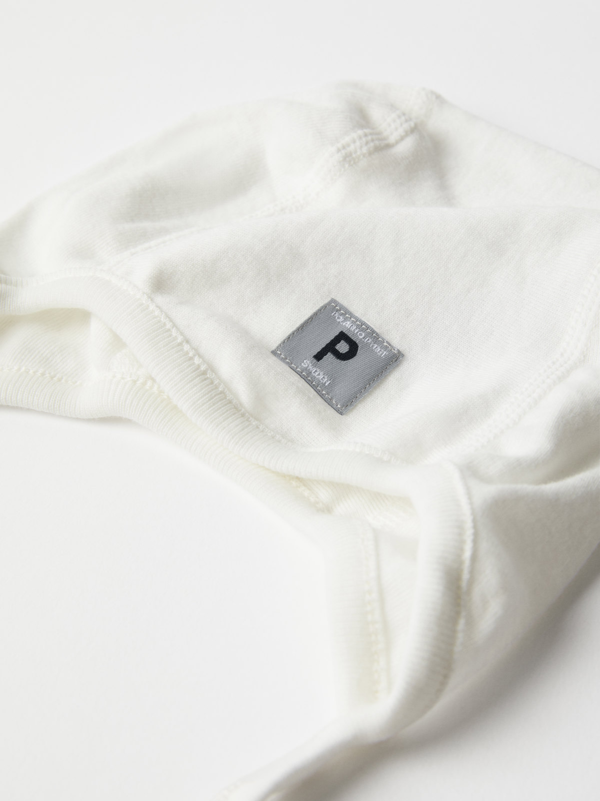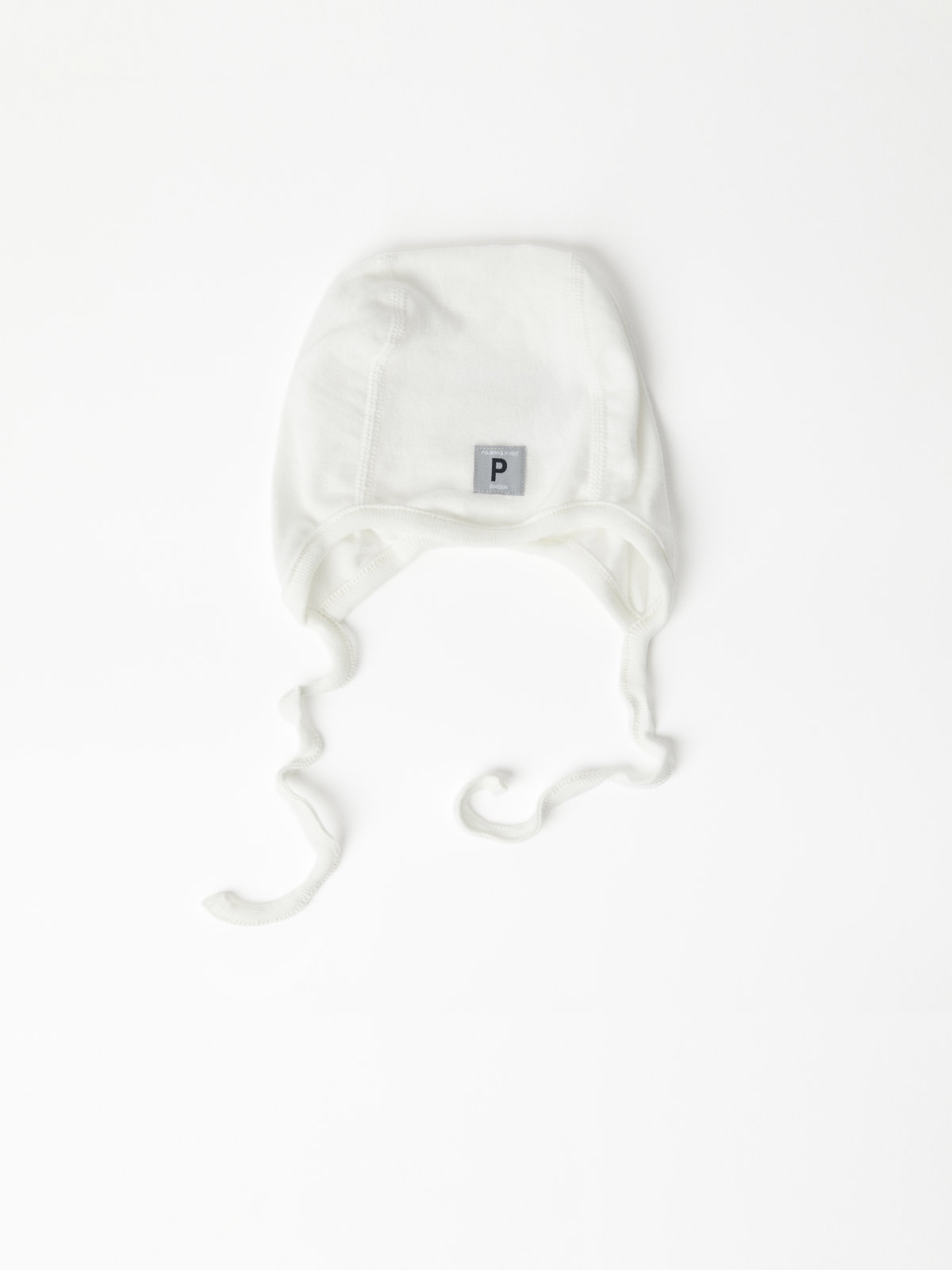 Enfärgad hjälmmössa i 100% ekologisk bomull för nyfödd. Knytbanden under hakan håller mössan på plats.