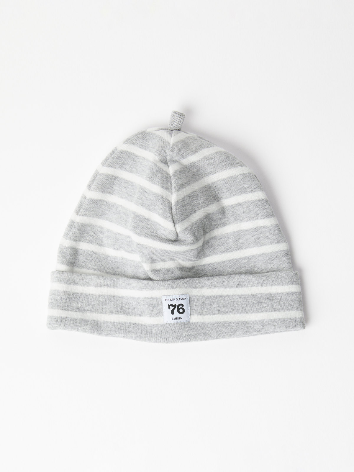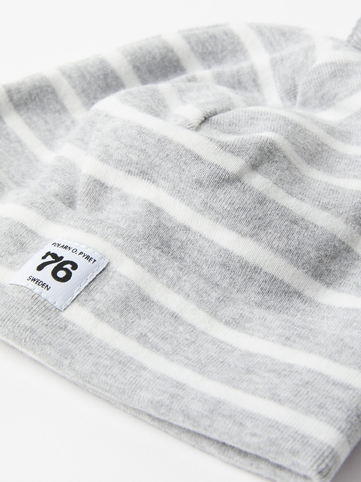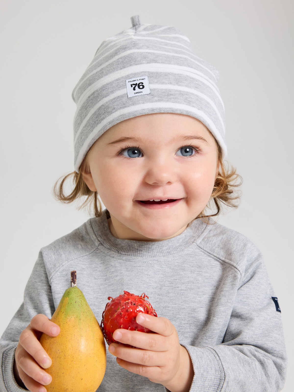 En randig mössa i 100% ekologsik bomull. Mössan har vår klassiska rand och ett uppvik som kan justeras efter huvudstorleken.