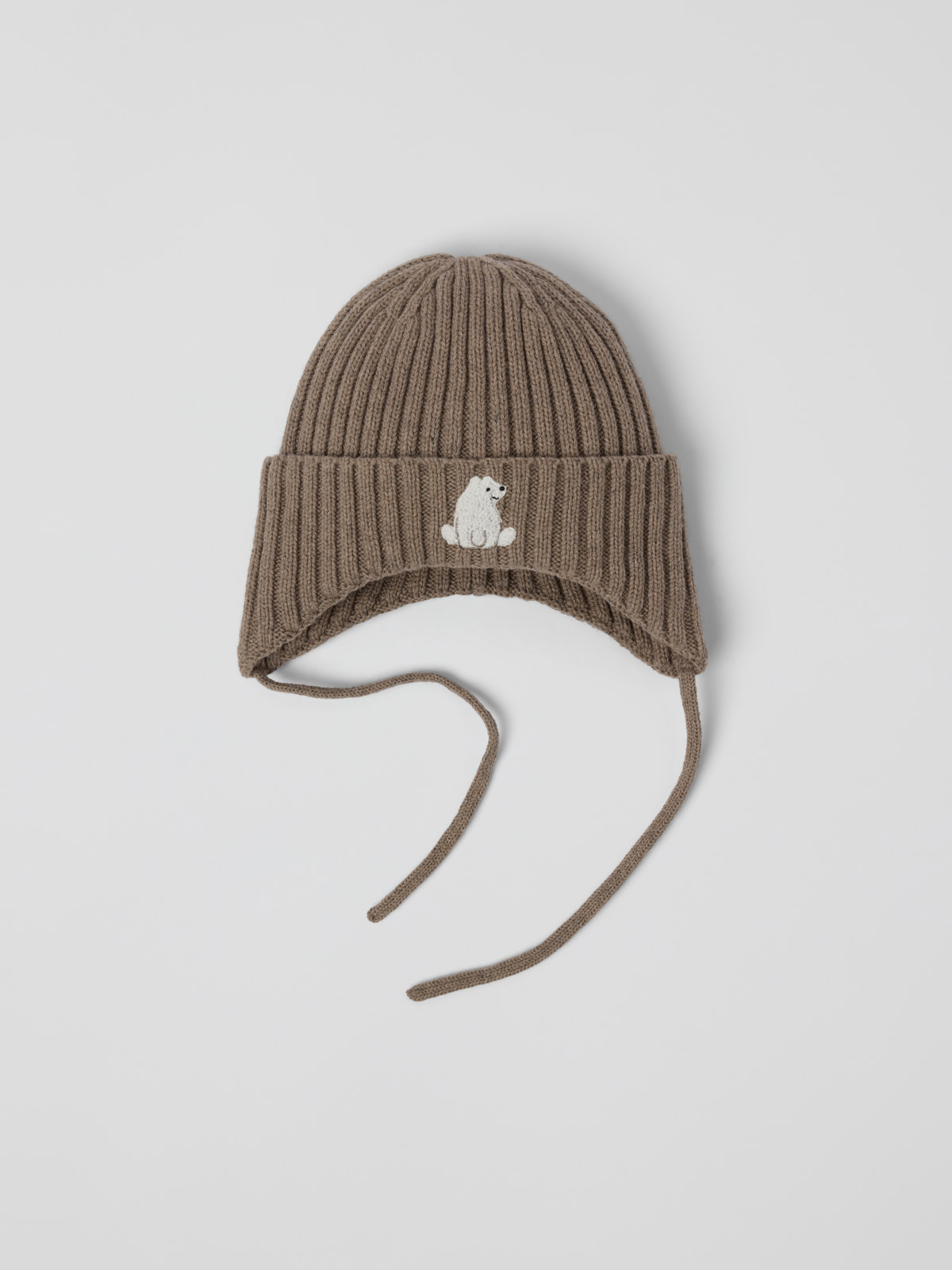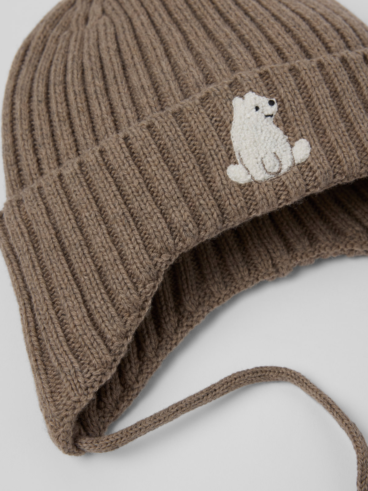 Ribbstickad mössa i mjuk och varm ull- och bomullsmix. Mössan har ett uppvik med en söt liten applikation mitt fram och går ner lite extra över öronen för extra värme och skön passform. Den hålls på plats med knytband.