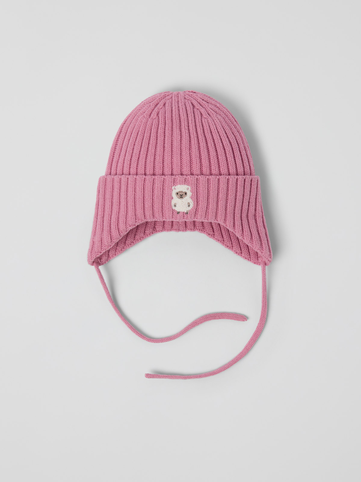Ribbstickad mössa i mjuk och varm ull- och bomullsmix. Mössan har ett uppvik med en söt liten applikation mitt fram och går ner lite extra över öronen för extra värme och skön passform. Den hålls på plats med knytband.