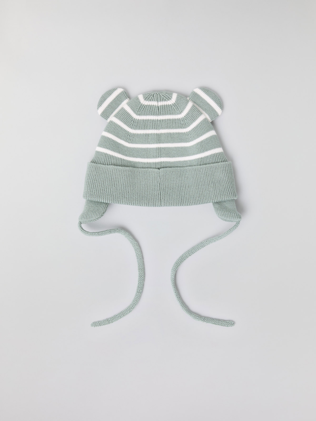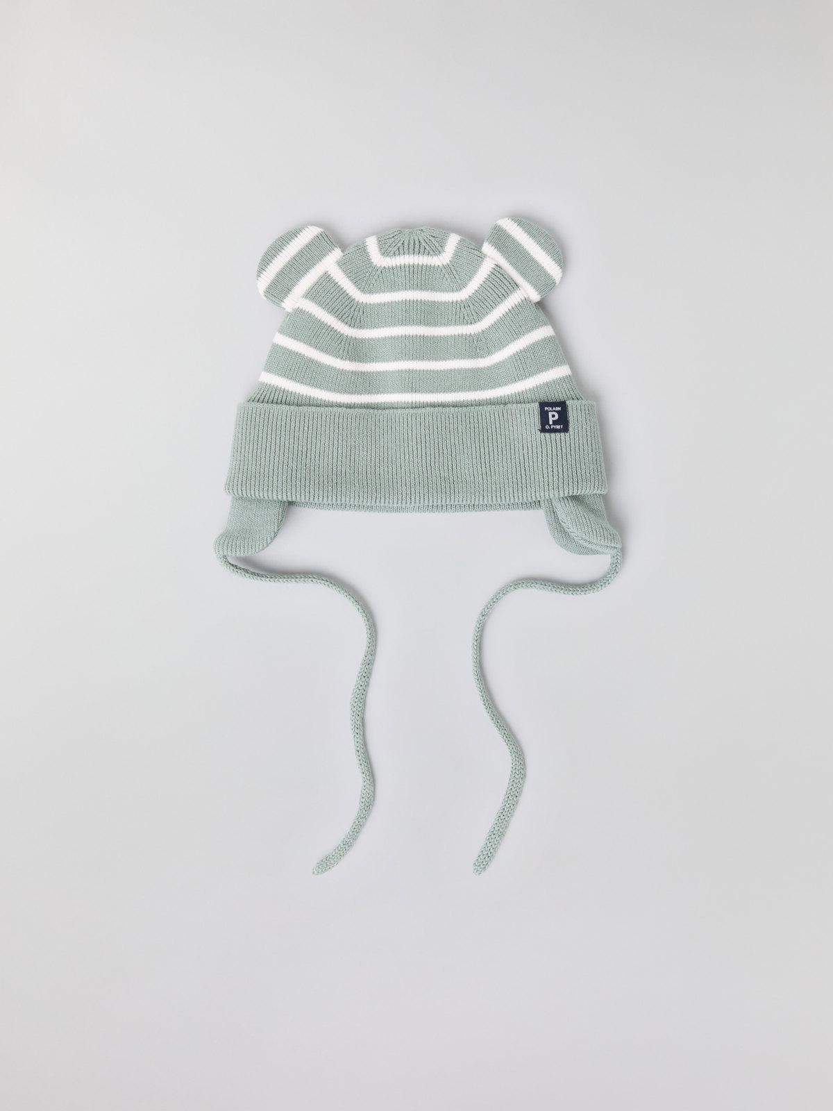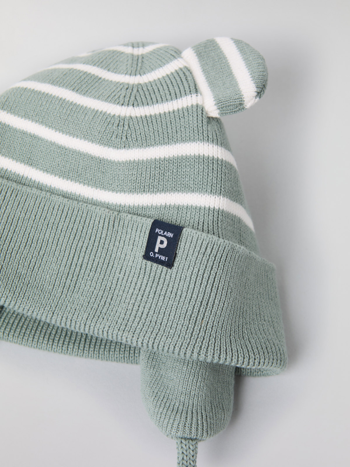Mössan har vår klassiska rand och påsydda öron. I nederkant har den en ribbad mudd samt öronlappar som håller små öron varma.