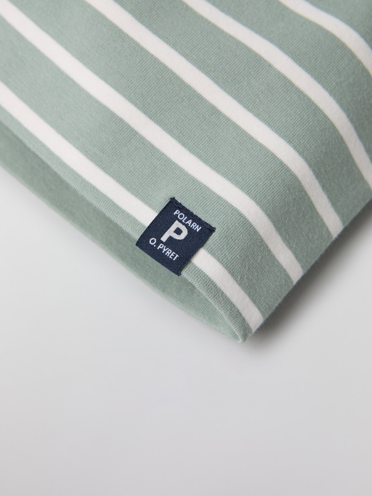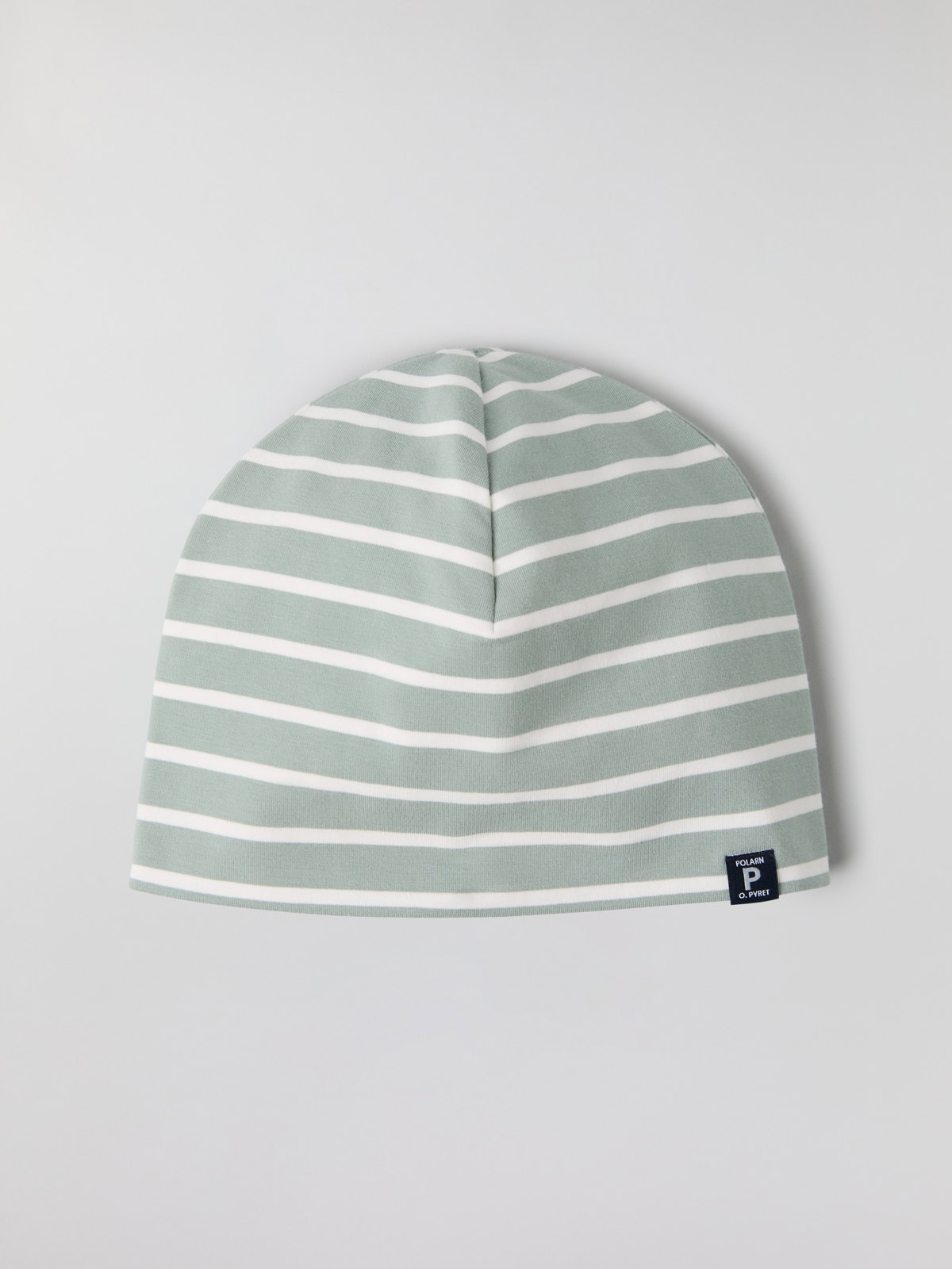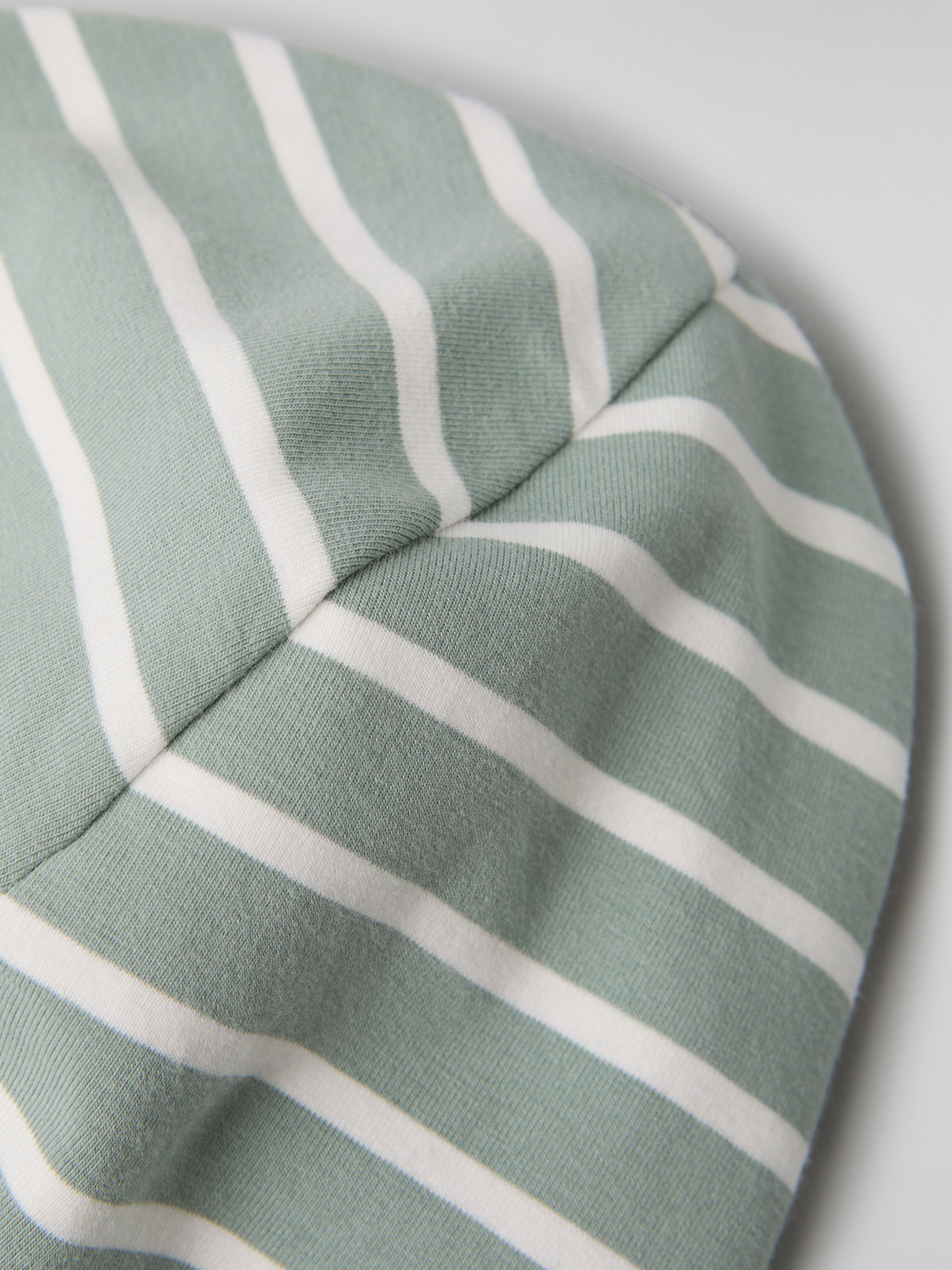 Tunn, klassiskt randig mössa i mjuk ekologisk bomullstrikå. Perfekt att ha på vårens och höstens alla utomhusaktiviteter och under hjälmen!