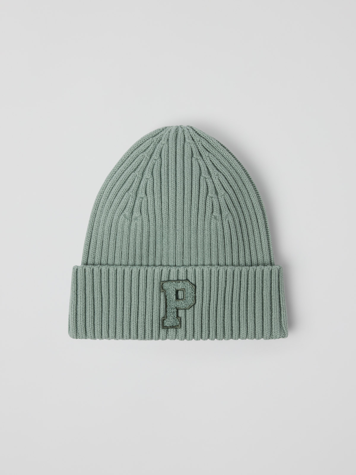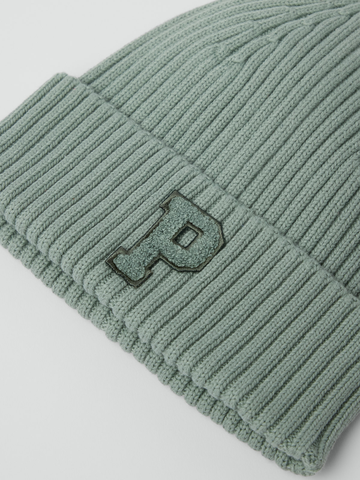 Ribbstickad mössa i ekologisk bomull – perfekt för småkyliga vårdagar. Mössan har ett uppvik i nederkant och en broderad applikation fram.