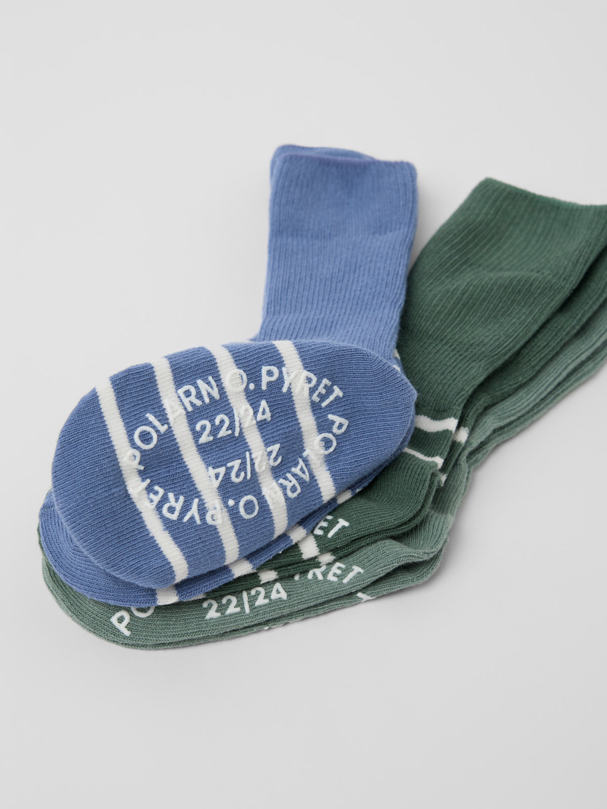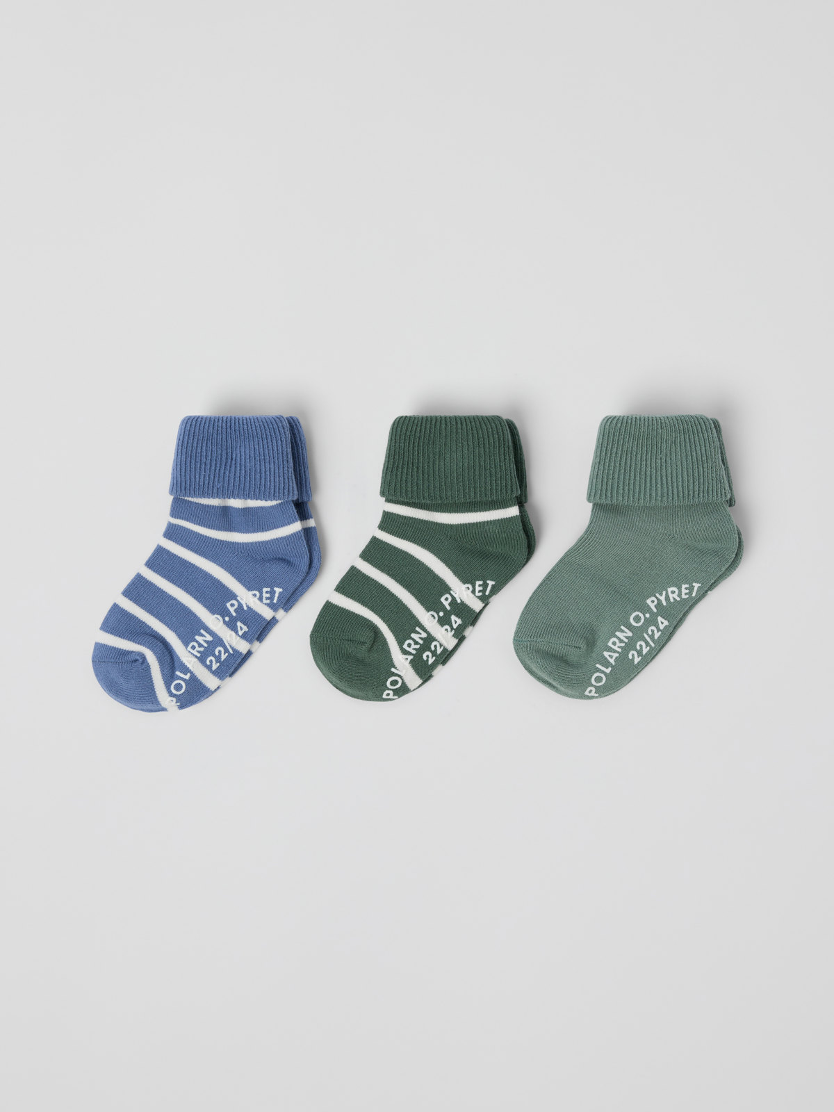 Fyll på strumplådan med ett 3-pack strumpor med halkskydd. Strumporna är gjorda i mjuk ekologisk bomull och har en mudd som kan vikas upp eller ned.