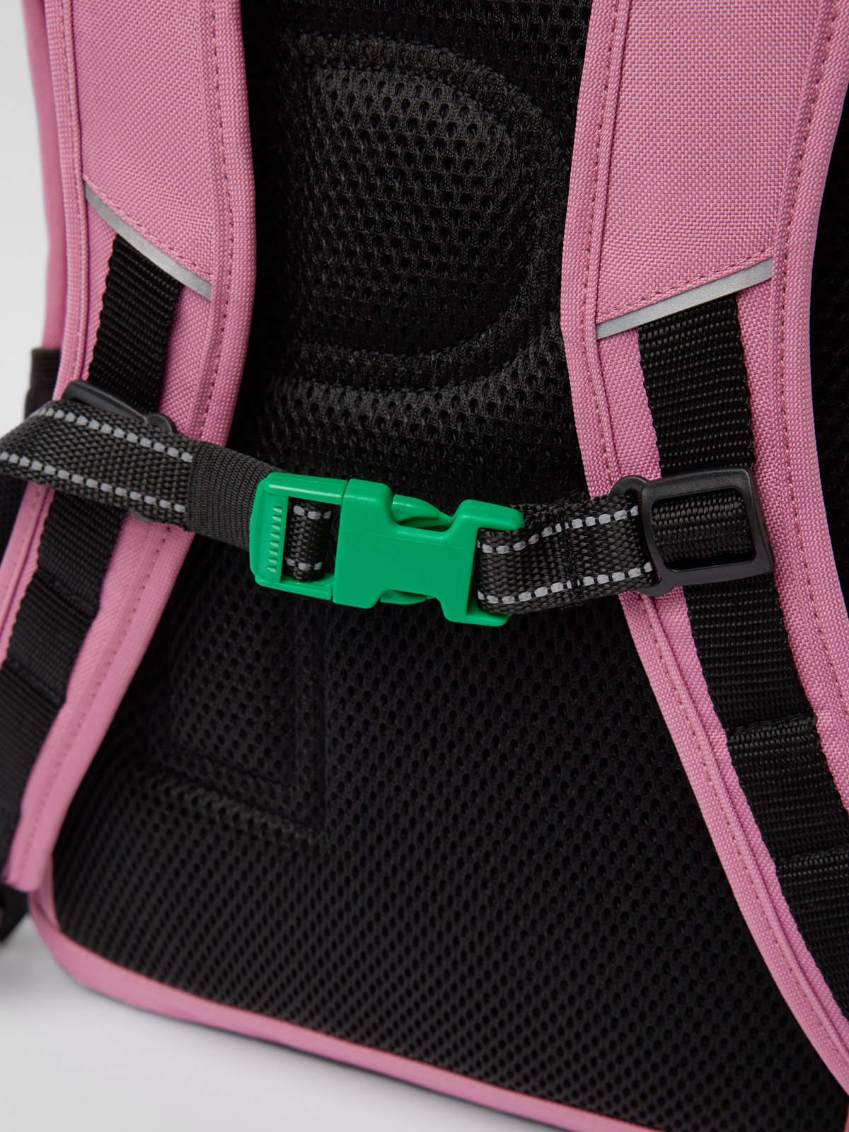 Ryggsäcken har mjuk ryggpanel i mesh och justerbar bröstrem med självutlösande spänne ifall man fastnar. Bröstremmen hjälper till att fördela vikten. Ryggsäckens mått passar A4 perfekt och har flera smarta fack både utvändigt och invändigt för alla viktiga saker, samt reflexdetaljer för god synlighet. Med en packvolym på 18 L passar den perfekt för barn i förskoleåldern och uppåt. Måttanpassat sittunderlag ingår!