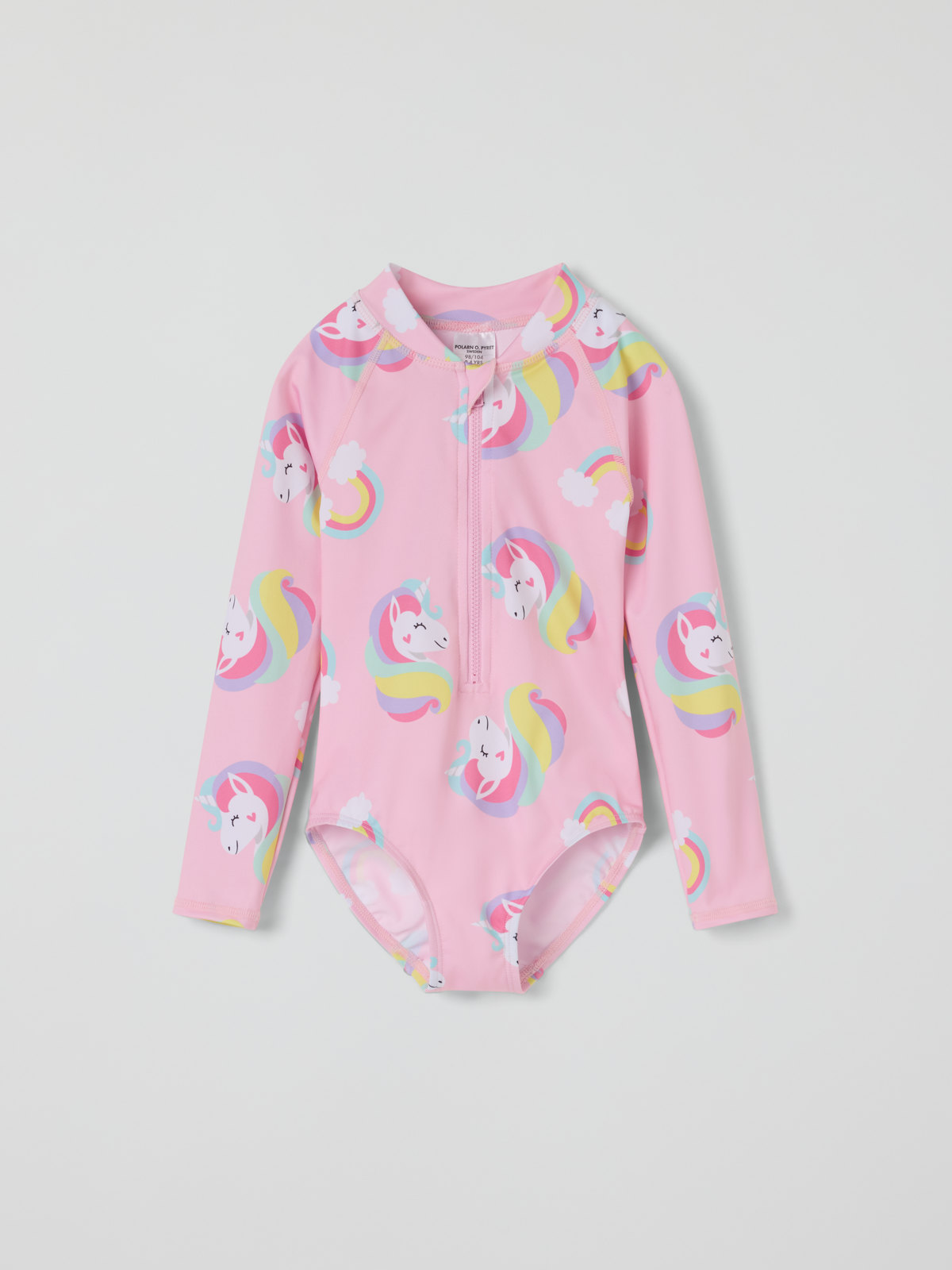 Långärmad baddräkt tillverkad i mjukt och skönt material av återvunnen polyester – perfekt för den som gillar att bada länge! Baddräkten har en smart dragkedja fram och är helmönstrad med enhörningar.