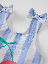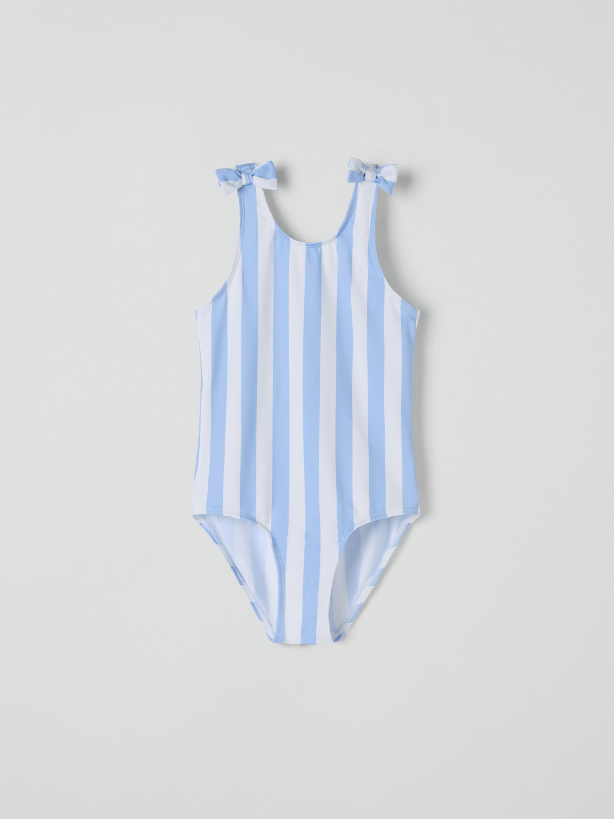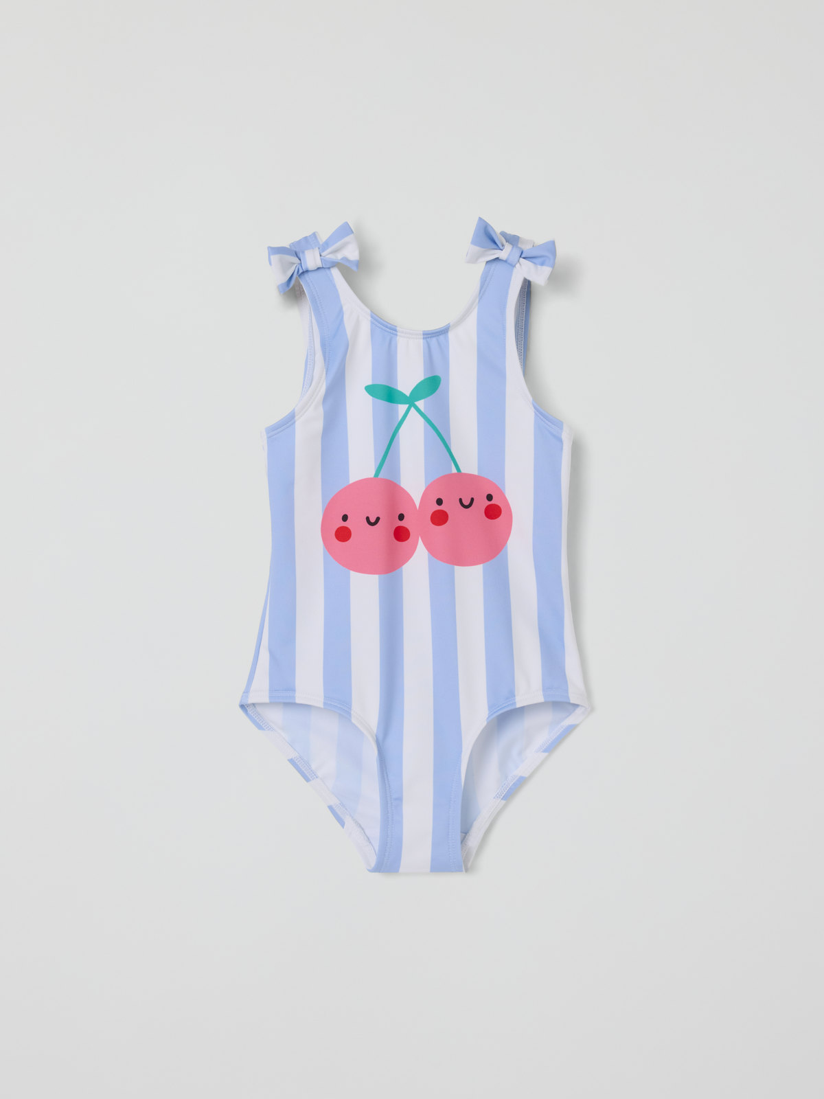 Randig baddräkt tillverad i mjukt och skönt material av återvunnen polyester. Baddräkten har ett stort tryck med körsbär på framstycket och dekorativa knutar på axelbanden. Den har fodrad gren och är sydd med extra mjuka sömmar som inte skaver.