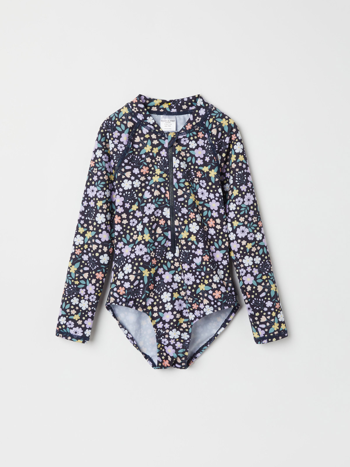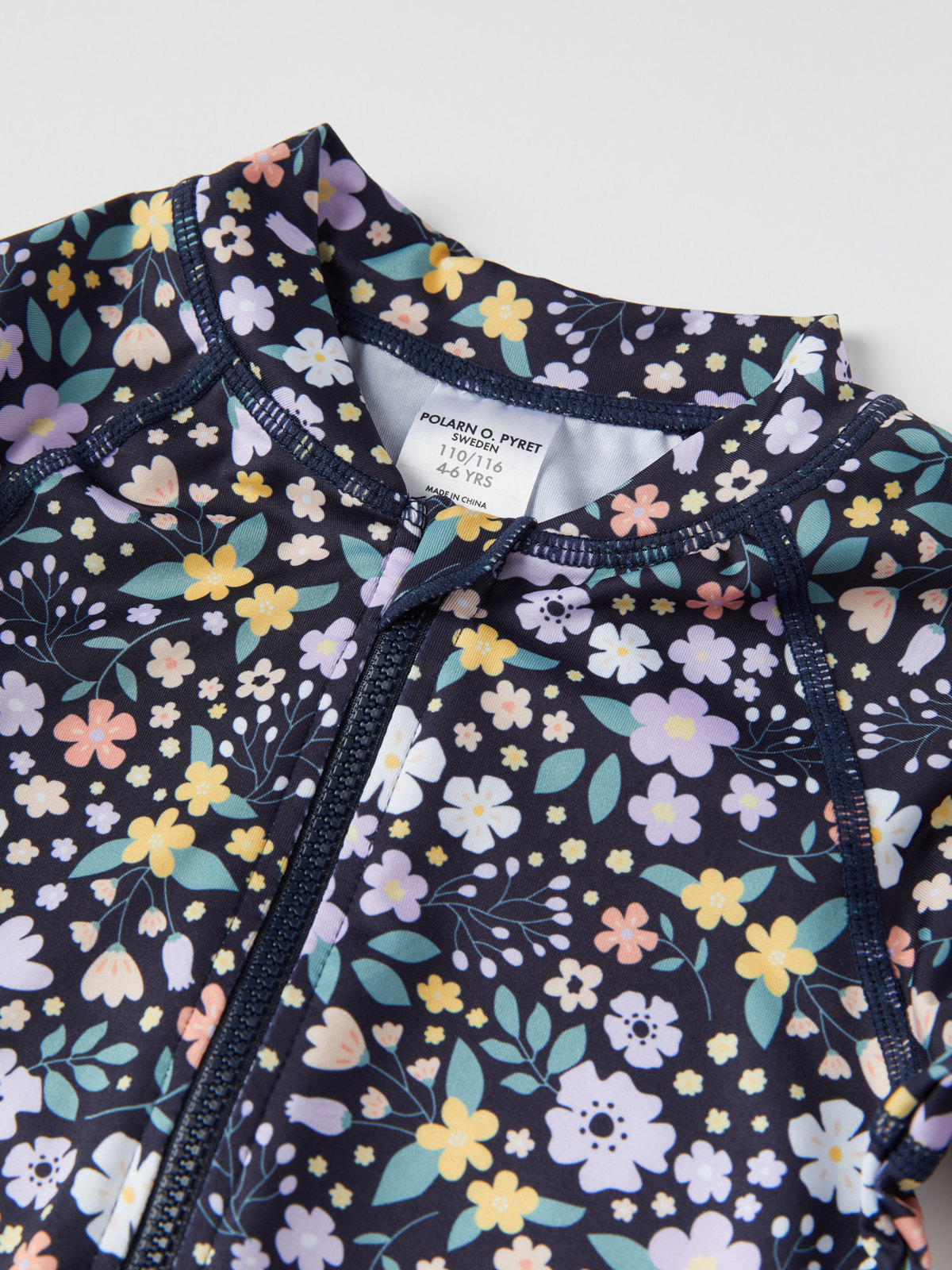 Långärmad baddräkt i 100 % återvunnen polyester. Baddräkten har en smart dragkedja fram och är helmönstrad med blommor.