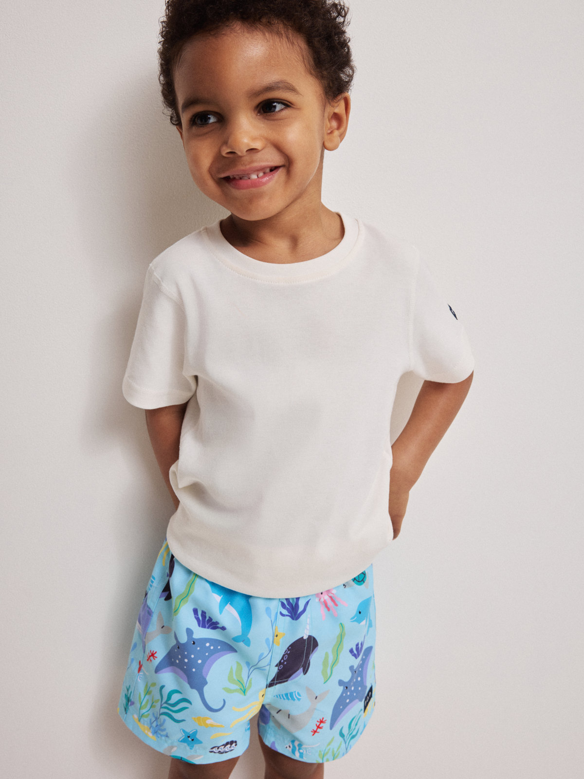 Badshorts med elastisk midja och knytband, tillverkade av återvunnen polyester. Shortsen har en innerbyxa i mjuk mesh och en ficka bak.