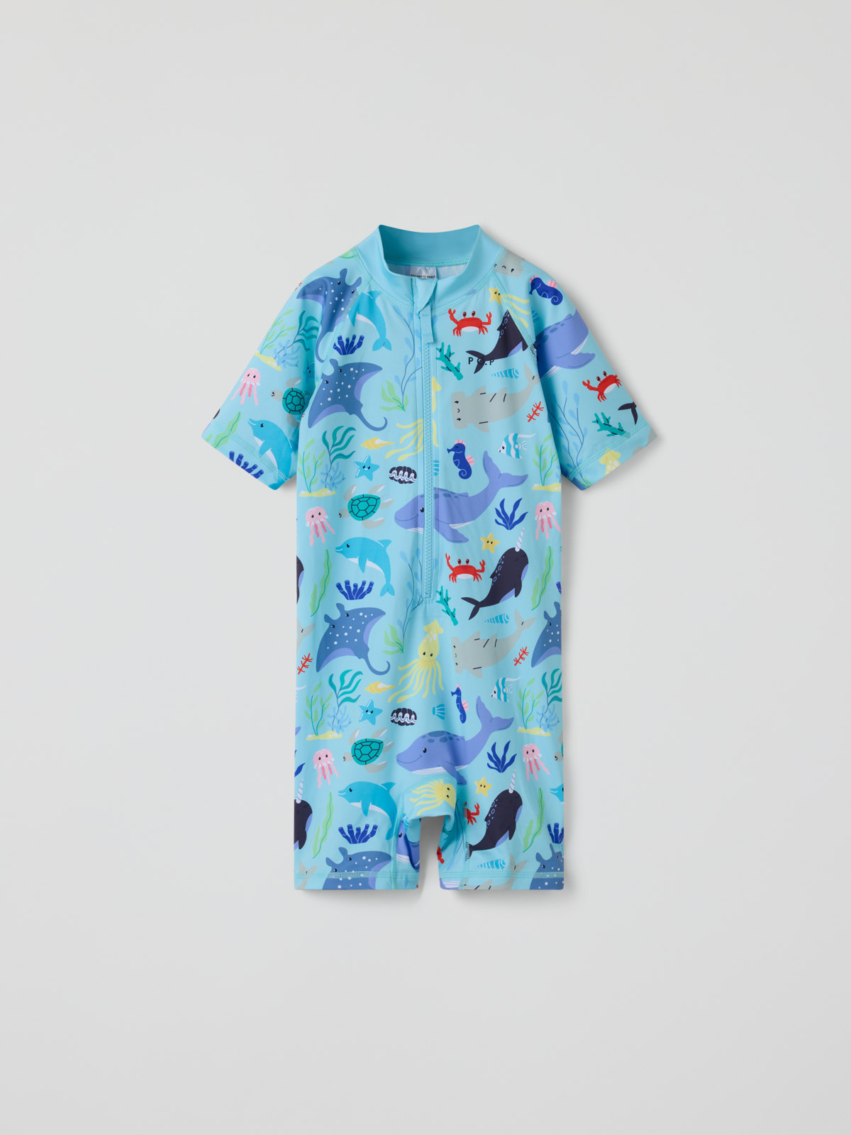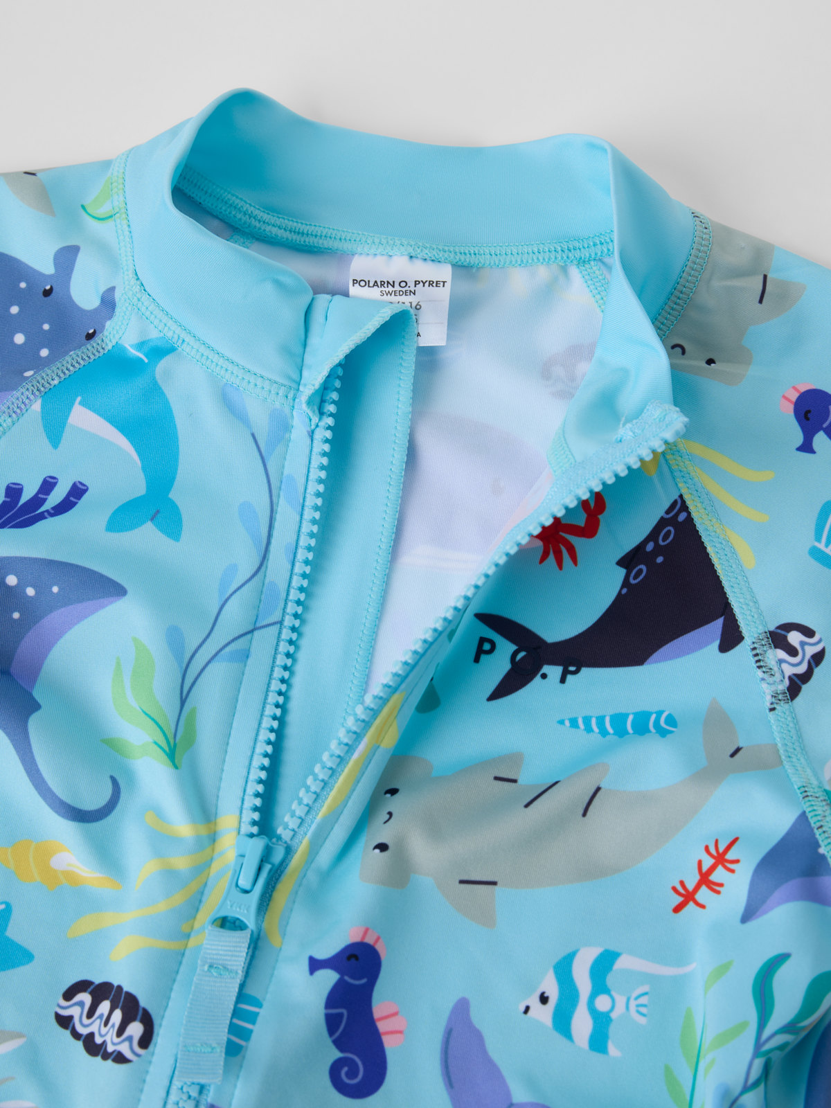 UV-dräkt med UPF 50 tillverkad i mjukt och skönt material av återvunnen polyester. UV-dräkten är sydd med extra mjuka sömmar som inte skaver. Dragkedjan fram gör den lätt att ta på och av och har ett skydd högst upp för att inte skava mot haka och kind.