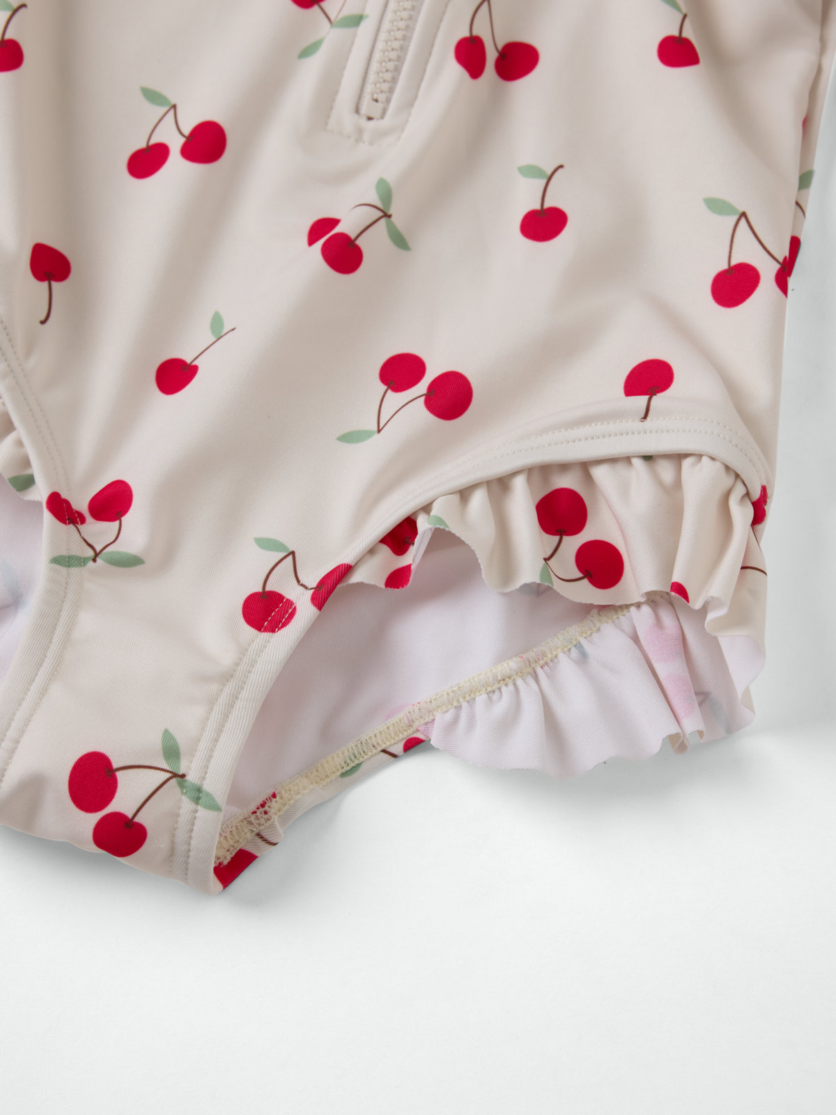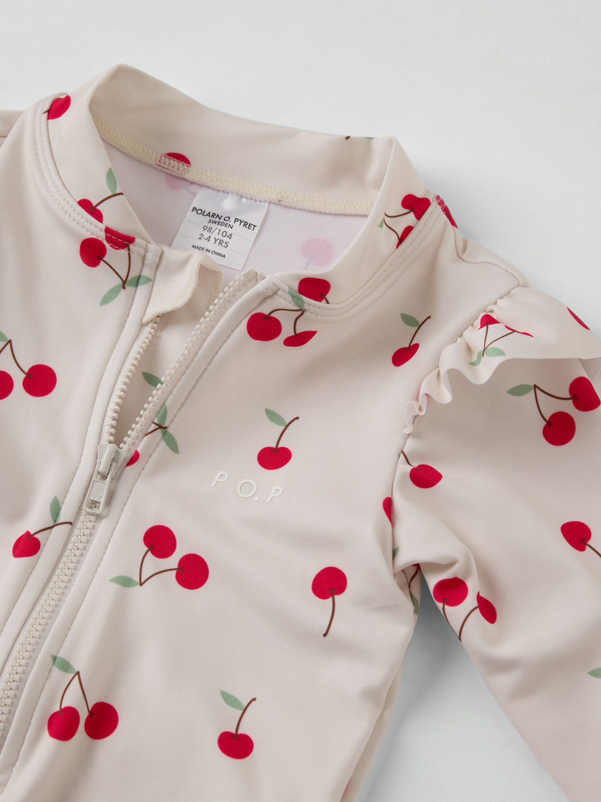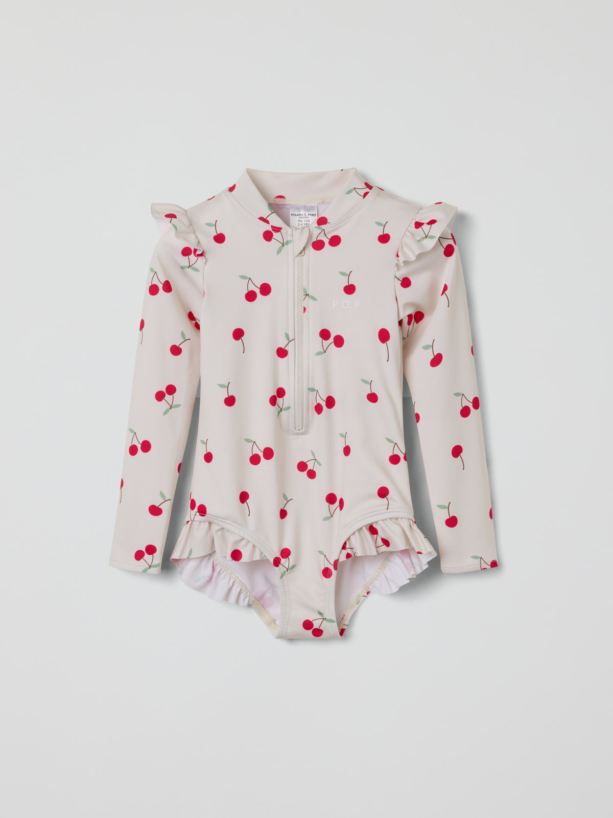 Långärmad baddräkt tillverkad i mjukt och skönt material av återvunnen polyester – perfekt för den som gillar att bada länge! Baddräkten har en smart dragkedja fram och är helmönstrad med körsbär. Den har söta volanger över axlar och ben.
