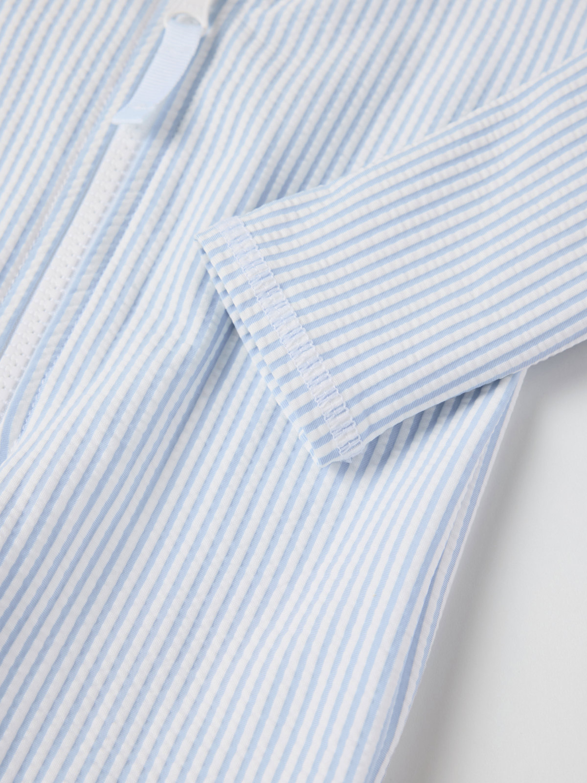 Randig långärmad UV-dräkt med UPF 50, tillverkad i mjukt och skönt material av återvunnen polyester och sydd med extra mjuka sömmar som inte skaver. Dragkedjan fram gör den lätt att ta på och av och har ett skydd högst upp för att inte skava mot haka och kind.