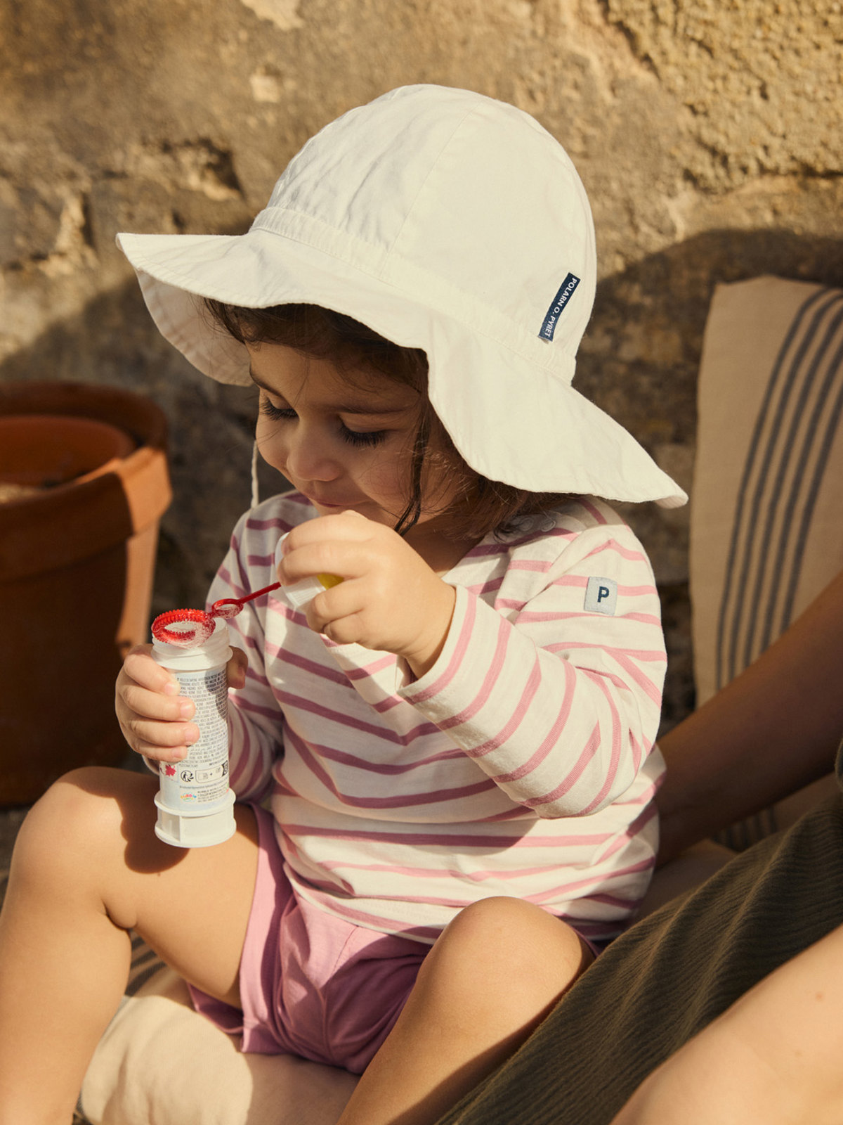 Solhatt i 100 % ekologisk bomull med UV-skydd UPF 50 – ett måste för de små i solen! Solhatten har ett band kring huvudet som går att justera och knyta. Knytbandet under hakan håller solhatten på plats.