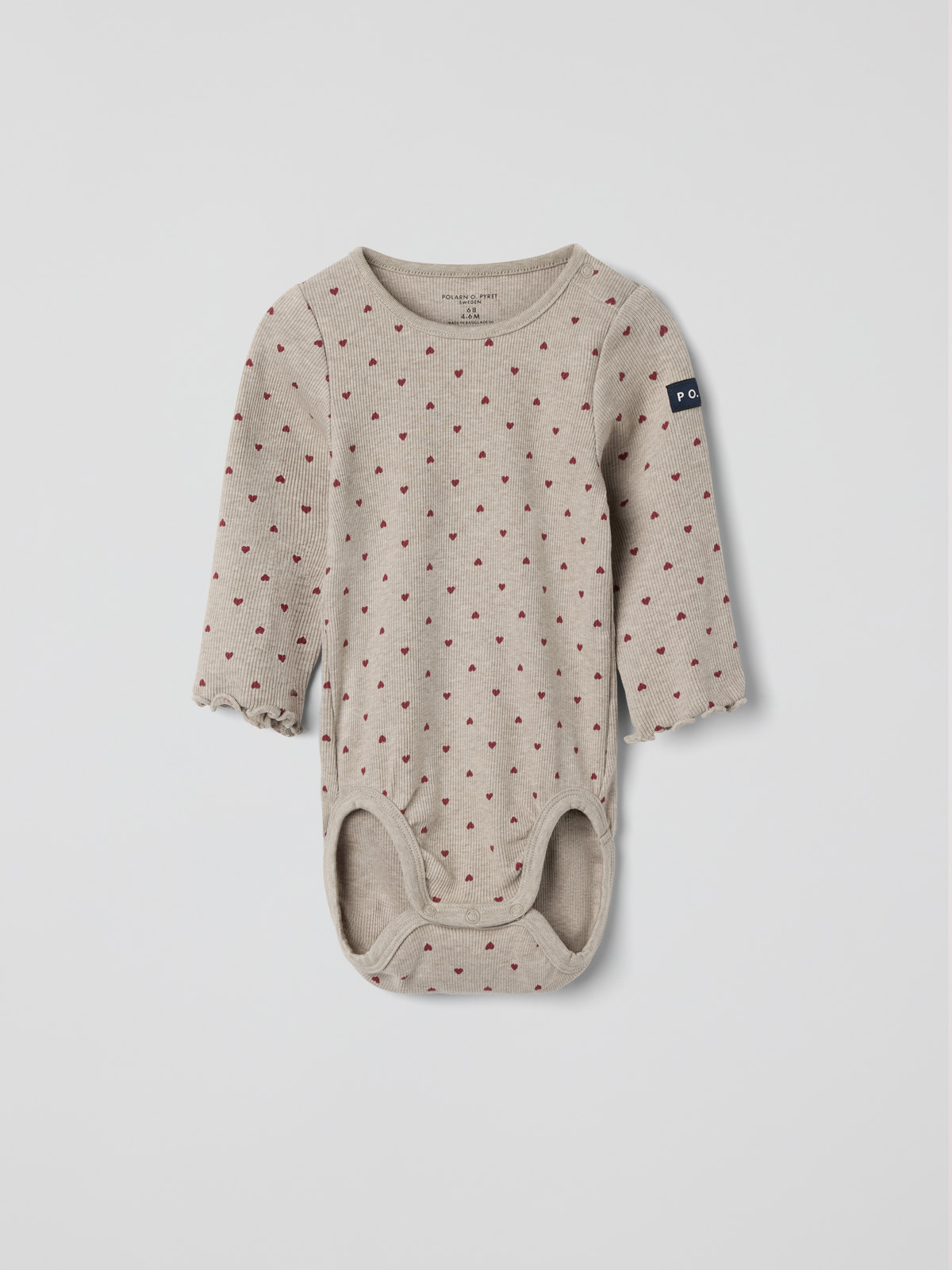 Ribbad body i tunn, ekologisk bomull för baby. Bodyn är sydd med extra mjuka, platta sömmar som inte skaver mot känslig hud och har söt krusad uddkant i ärmslut. Tryckknapparna på ena axeln och i grenen underlättar klädbyten.