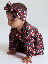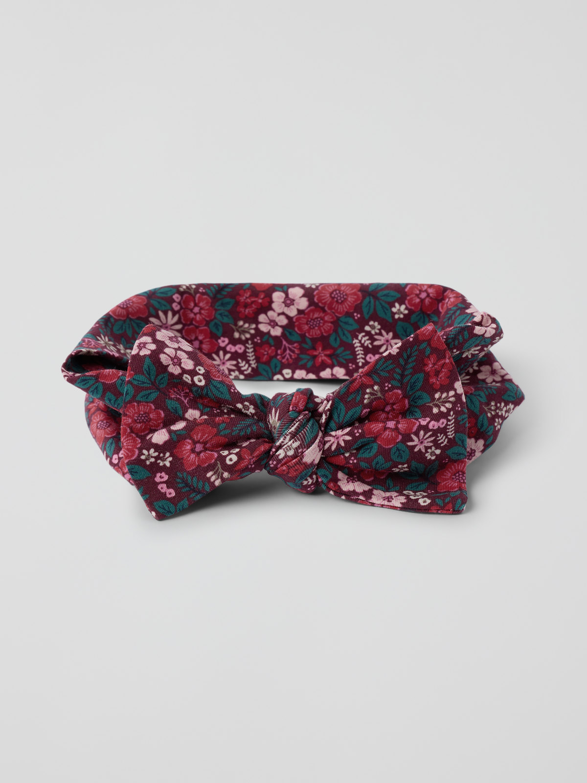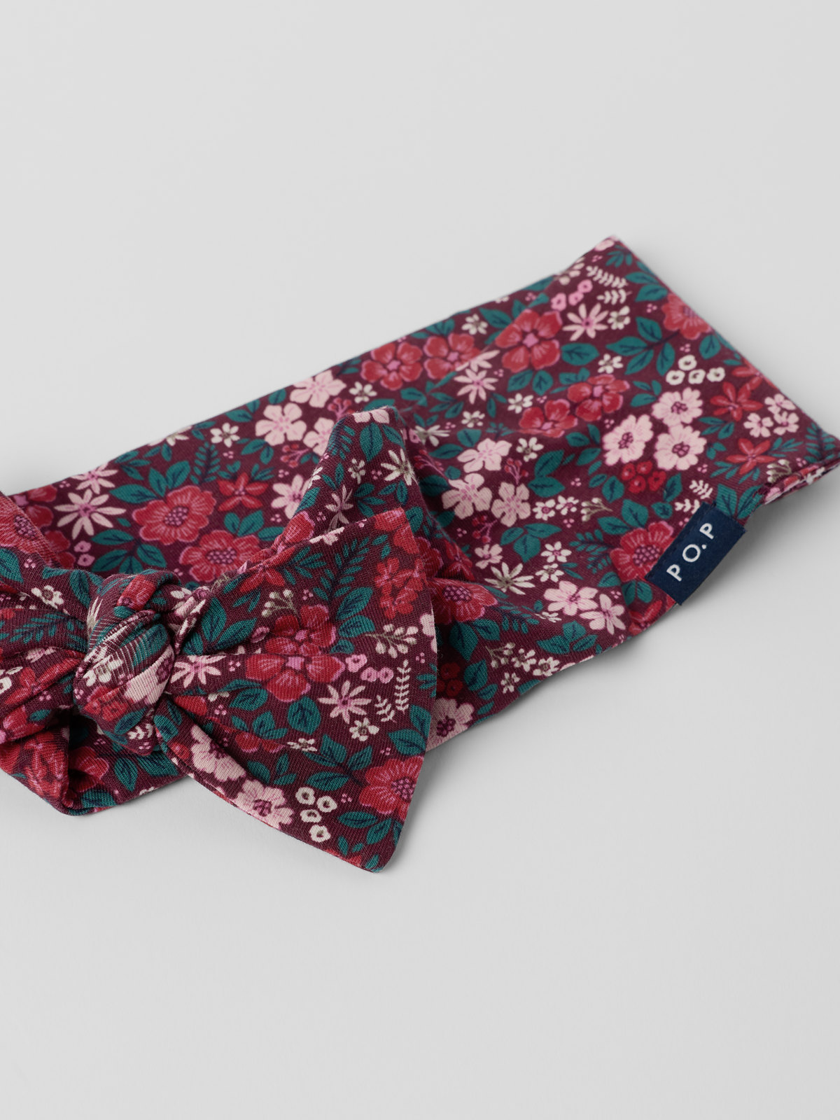 Elastiskt hårband i mjuk ekologisk bomullstrikå. Hårbandet är helmönstrat med blommor och prytt med fin rosett.
