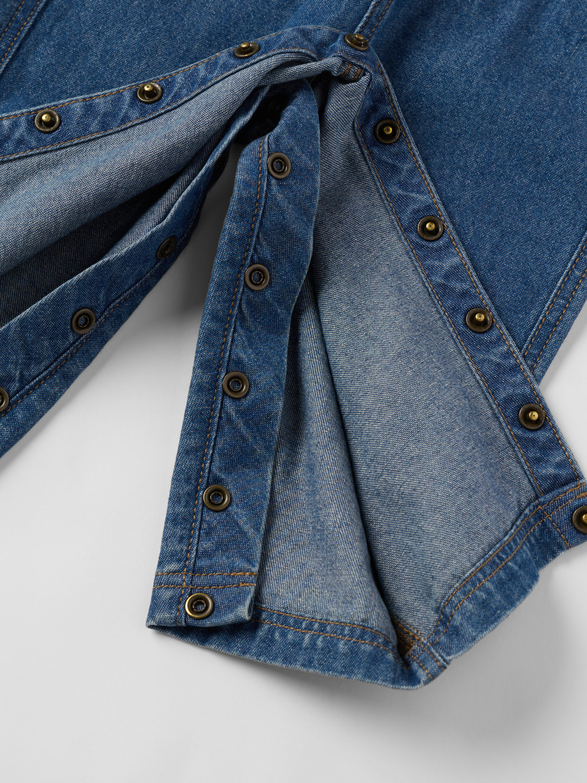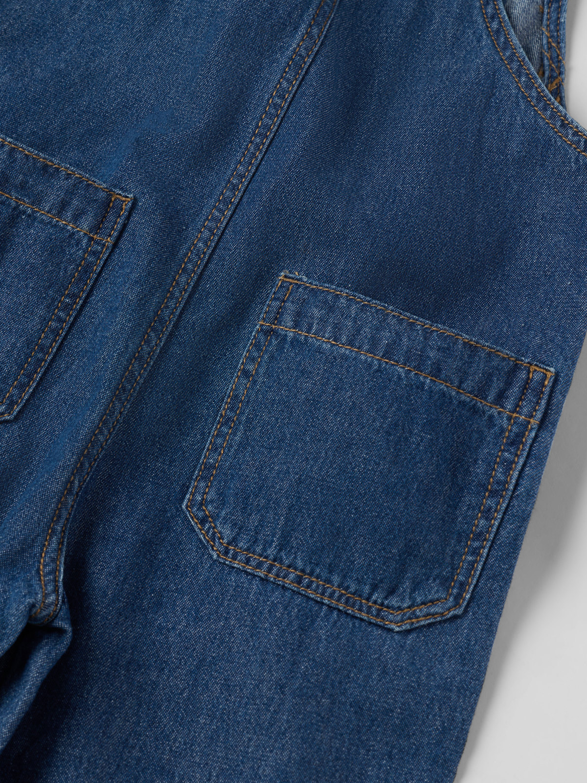 Hängselbyxa i mjuk och tunn denim – en riktig höstfavorit! Byxan har raka ben, justerbara hängslen med spännen fram och knappar i sidorna för smidig av- och påtagning. Den har även en bröstficka fram samt två fickor bak. Knapparna i grenen underlättar klädbyten.