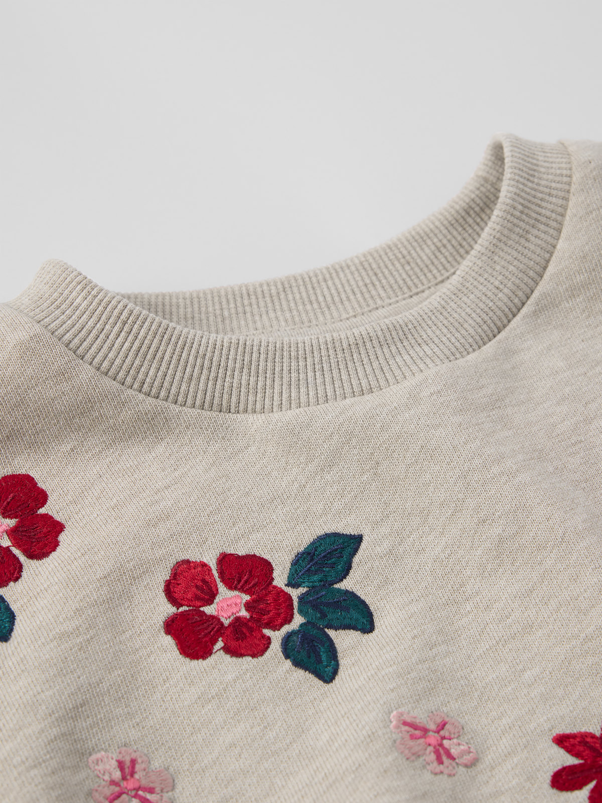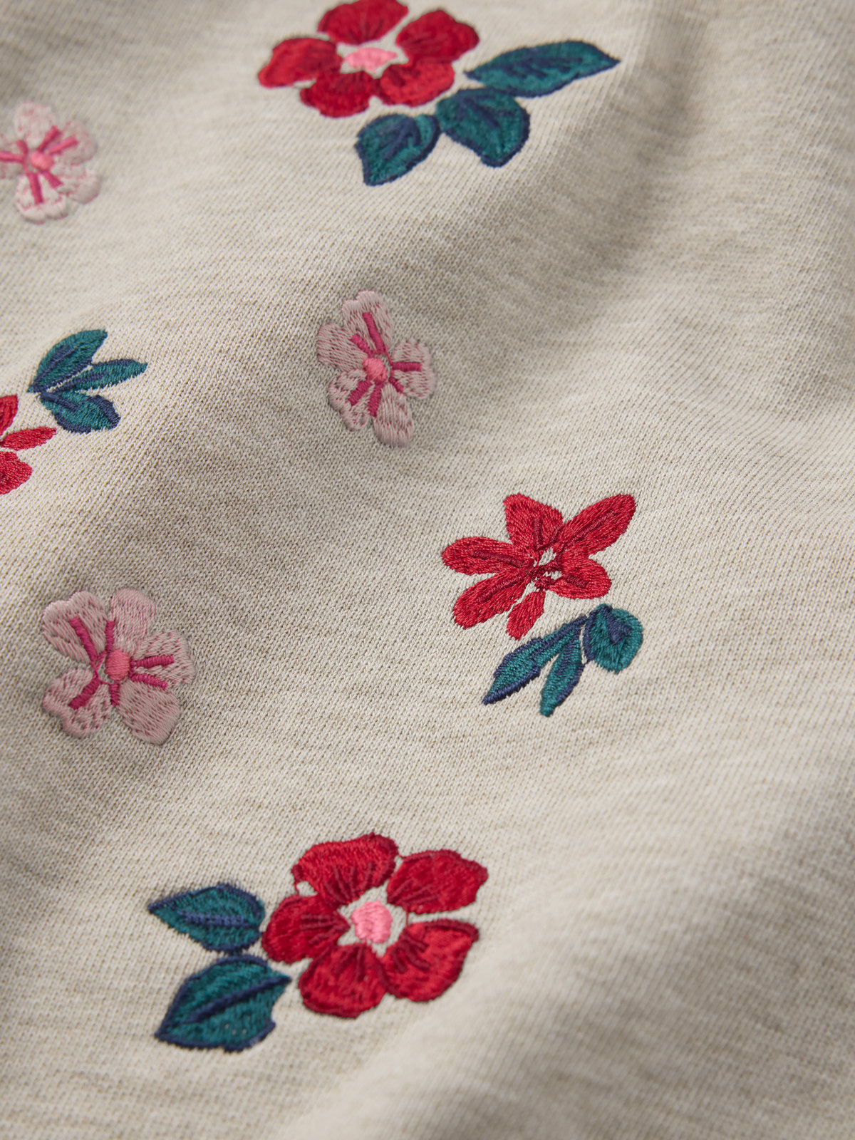 Tröja i 100 % ekologisk bomull med mjuk sweatshirtkvalitet. Tröjan har fin brodyr med blommor på framstycket och mjuka muddar i hals, ärmslut och nederkant för skön passform.