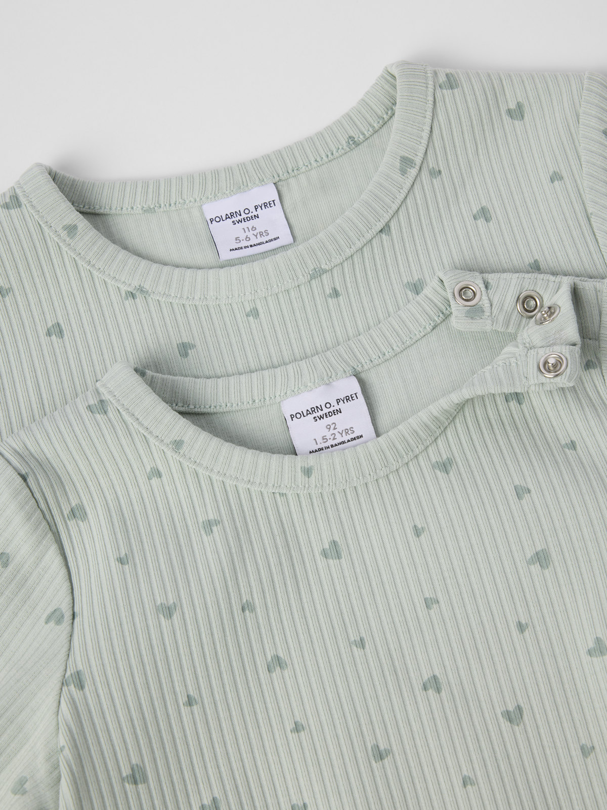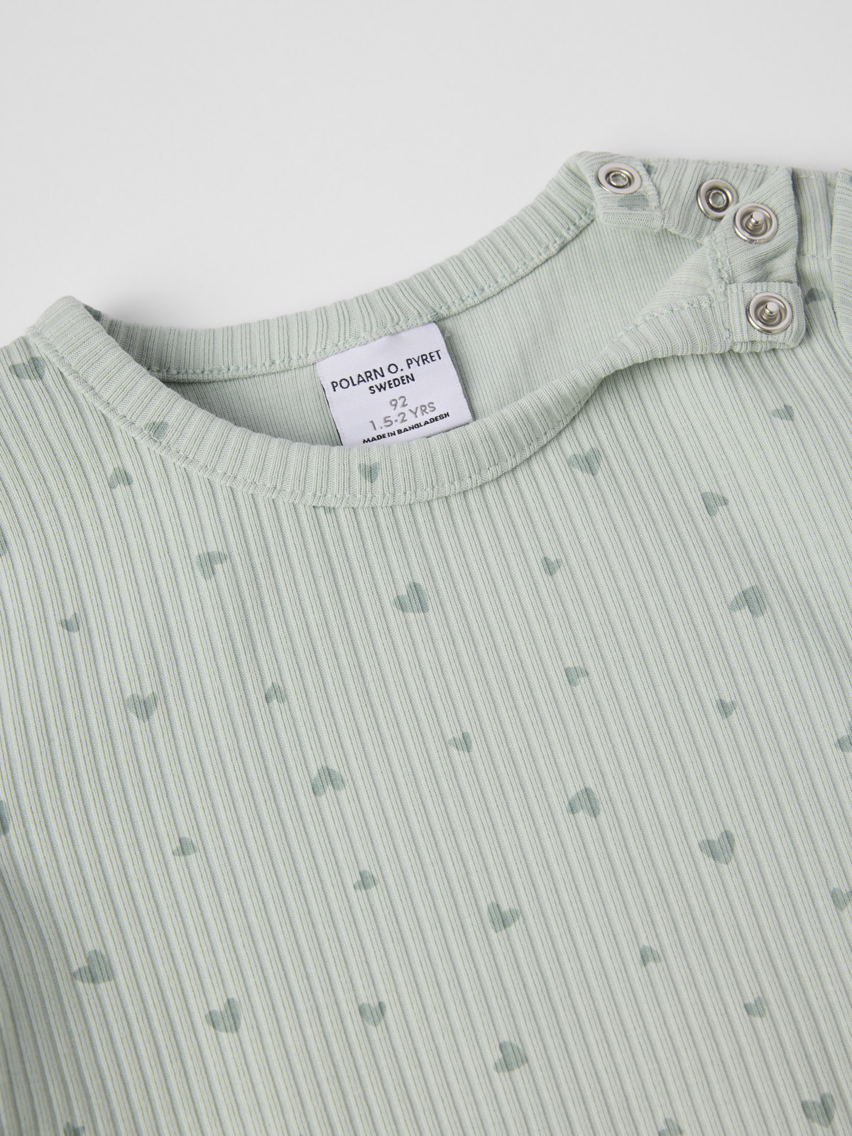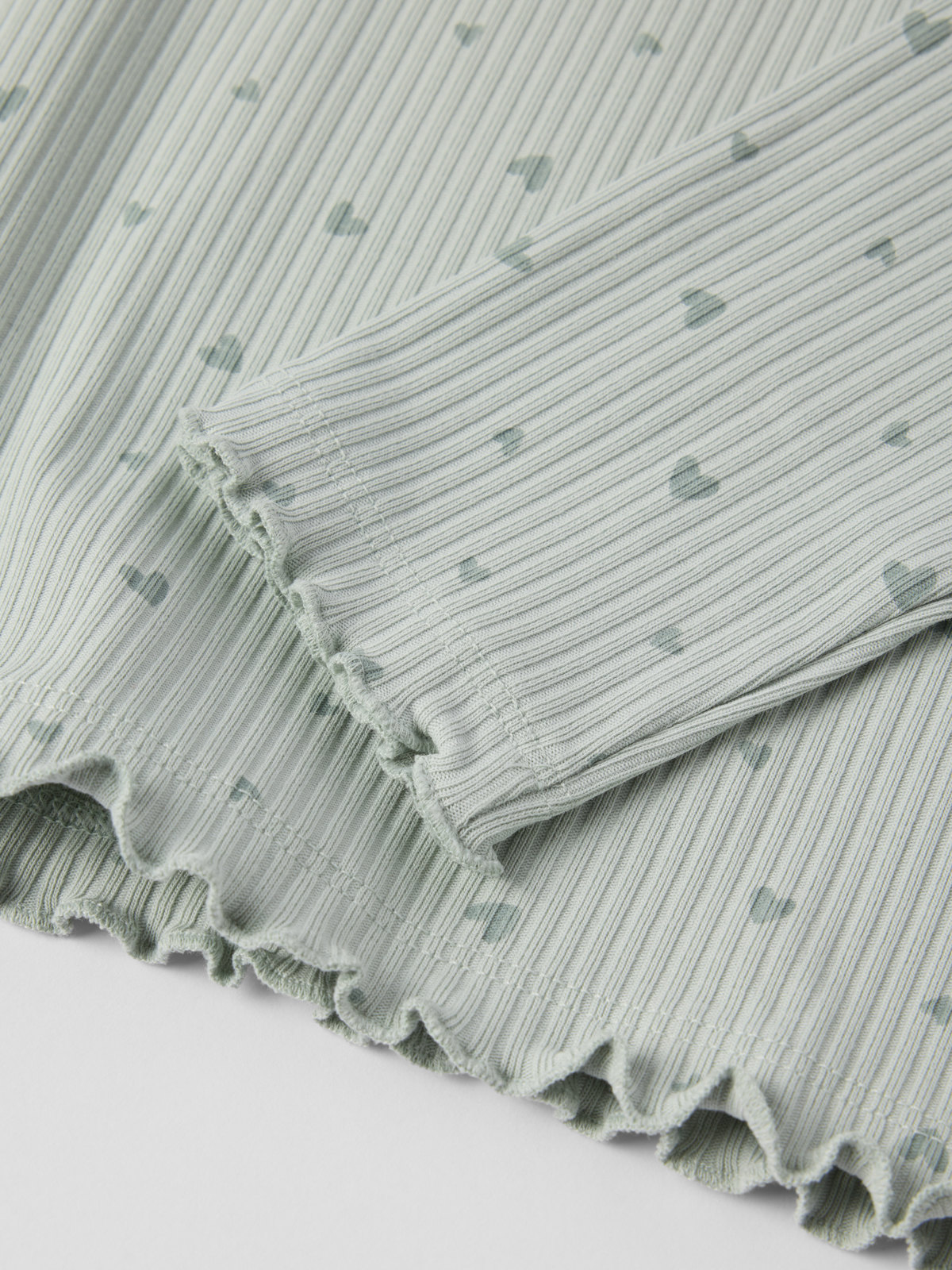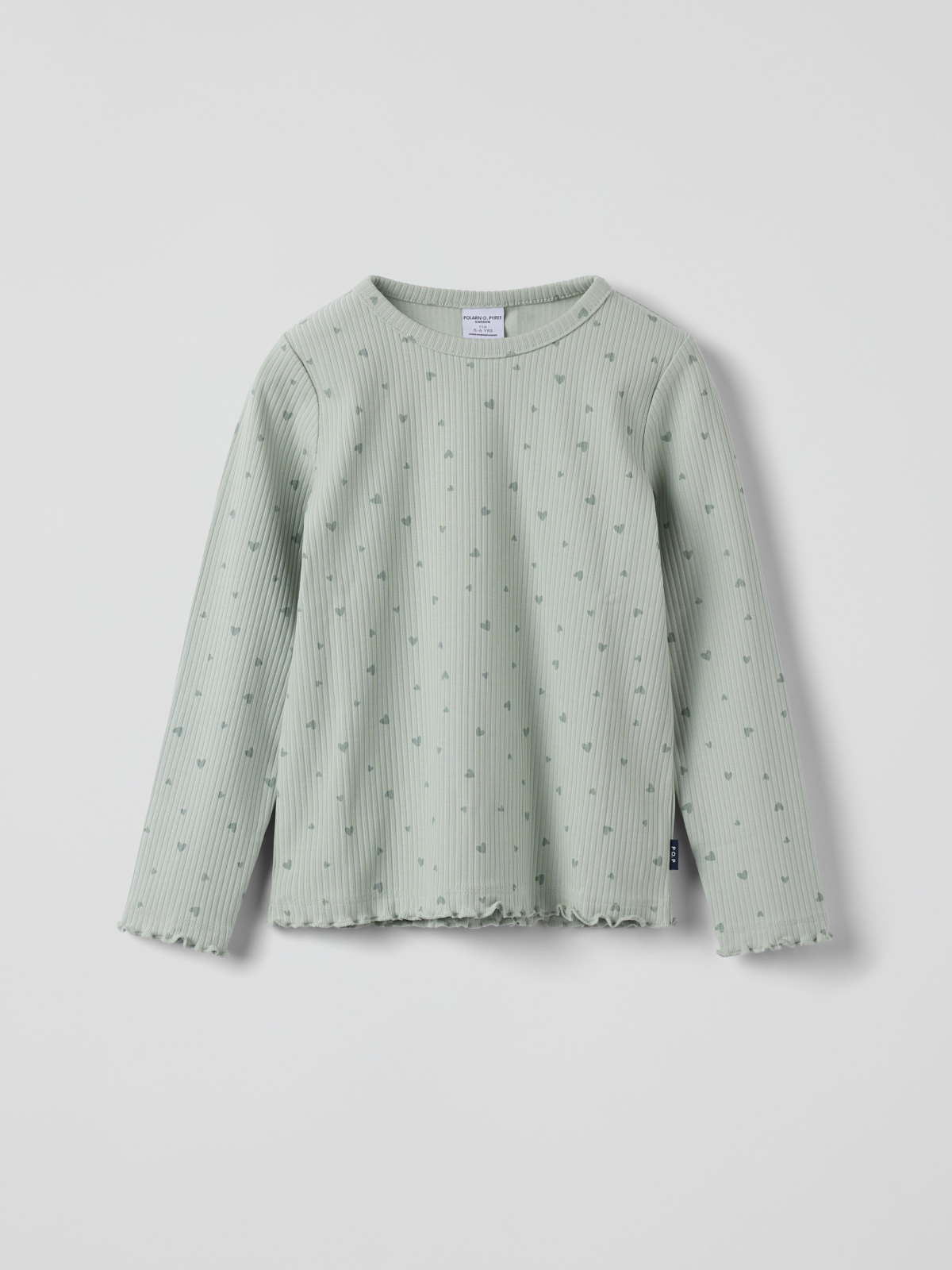 Ribbad topp i mjuk ekologisk bomull – perfekt för alla tillfällen! Toppen har söt krusad uddkant vid ärmslut och i nederkant.