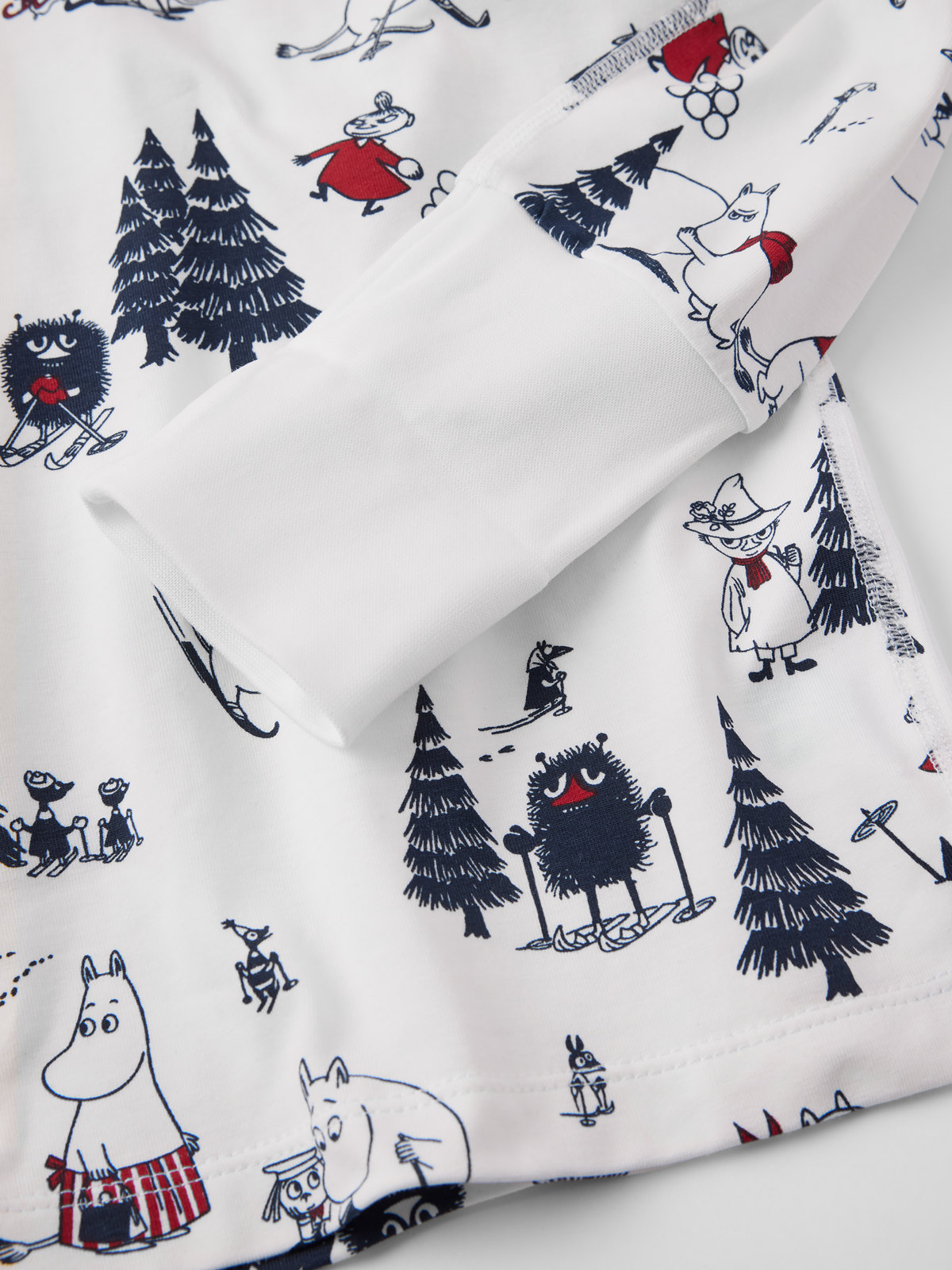 Tvådelad pyjamas i mjuk ekologisk bomull – en del av vårt älskade designsamarbete för att fira Mumins 80-årsjubileum 2025. Pyjamasen är helmönstrad med illustrationer från Tove Janssons berättelser om mumintrollen. Tröjan har extra lång mudd vid ärmslut som går att vika upp eller ned. Byxan har elastisk midja och extra lång mudd vid benslut.