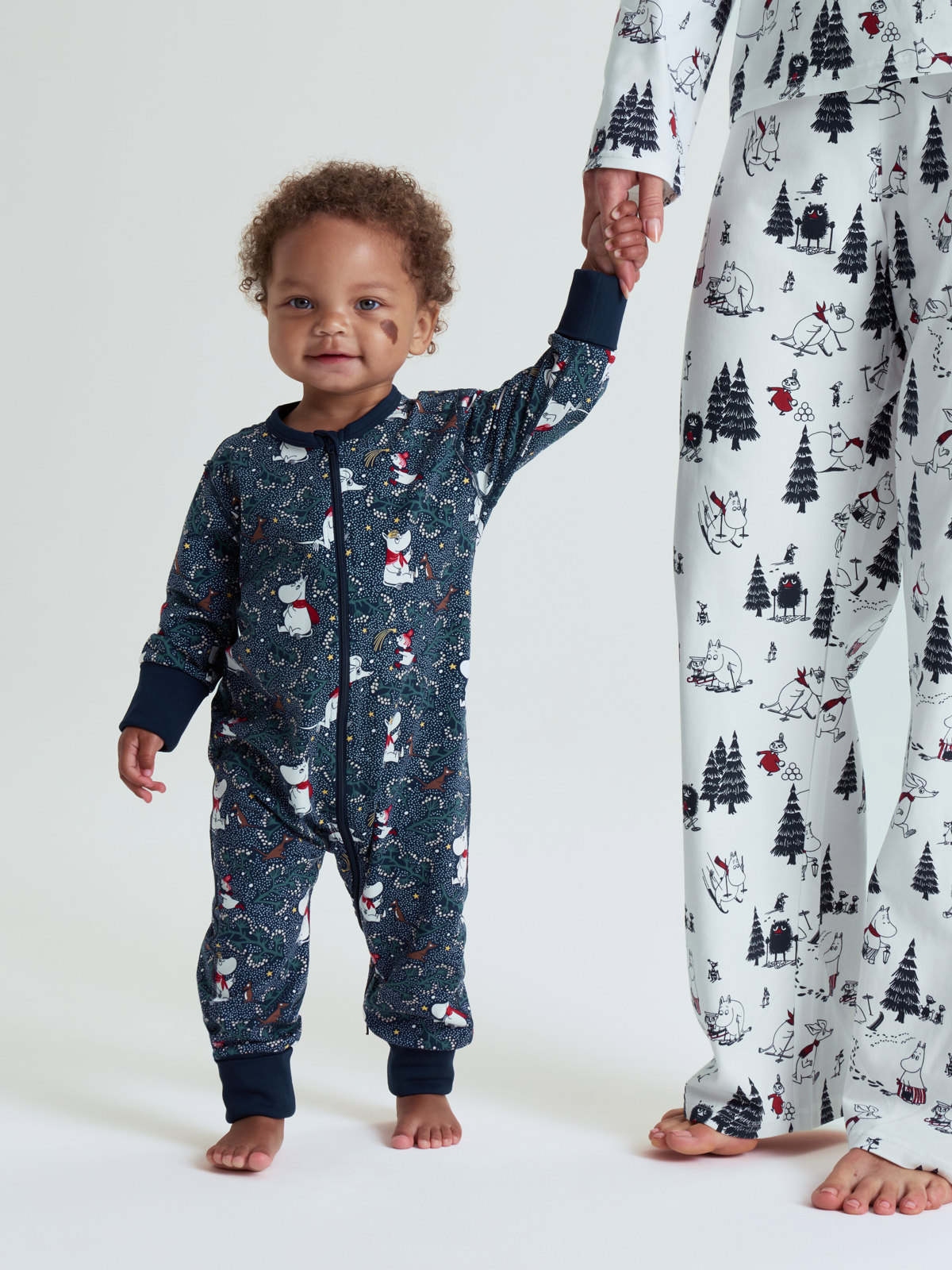 Pyjamasoverall i mjuk ekologisk bomull – en del av vårt älskade designsamarbete för att fira Mumins 80-årsjubileum 2025. Overallen är helmönstrad med illustrationer från Tove Janssons berättelser om mumintrollen. Muddarna vid ärm- och benslut är extra långa och går att vika ned allteftersom barnet växer. Den långa dragkedjan från hals till benslut är öppningsbar både uppifrån och nedifrån för att underlätta klädbyten.