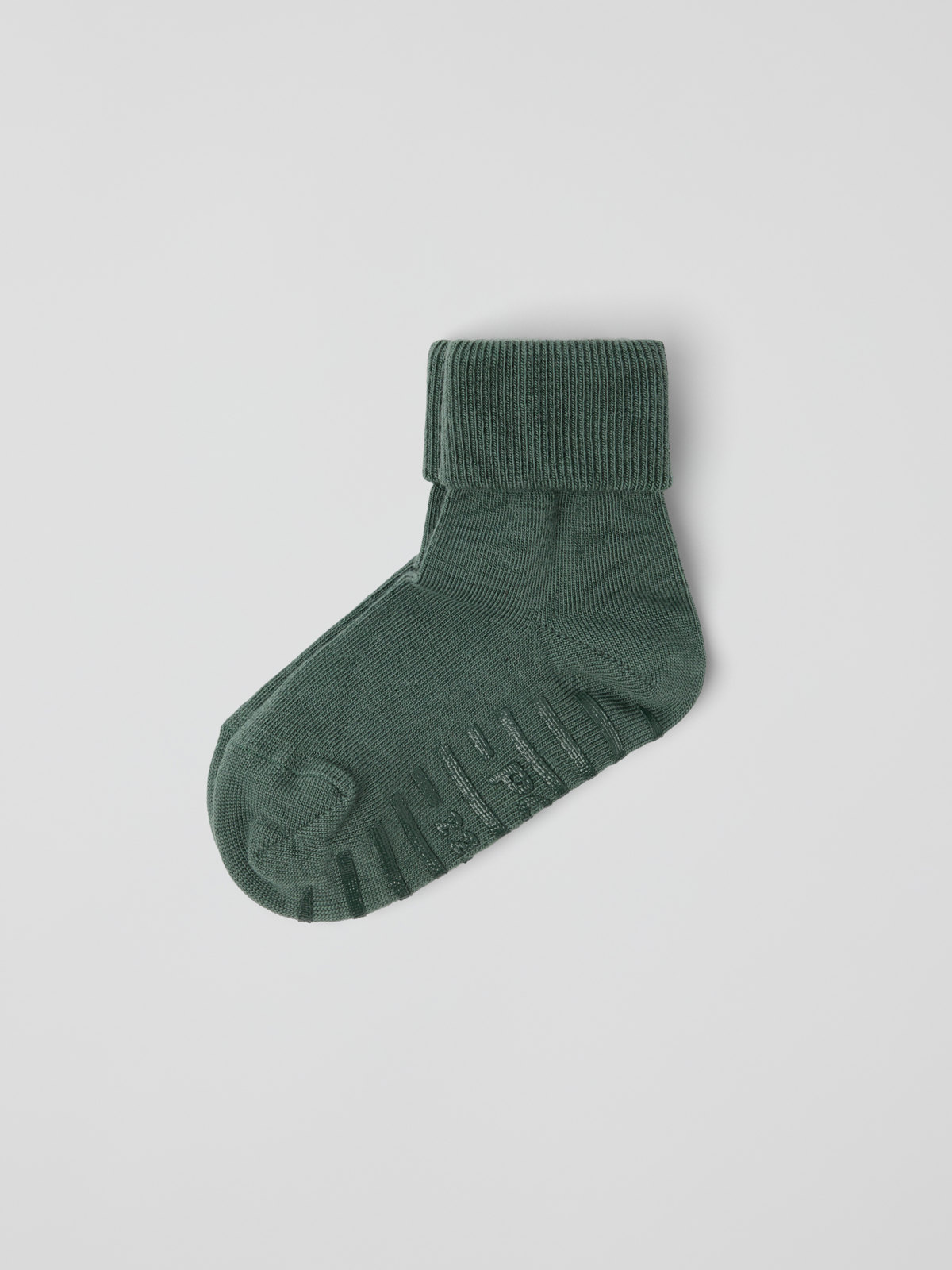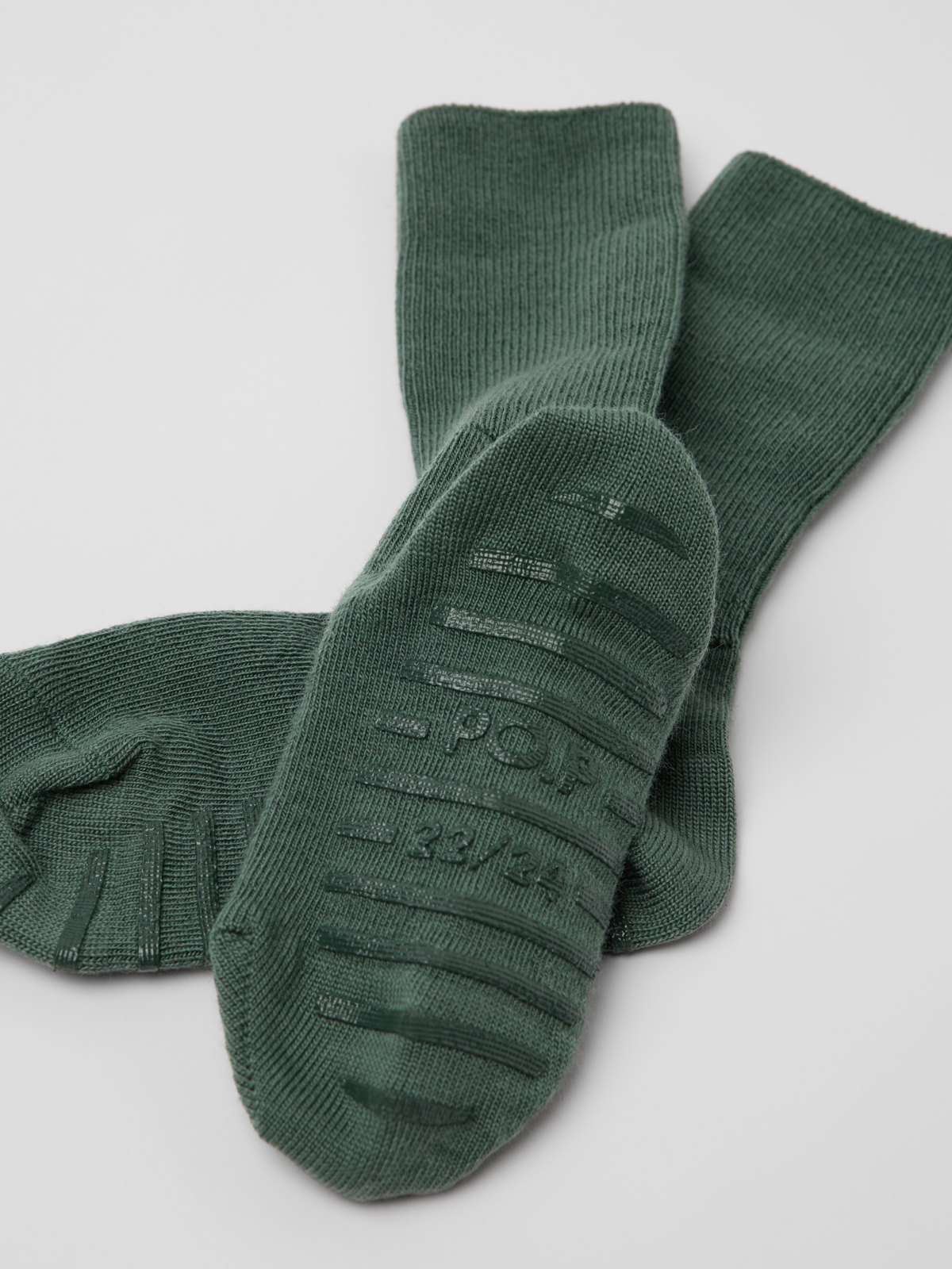 Ett par tunna och sköna strumpor i mjuk merinoull som värmer gott. Strumporna har halkskydd och en mudd som kan vikas upp eller ned och gör att de sitter kvar även på livliga fötter.