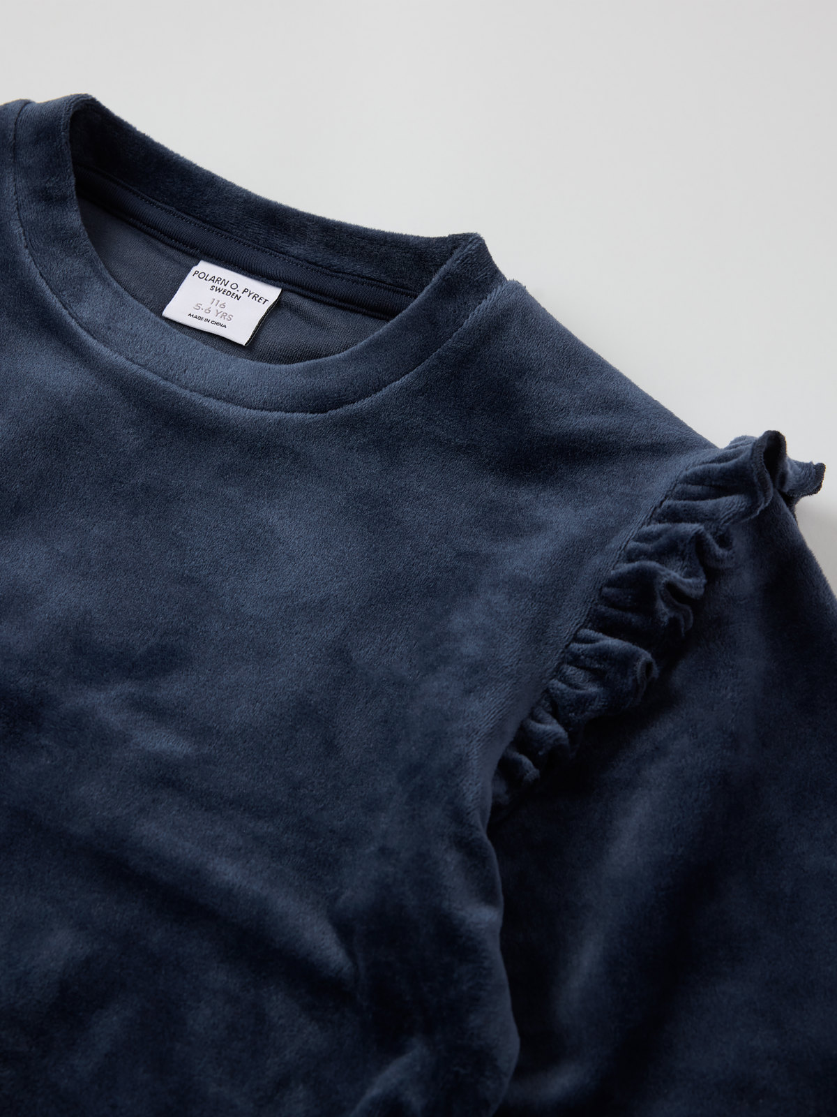 Tröja i mjuk velour tillverkad av återvunnen polyester – en riktig höstfavorit! Tröjan har söta volanger över axlarna och ribbad mudd i halsringing, ärmslut och nederkant för skön passform.