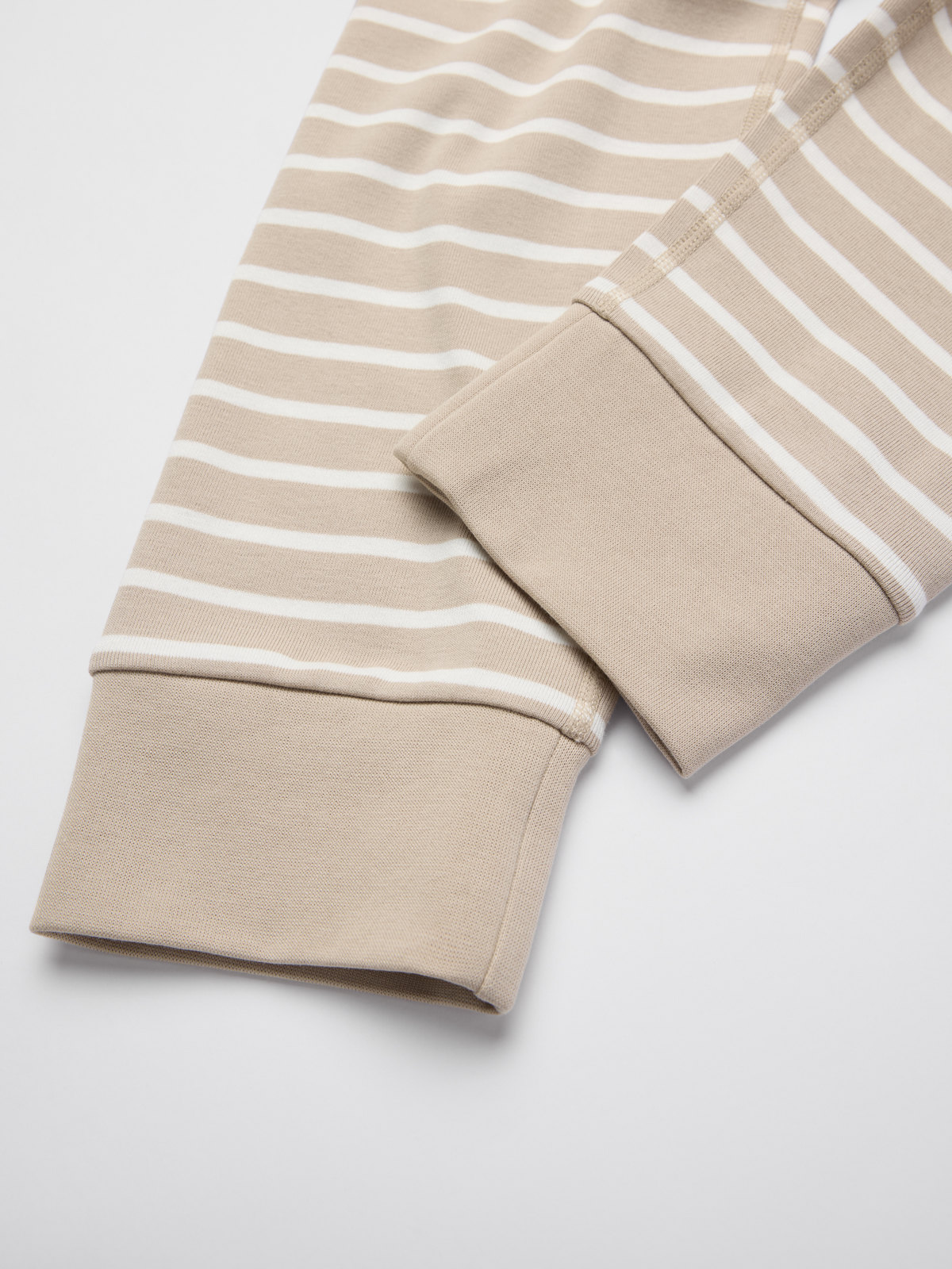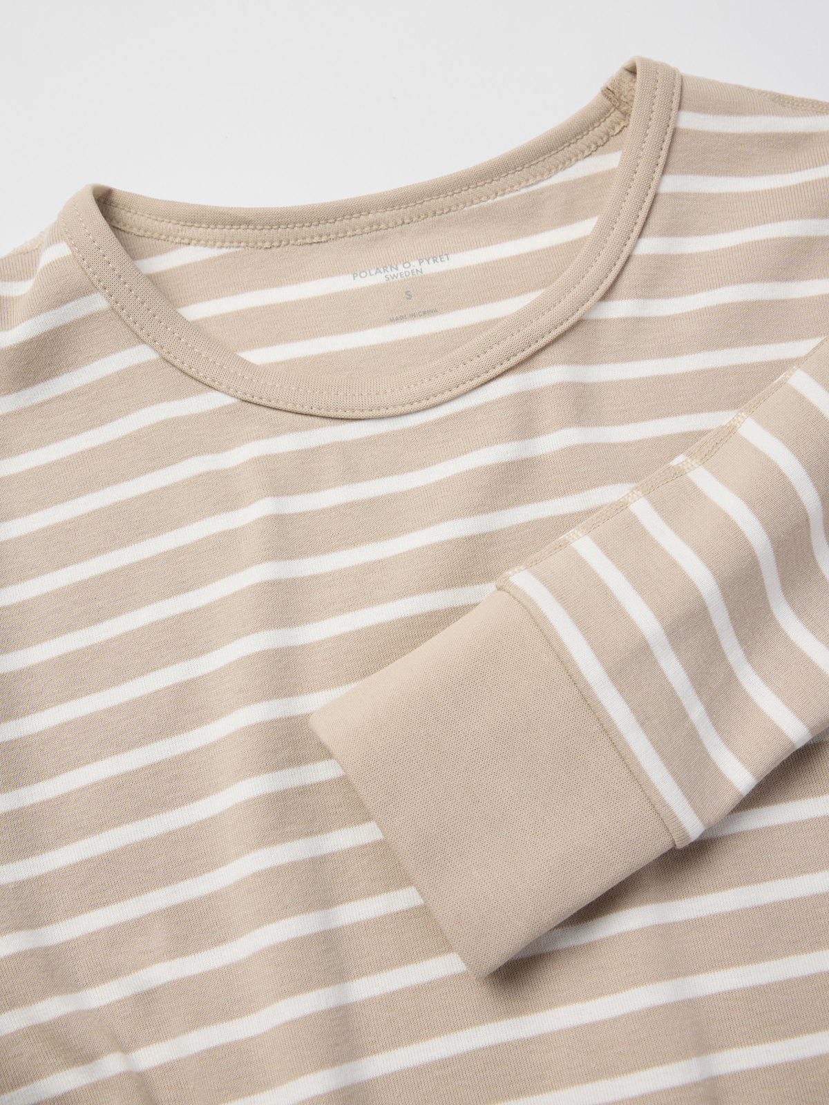 Set med tröja och byxa i vår klassiska rand för vuxen. Tröjan har mjuk ribbad mudd kring halsringning och vid ärmslut. Byxan har elastisk midja och mjuk ribbad mudd vid benslut.