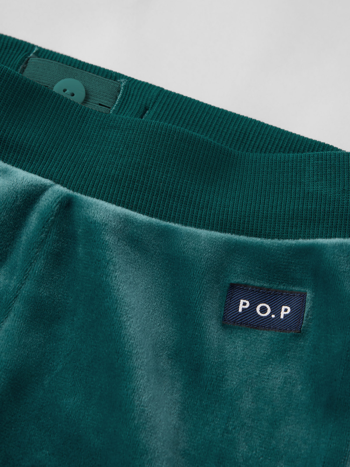 Mjuk och go velourbyxa tillverkad av återvunnen polyester – perfekt för små växande ben. Byxan har elastisk resår i midjan som går att justera med knapphålsresår. De extra långa muddarna i bensluten går att vika upp eller ned allt eftersom barnet växer.