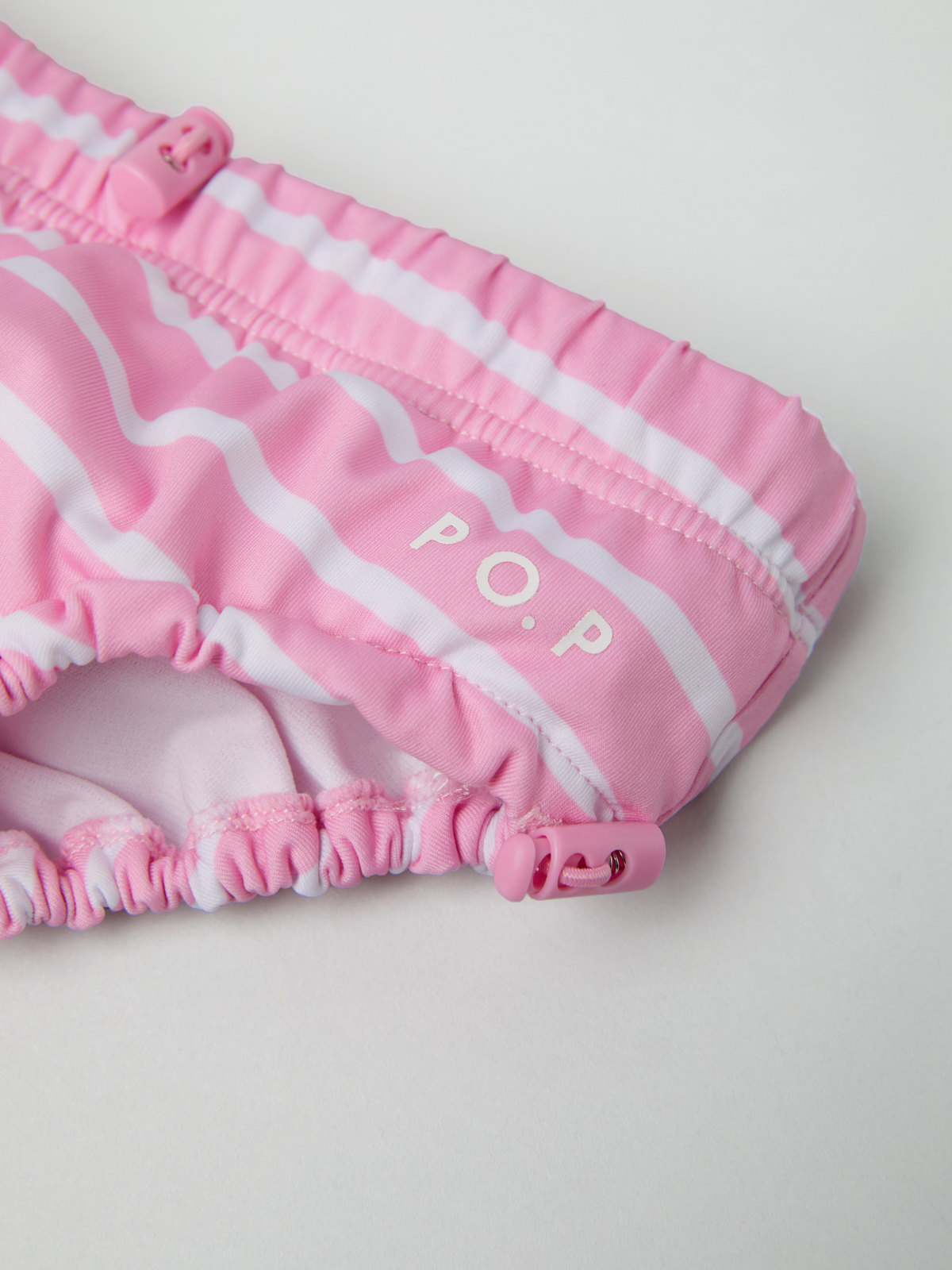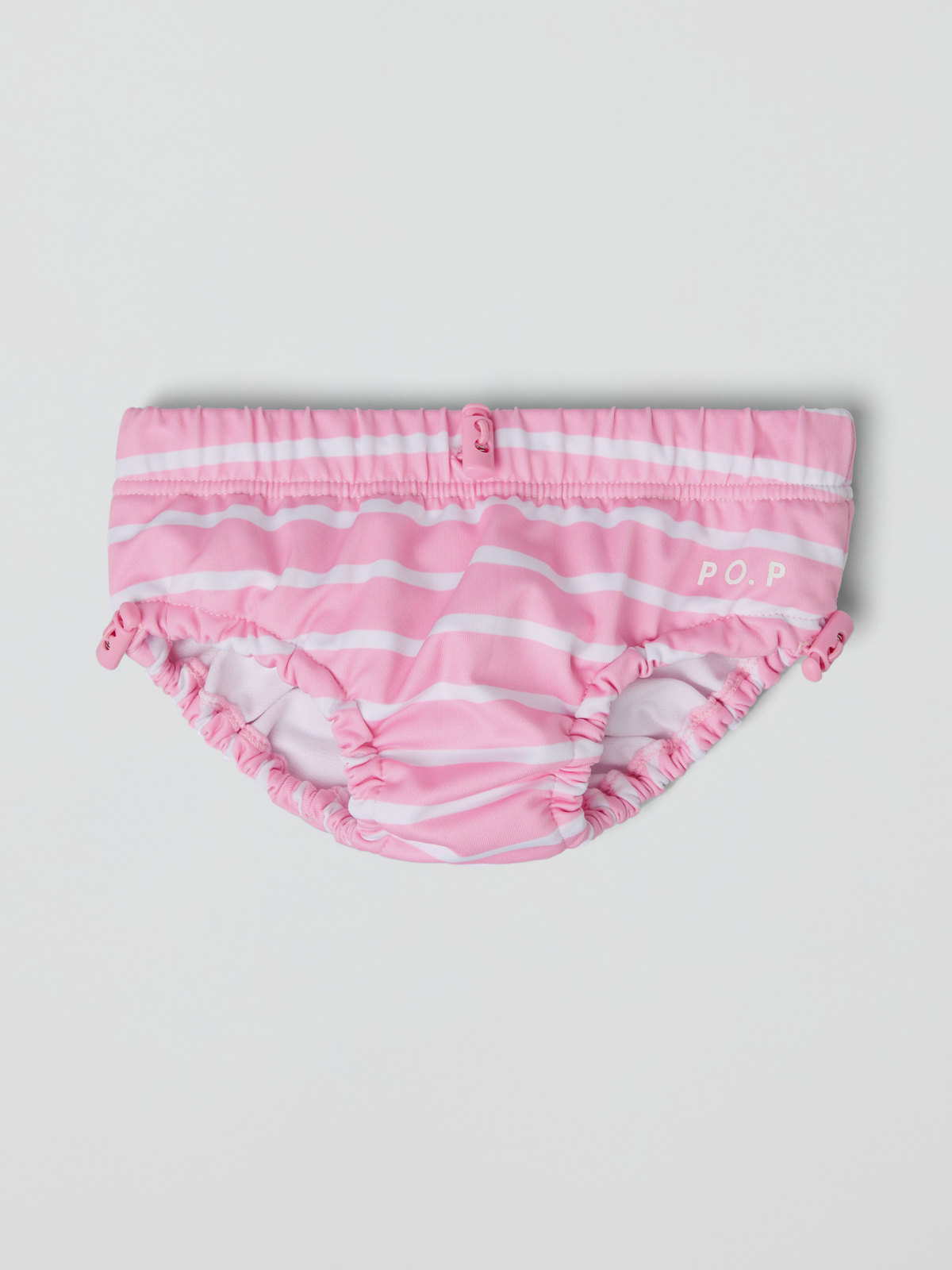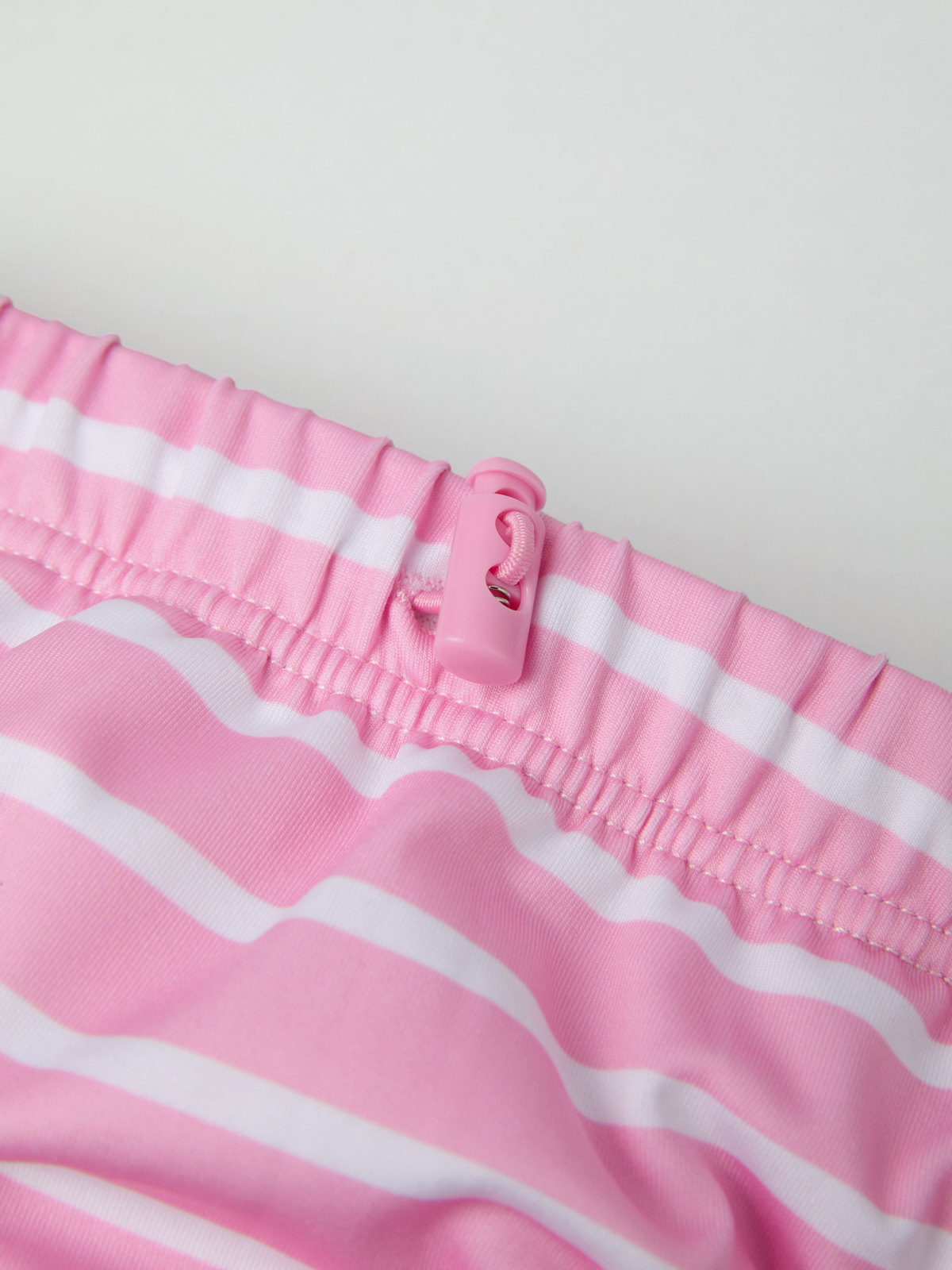 Randig badblöja i återvunnet material – perfekt för babysim eller badutflykten! Badblöjan har ett extra foder som fångar upp små olyckor och runt benöppningarna finns justerbar resår. Midjan är elastisk och går att reglera på insidan med knytband.