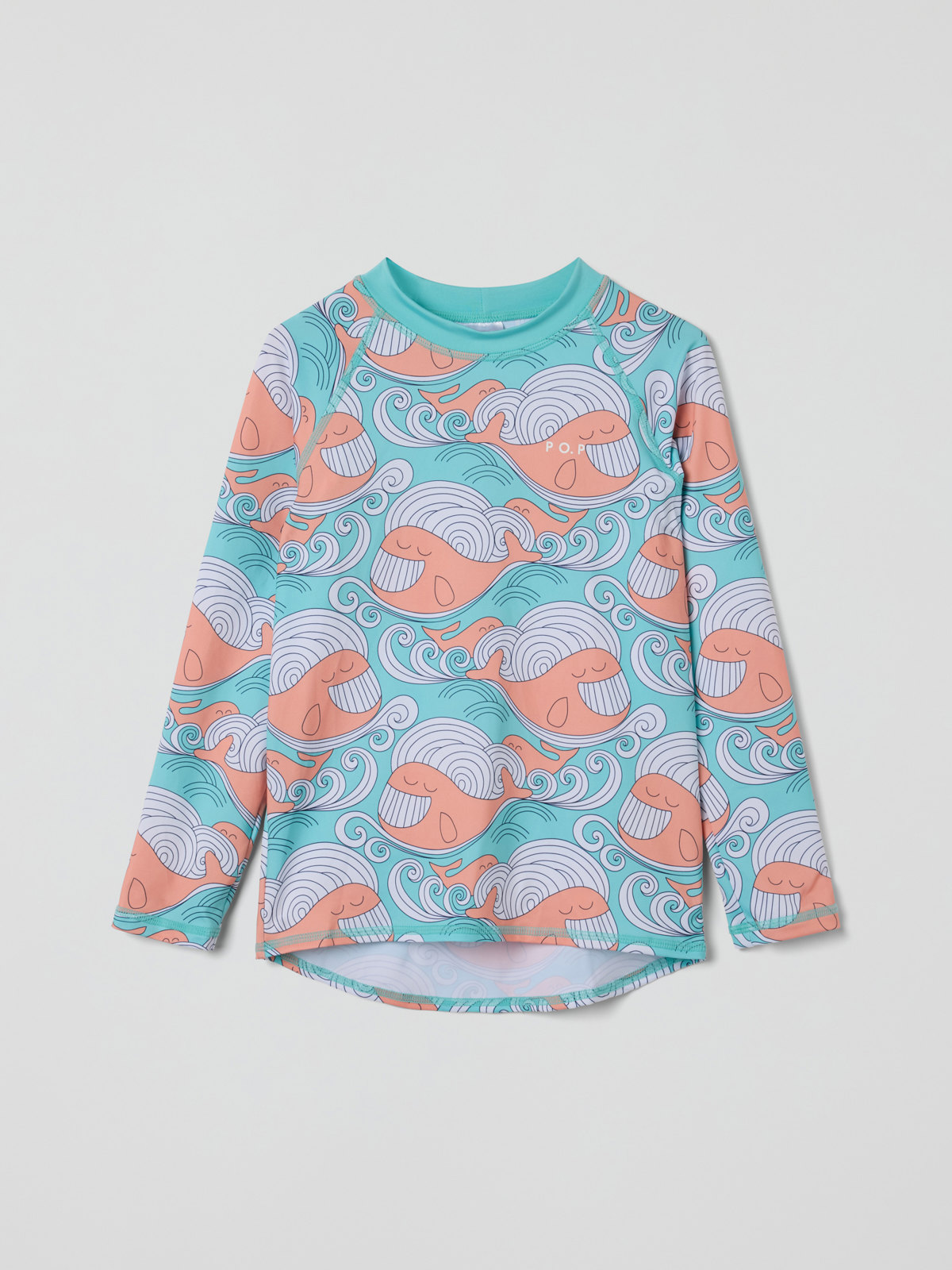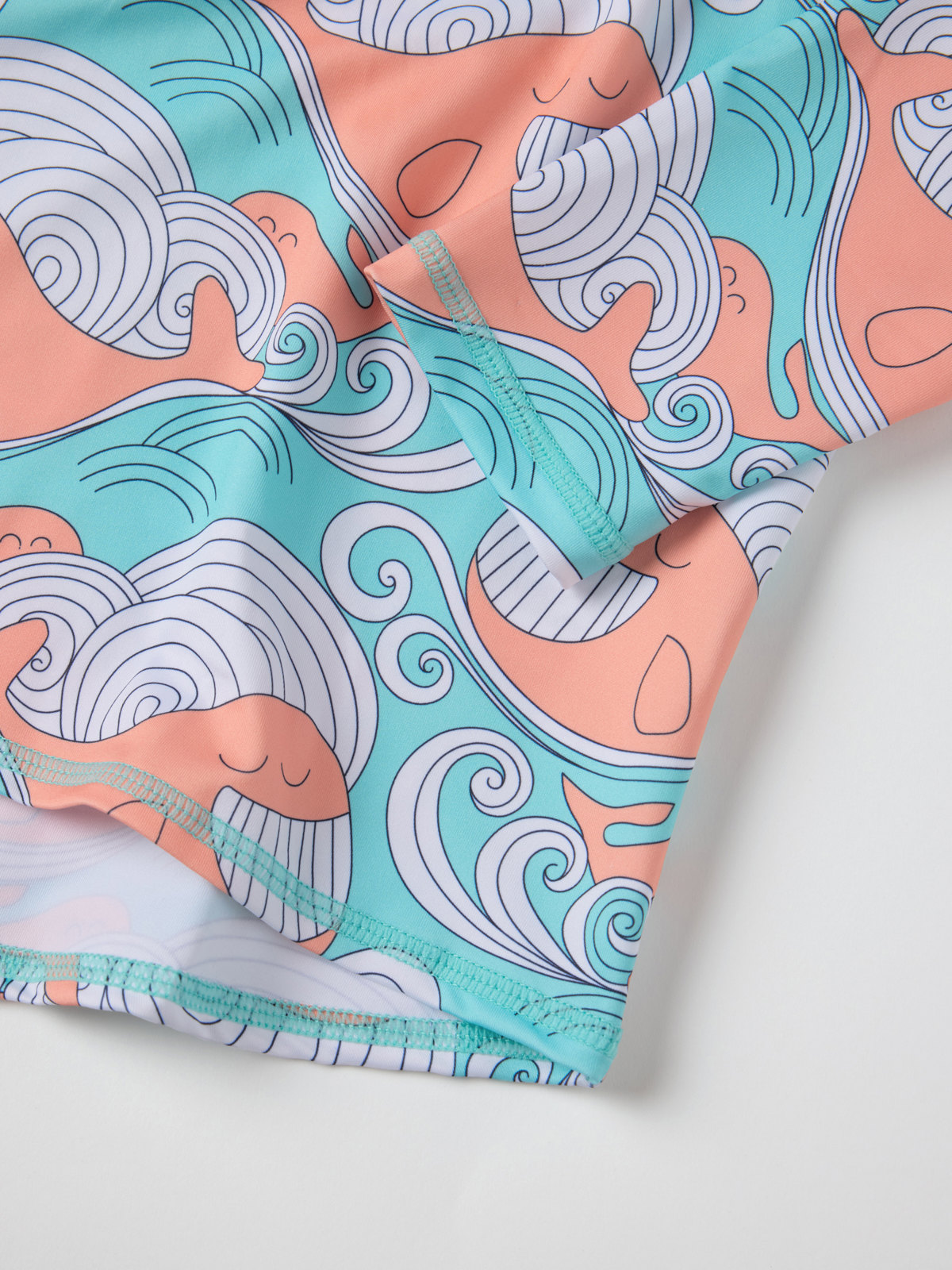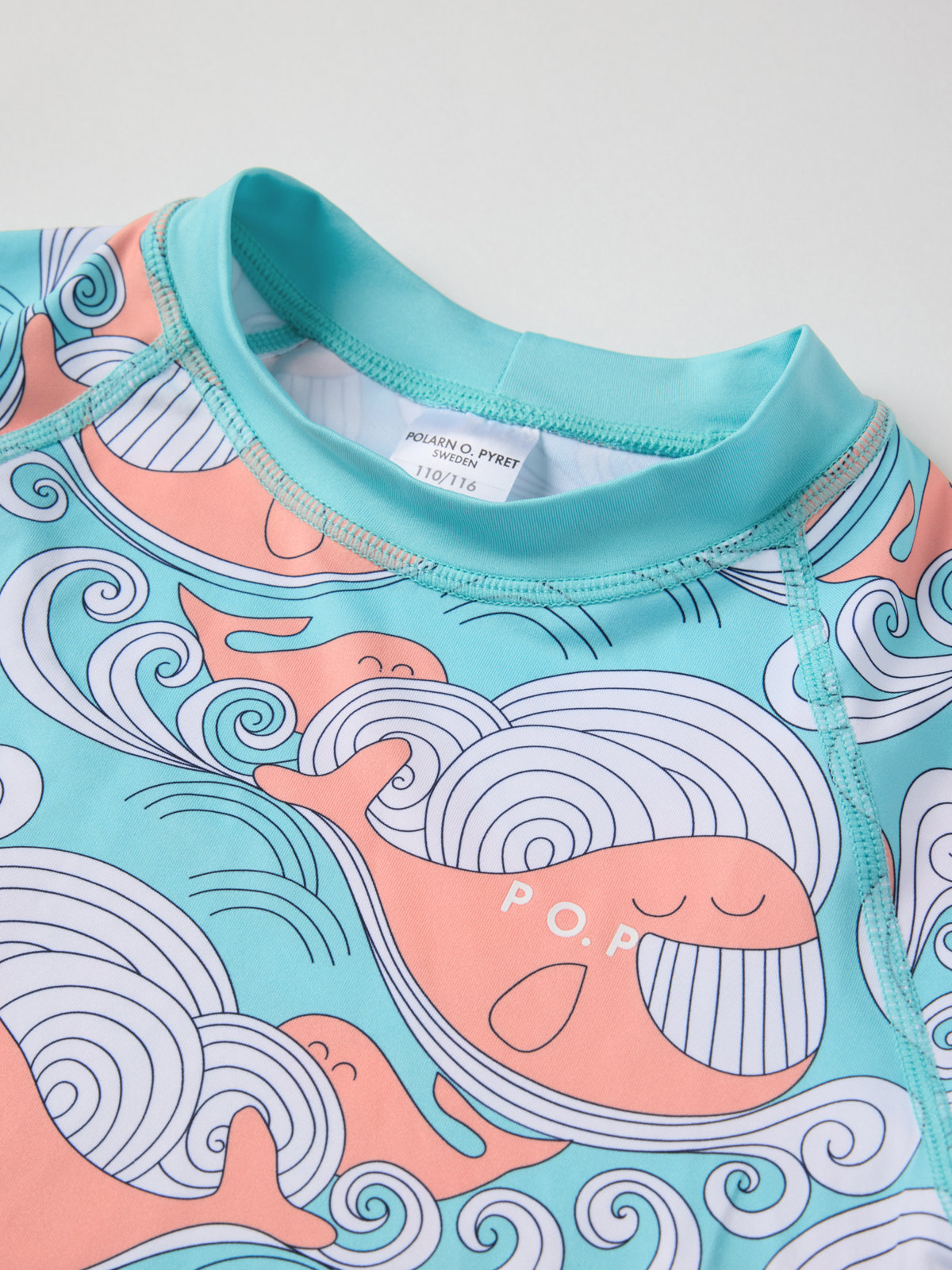 Långärmad UV-tröja med UPF 50, tillverkad i mjukt och skönt material av återvunnen polyester. Tröjan är helmönstrad med valar sydd med extra mjuka sömmar som inte skaver. Matcha med tillhörande UV-byxa!