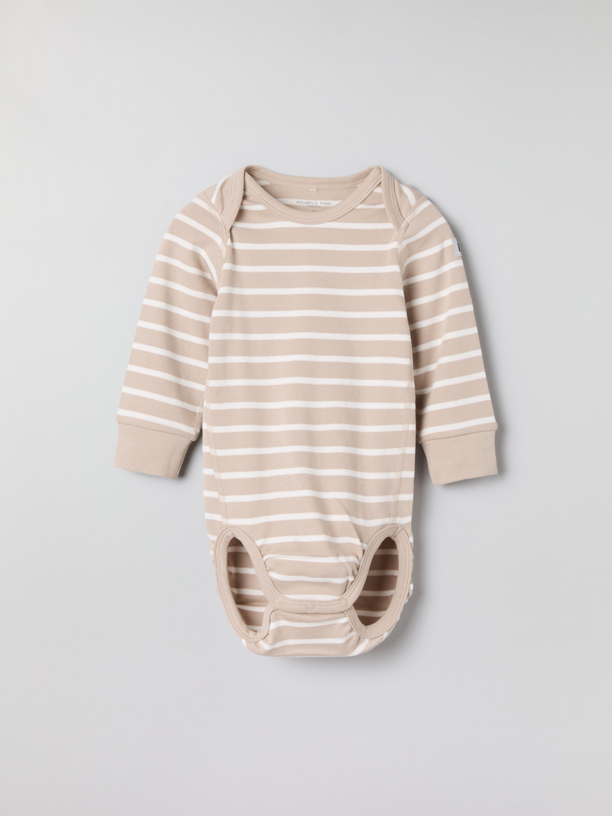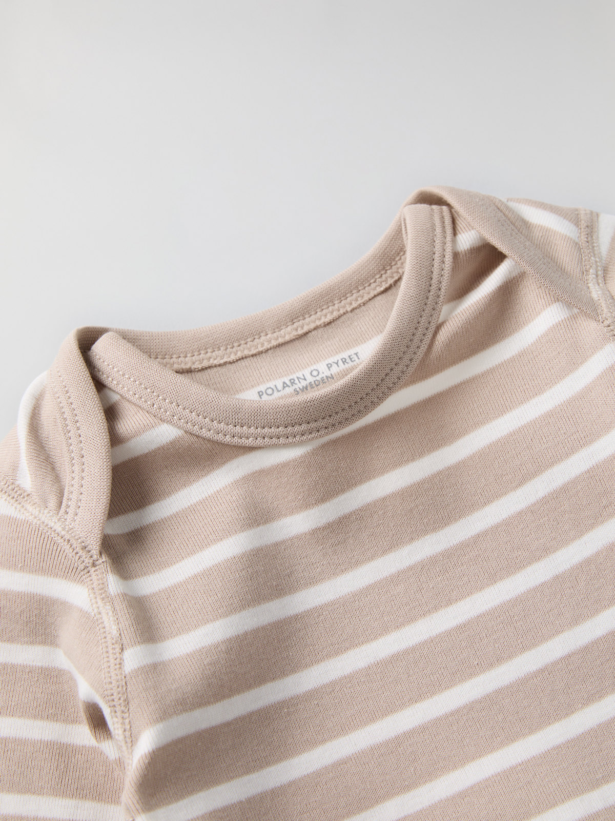 Ett perfekt basplagg att ha i barngarderoben! Bodyn har vår klassiska rand och omlottlagda axlar, samt mjuk ribbad mudd vid ärmsluten. Tryckknapparna i grenen underlättar kläd- och blöjbyten.