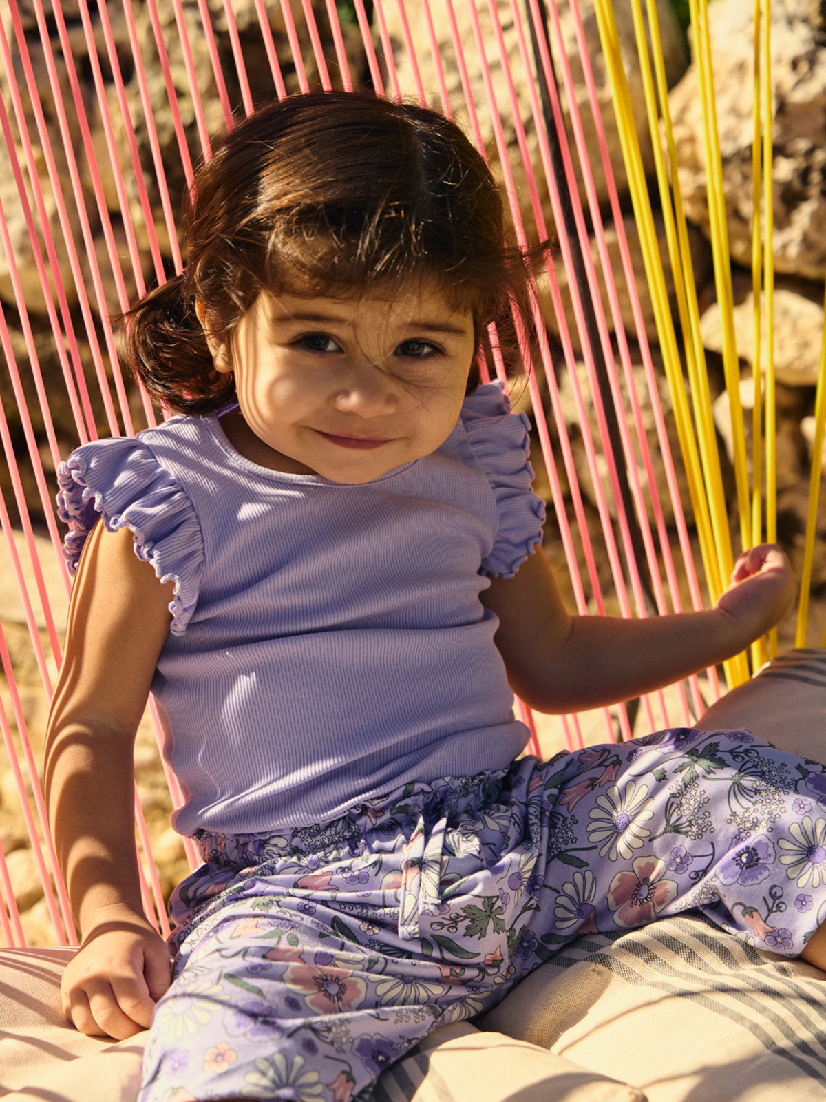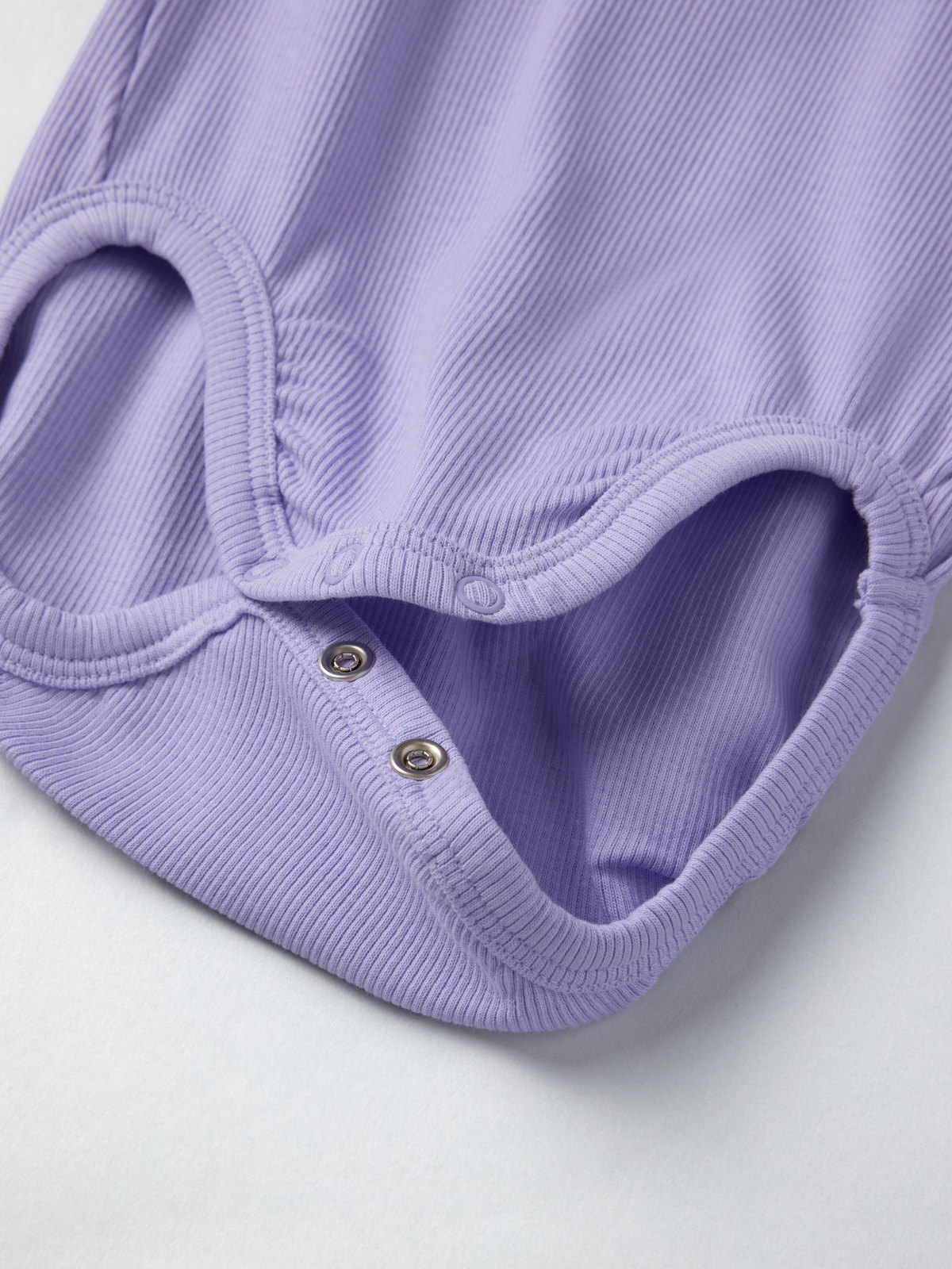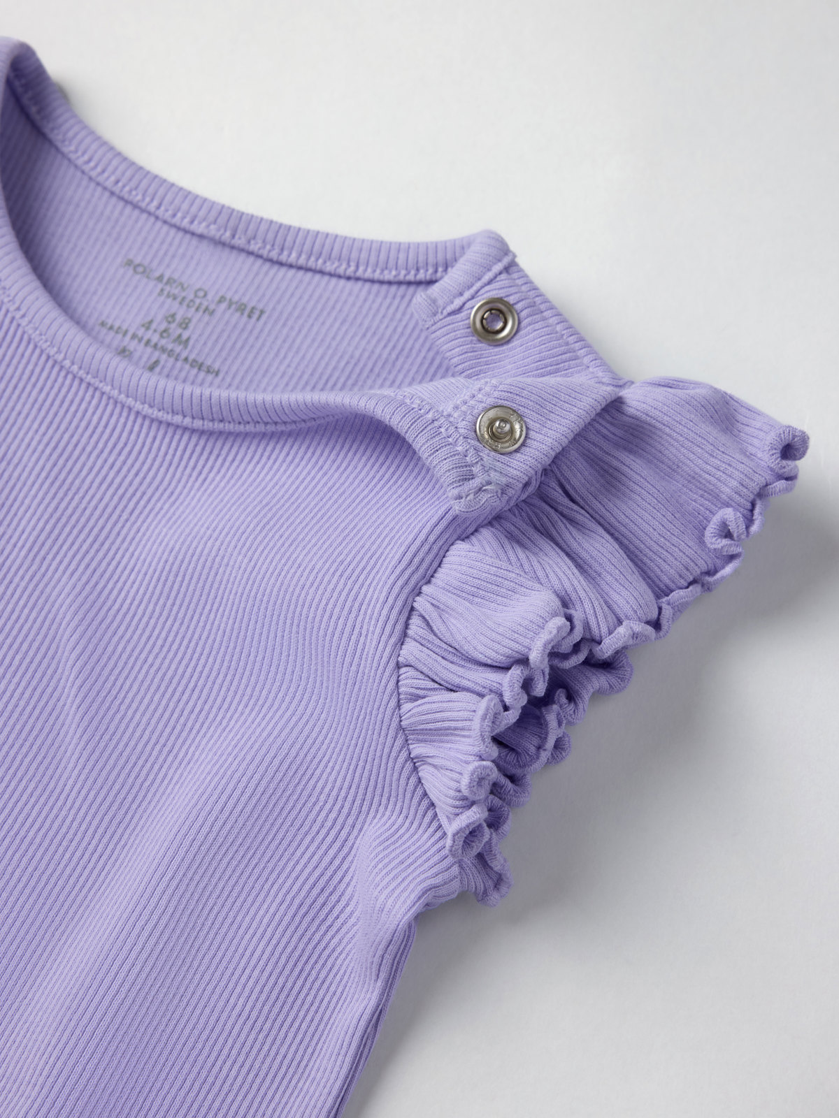 Ribbad trikåbody i mjuk ekologisk bomull med söta volanger för baby. Bodyn är sydd med extra mjuka, platta sömmar för att vara skonsam mot babyns känsliga hud.