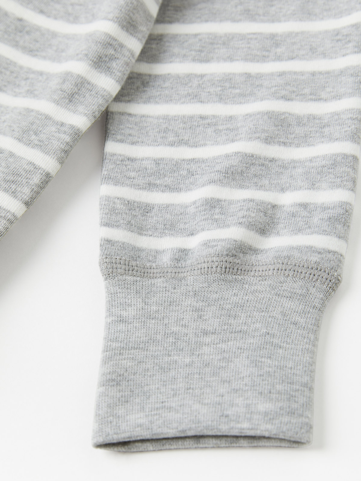 En randig body i 100% ekologisk bomull för baby. Bodyn har vår klassiska rand och mjuka elastiska muddar vid ärmsluten. Tryckknapparna på ena axeln och i grenen underlättar klädbyten.