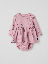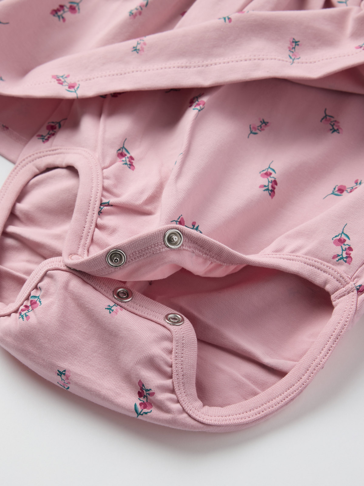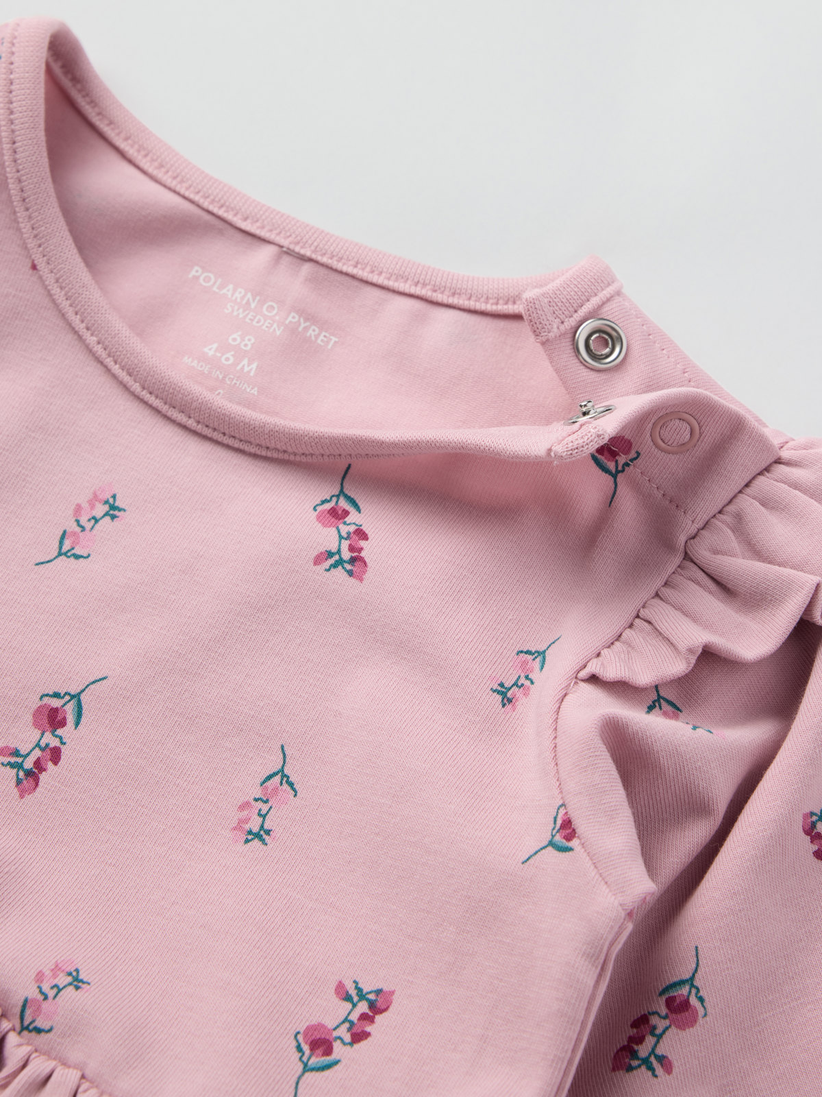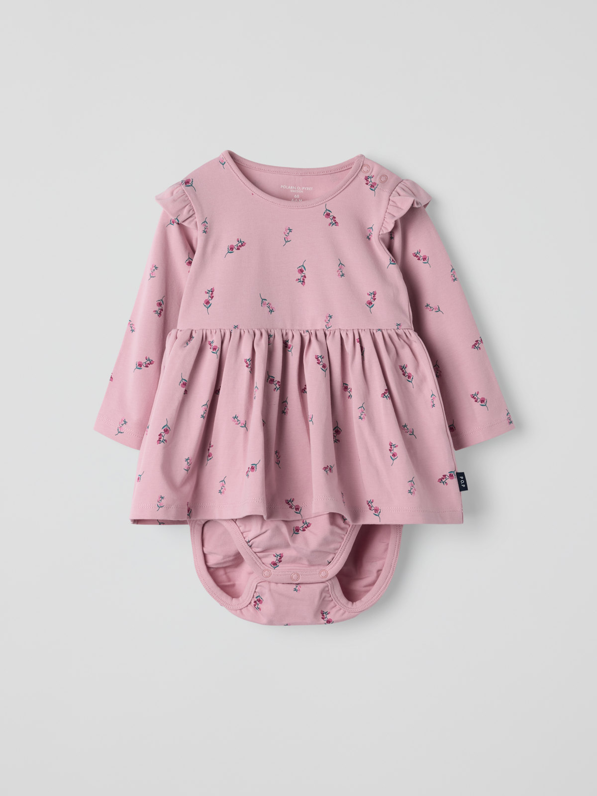 En praktisk kombination av klänning och body i mjuk ekologisk bomull för baby. Klänningen är blommönstrad och prydd med fina volanger över axlarna. Tryckknappar på ena axeln och i grenen underlättar klädbyten.