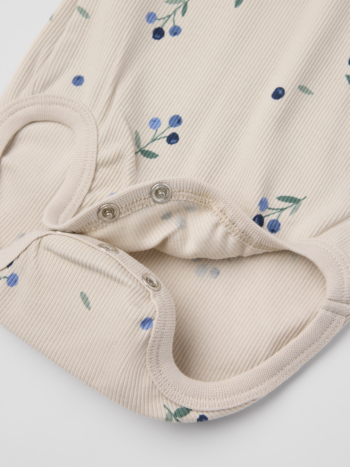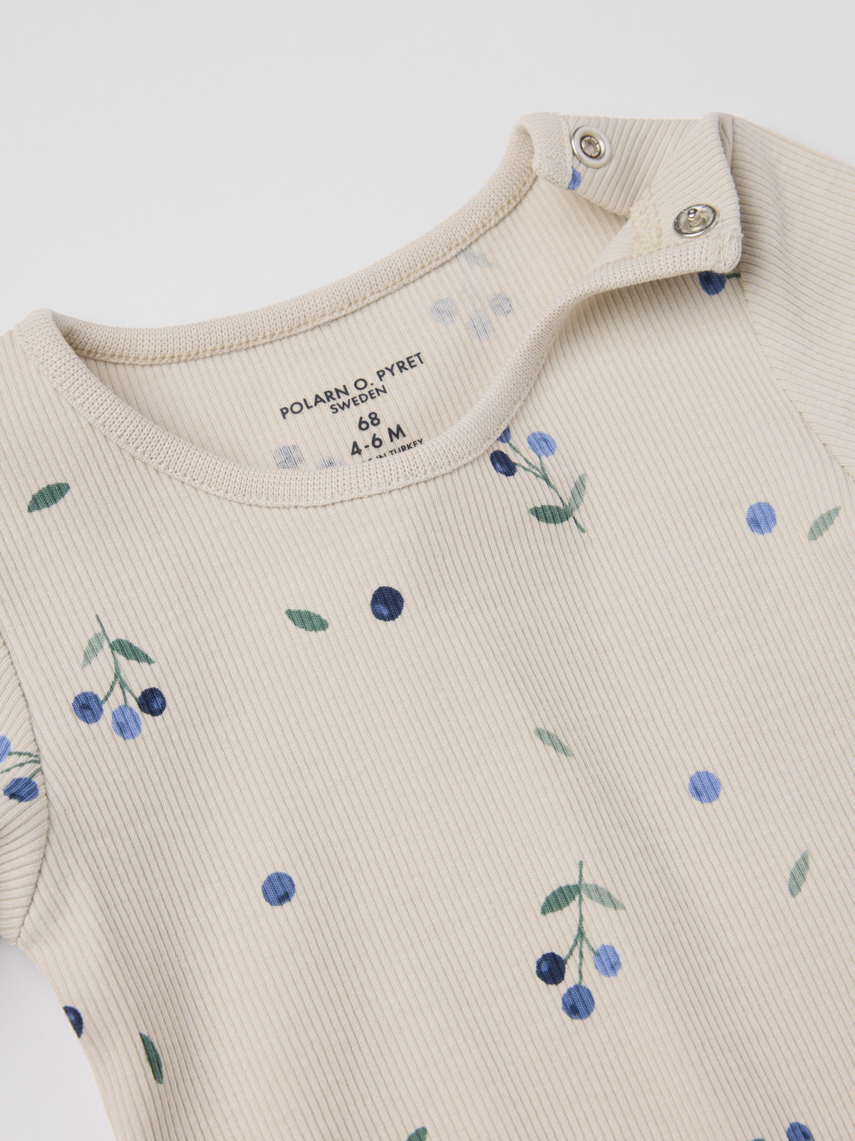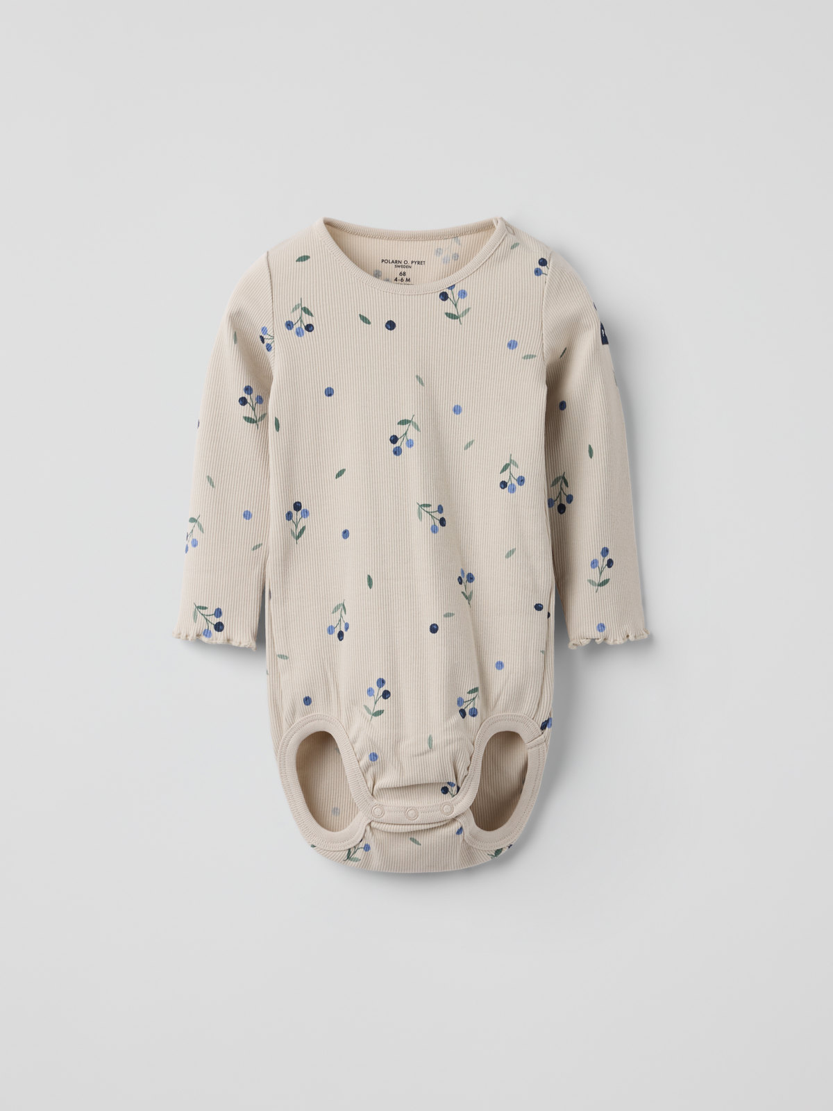Ribbad body i tunn, ekologisk bomull för baby med mjuk volang i halsringningen. Bodyn är sydd med extra mjuka, platta sömmar som inte skaver mot känslig hud.