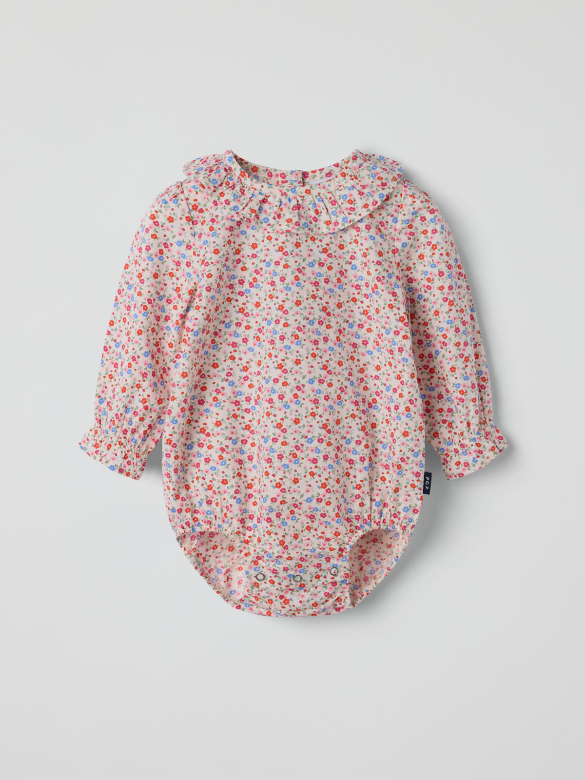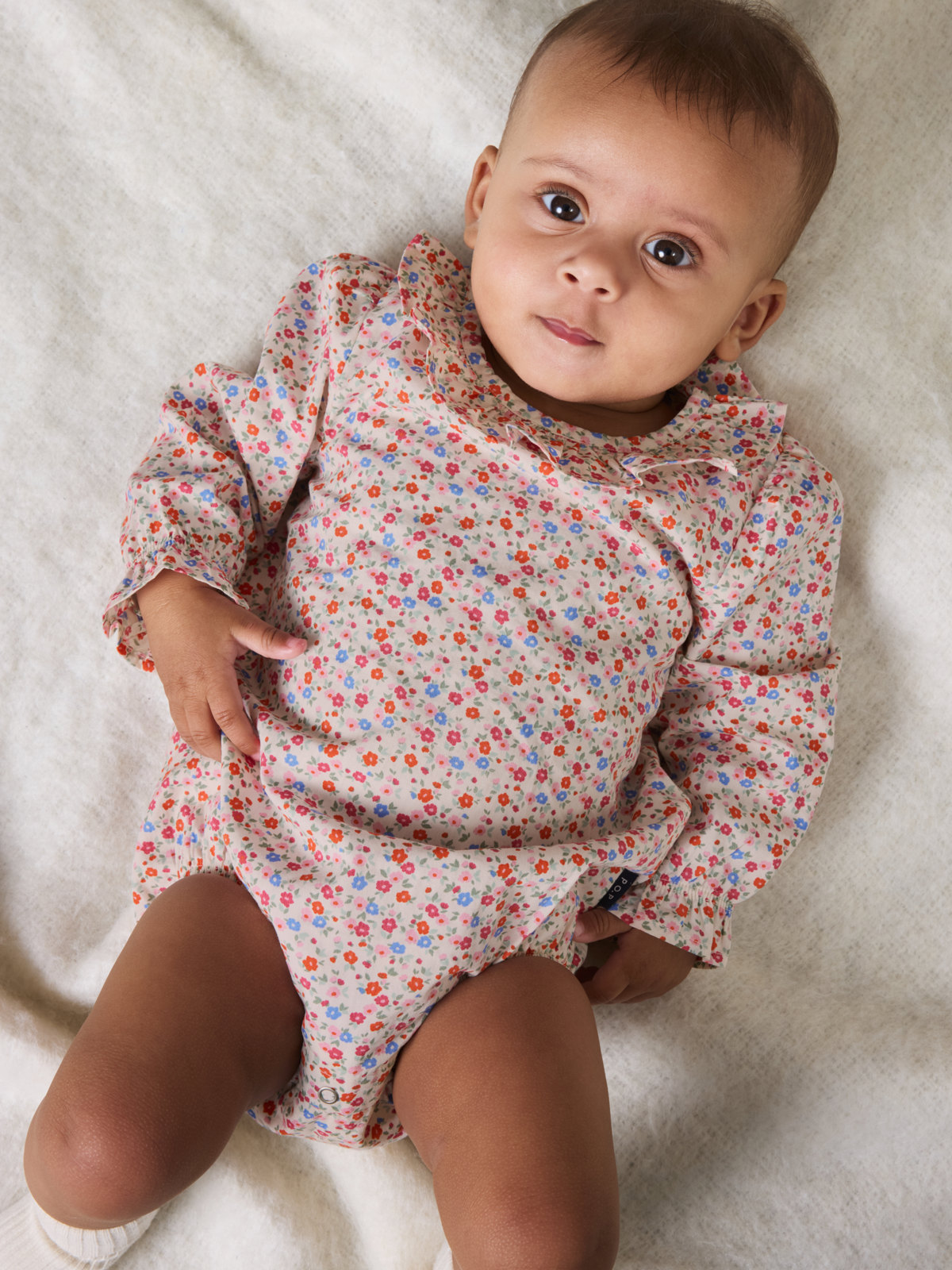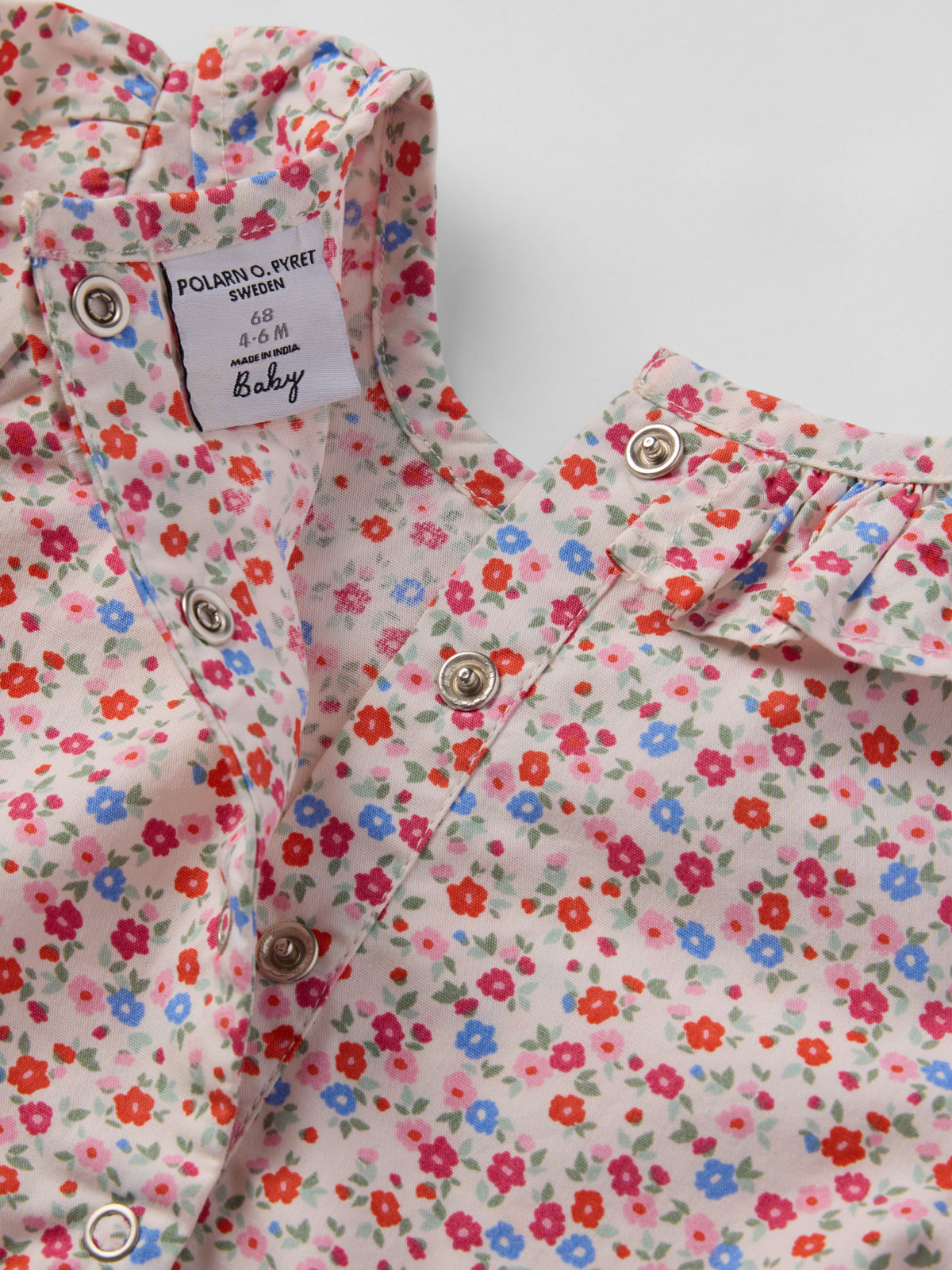 Body i tunn muslin tillverkad av 100% ekologisk bomull. Bodyn har söta volanger i halsringning och ärmslut.