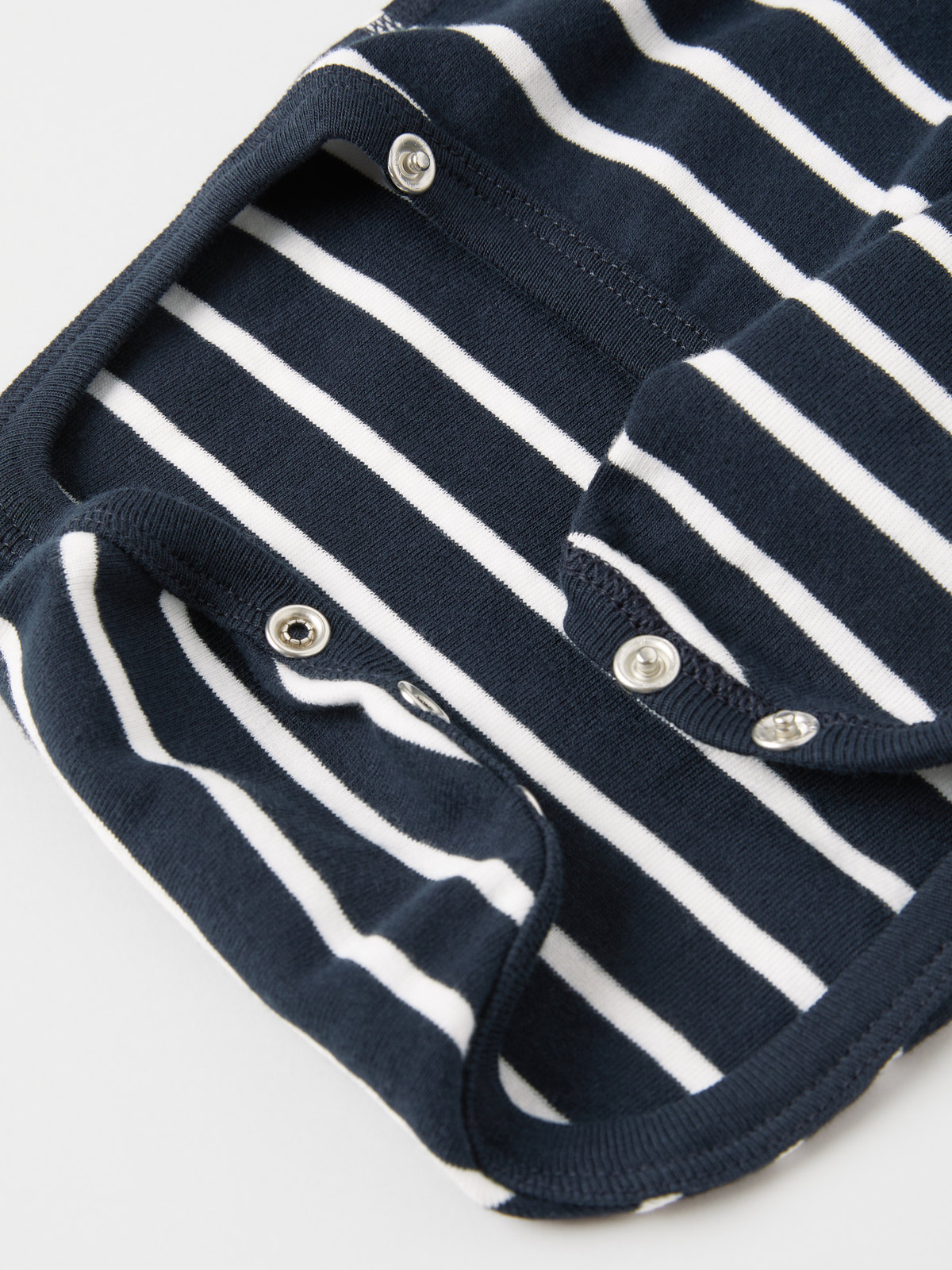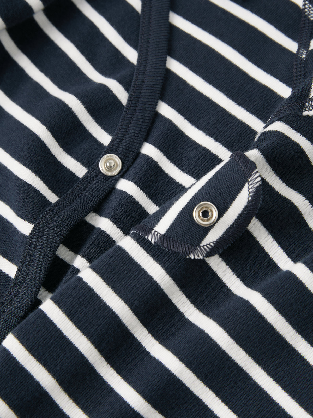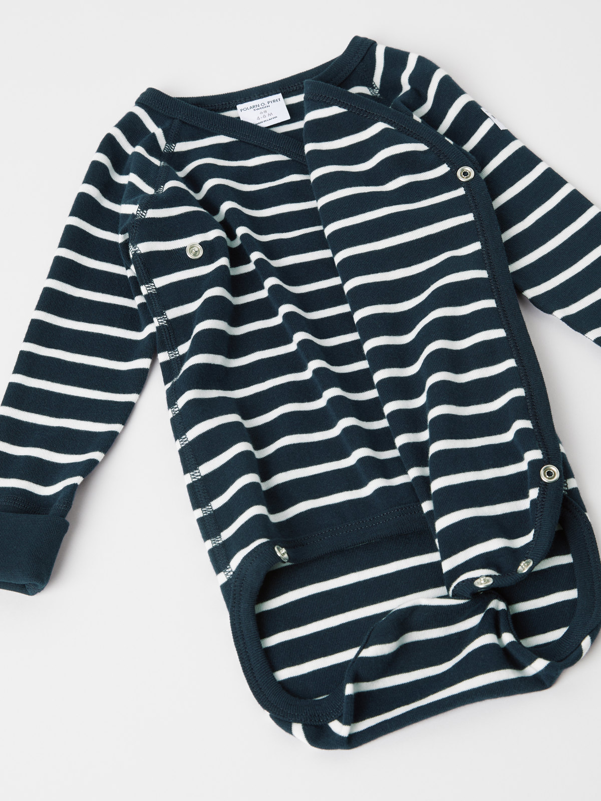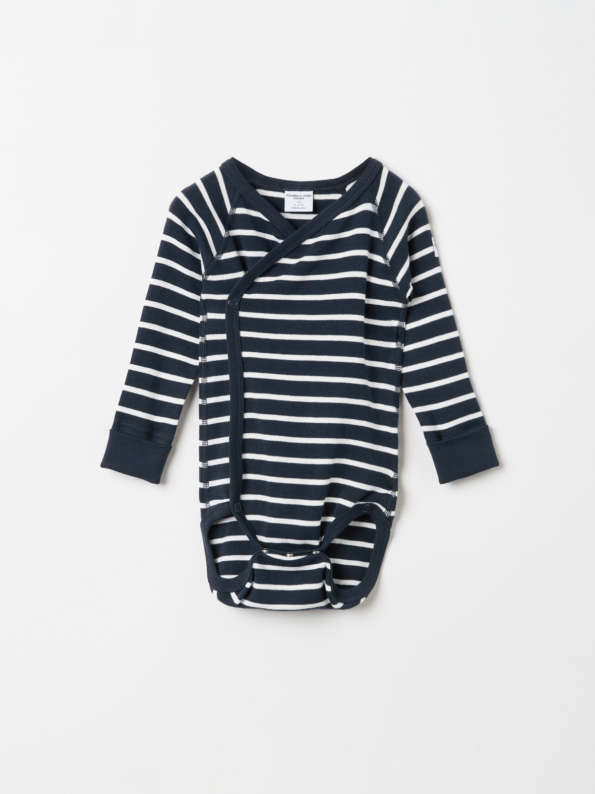 En randig omlottbody i 100% ekologisk bomull för baby. Bodyn har vår klassiska rand och mjuk ribbad mudd vid ärmsluten som går att vika ned allteftersom babyn växer. Tryckknapparna längst med omlottöppningen och i grenen underlättar kläd och blöjbyten.