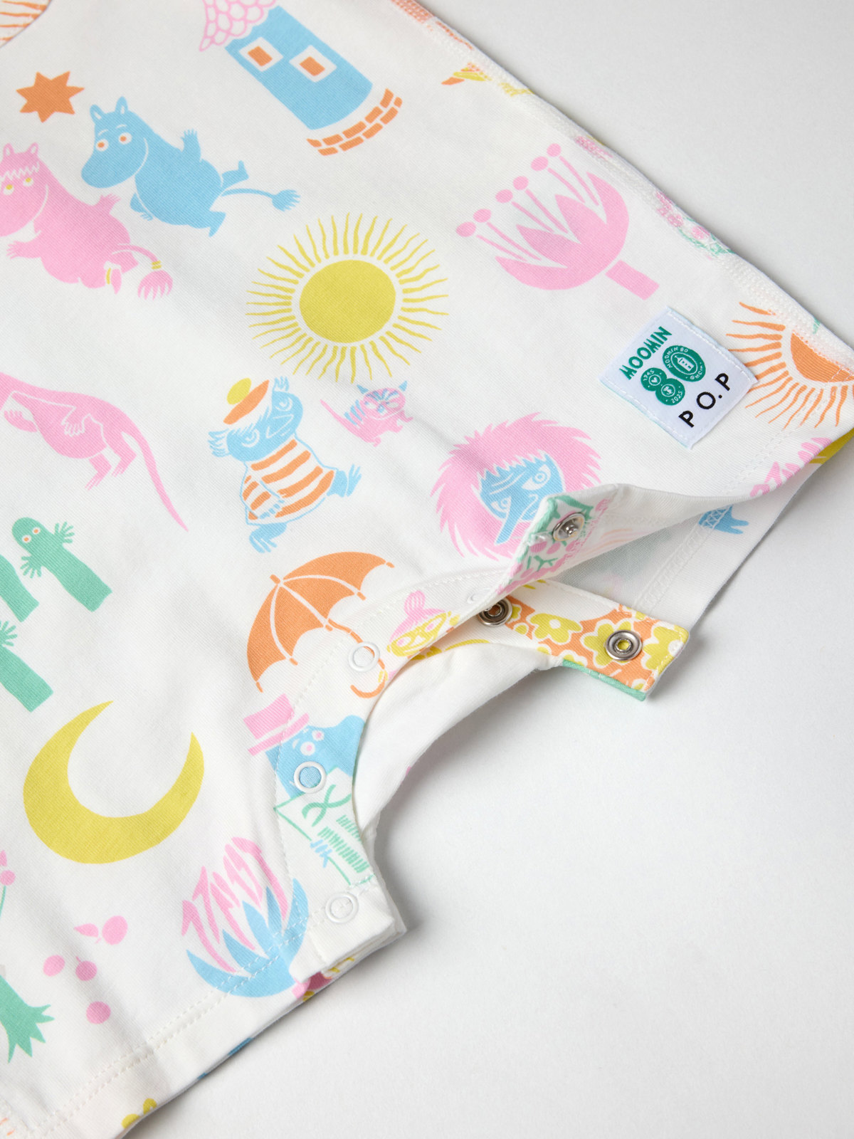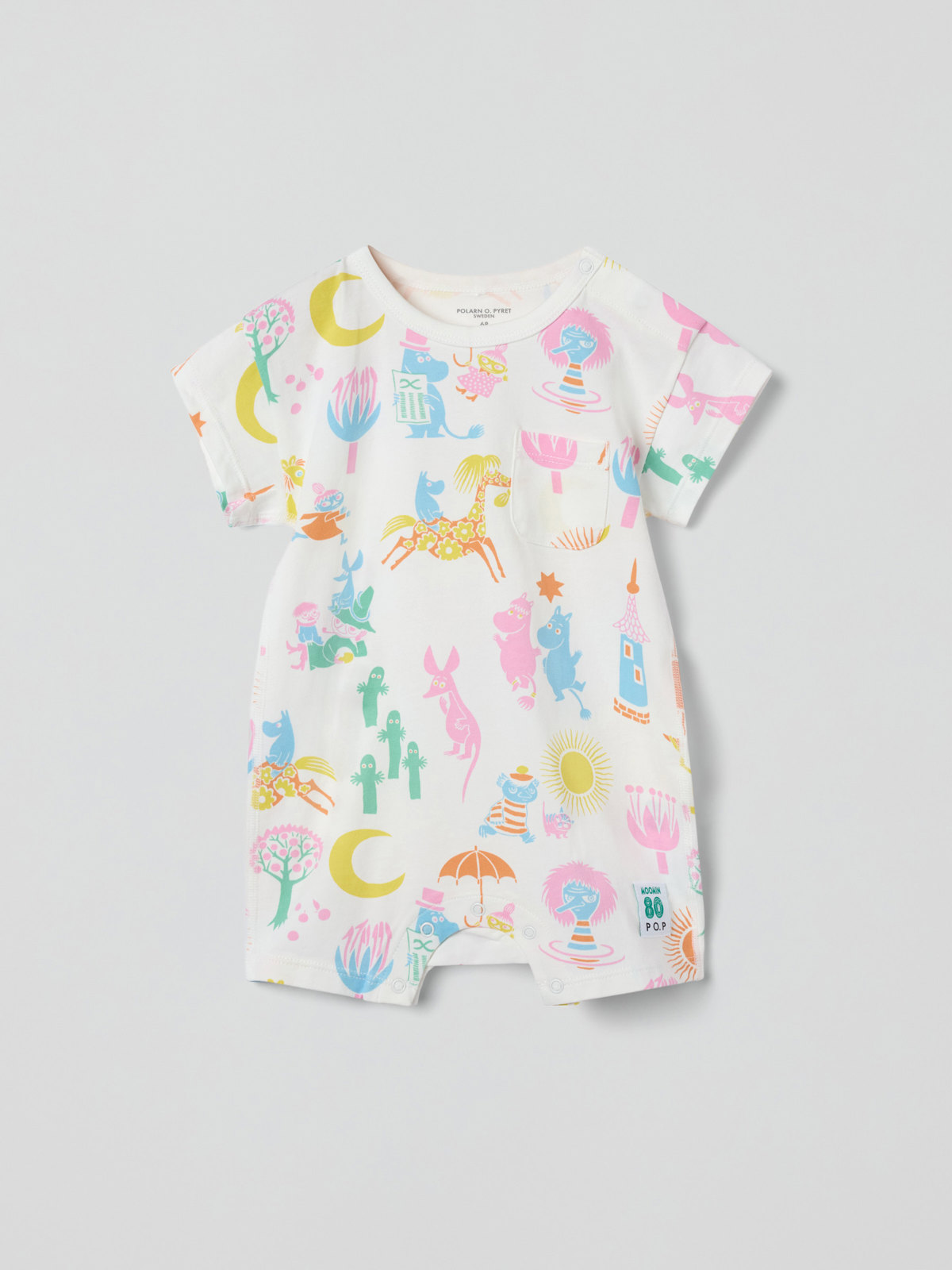 Kort playsuit i mjuk, ekologisk bomull för baby – en riktig sommarfavorit! Playsuiten är helmönstrad med illustrationer från Tove Janssons berättelser om mumintrollen och är sydd med extra mjuka, platta sömmar som ligger mjukt mot känslig hud.