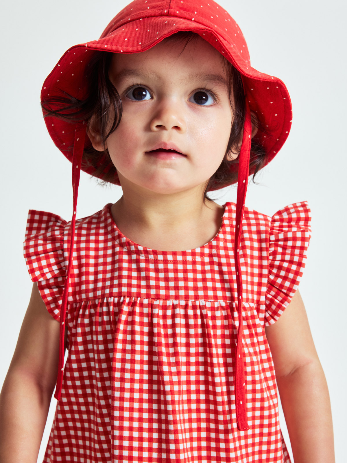 Rutig ärmlös klänning i mjuk ekologisk bomullstrikå – en fin och skön sommarfavorit! Klänningen har små volanger över axlarna, vid passform och stängs med knappar på ena axeln.