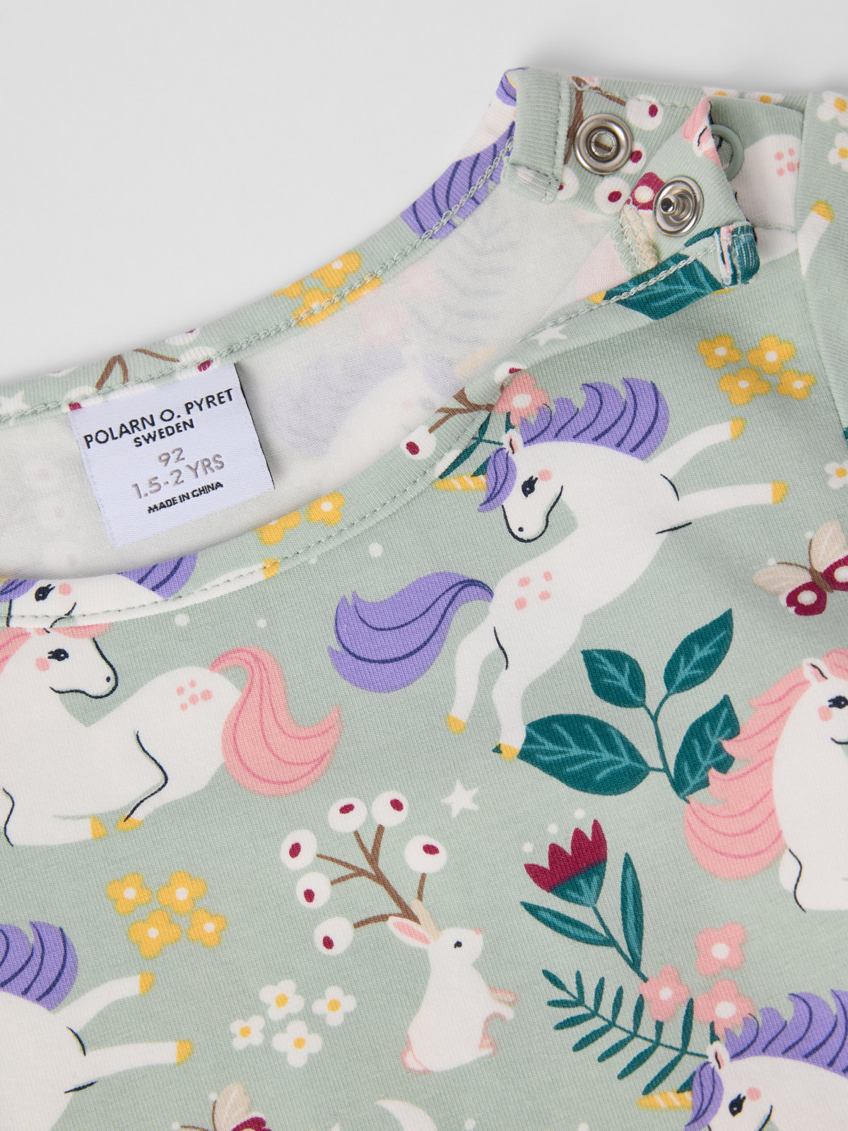 Storlek 86-92 stängs med knappar på axeln.