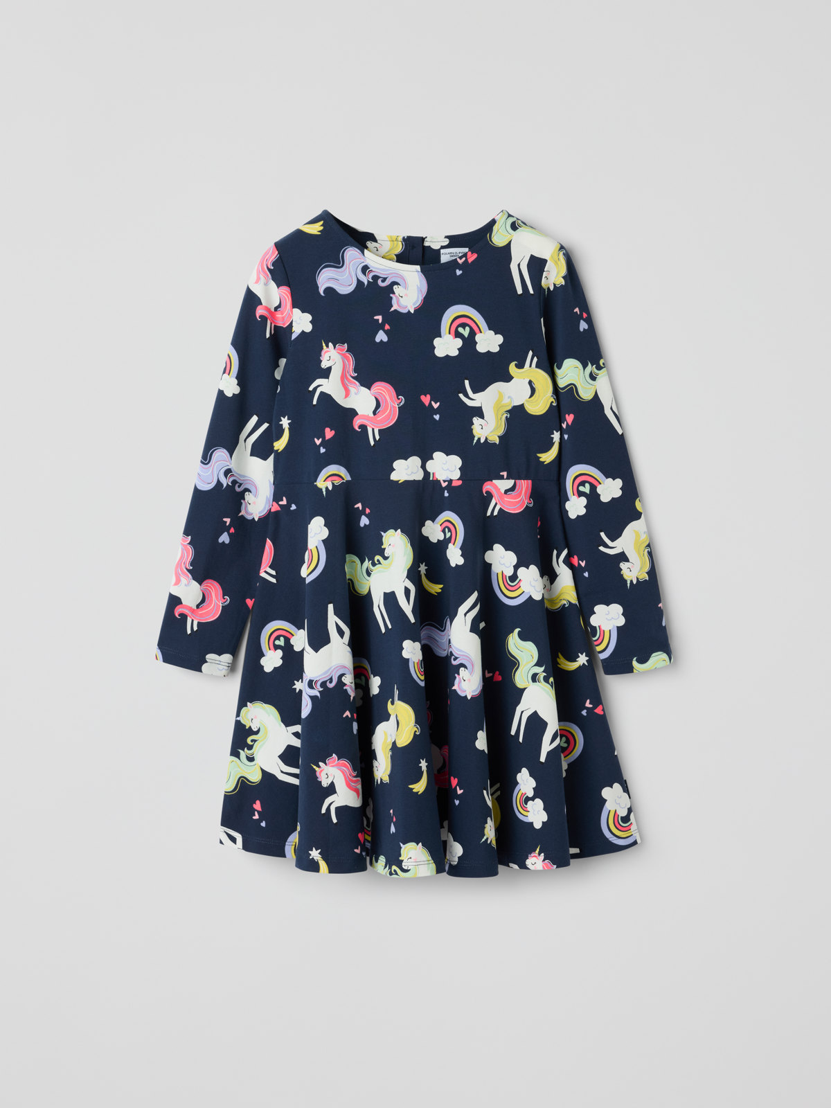 Vår klassiska snurrklänning är ett måste i barngarderoben! Den är tillverkad i mjuk ekologisk bomullstrikå och har extra vidd i kjolen som står ut fint när man snurrar. Klänningen stängs med knappslå bak på ryggen.