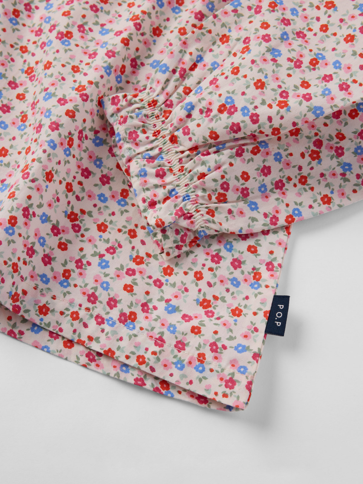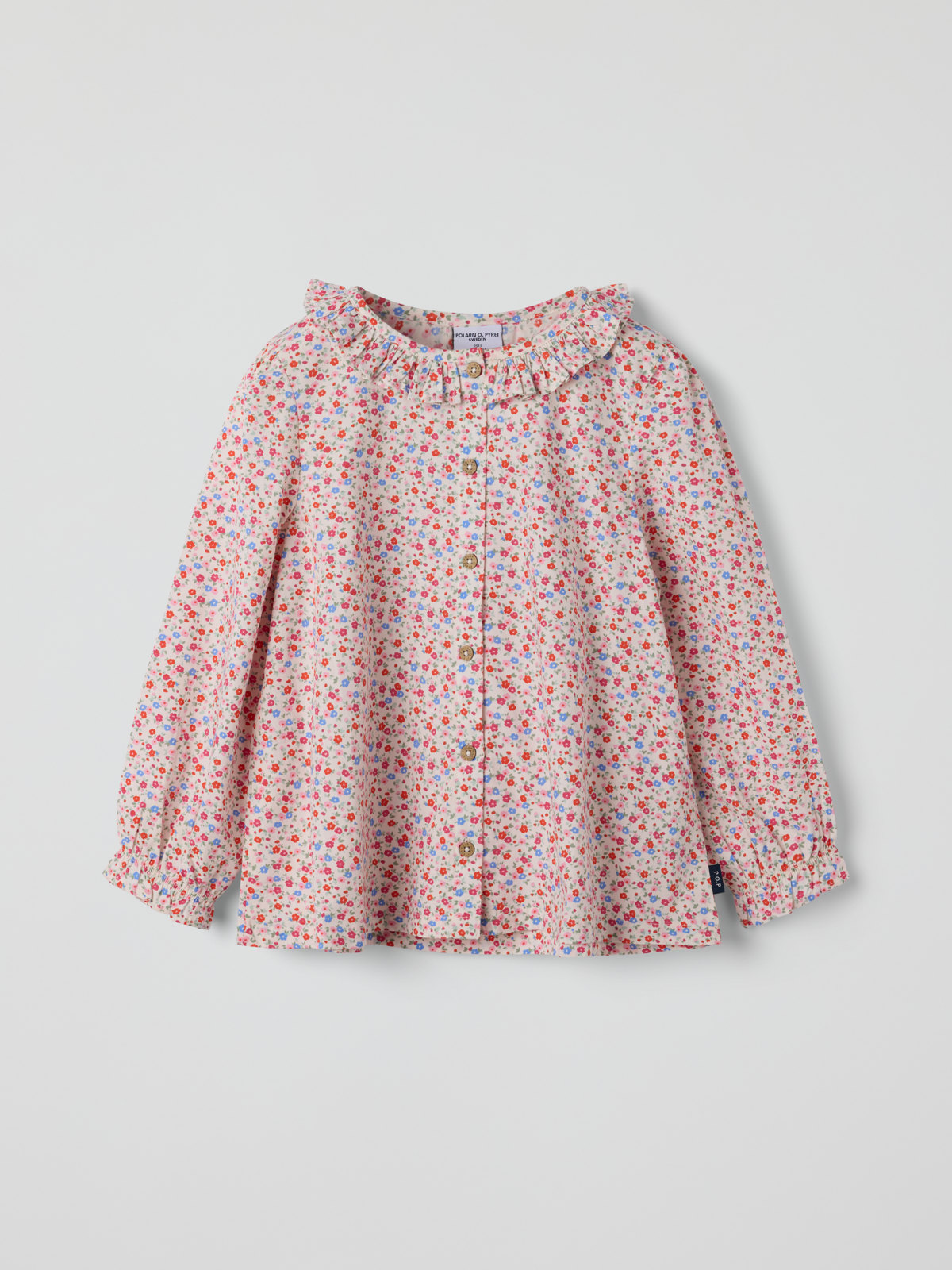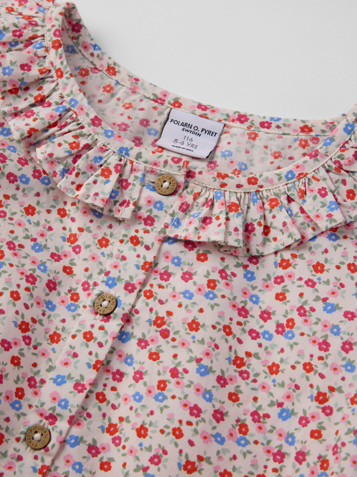Blus i tunn muslin tillverkad av 100% ekologisk bomull. Blusen har rynkad nederkant och söta volanger i halsringning och ärmslut. Den stängs med knappar fram.