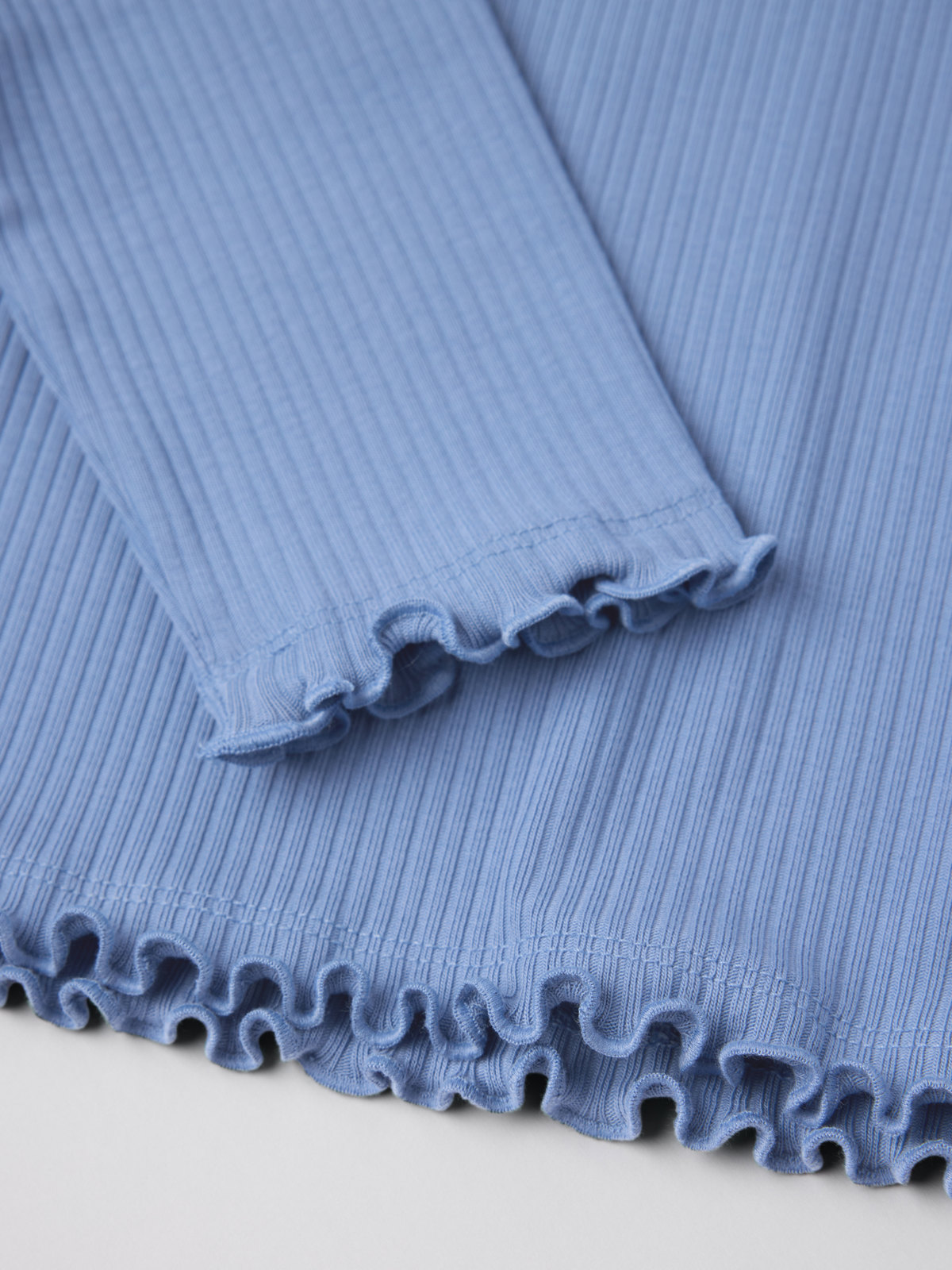 Enfärgad ribbad topp i mjuk ekologisk bomull – perfekt för alla tillfällen! Toppen har krusade uddkanter vid ärmslut och i nederkant.