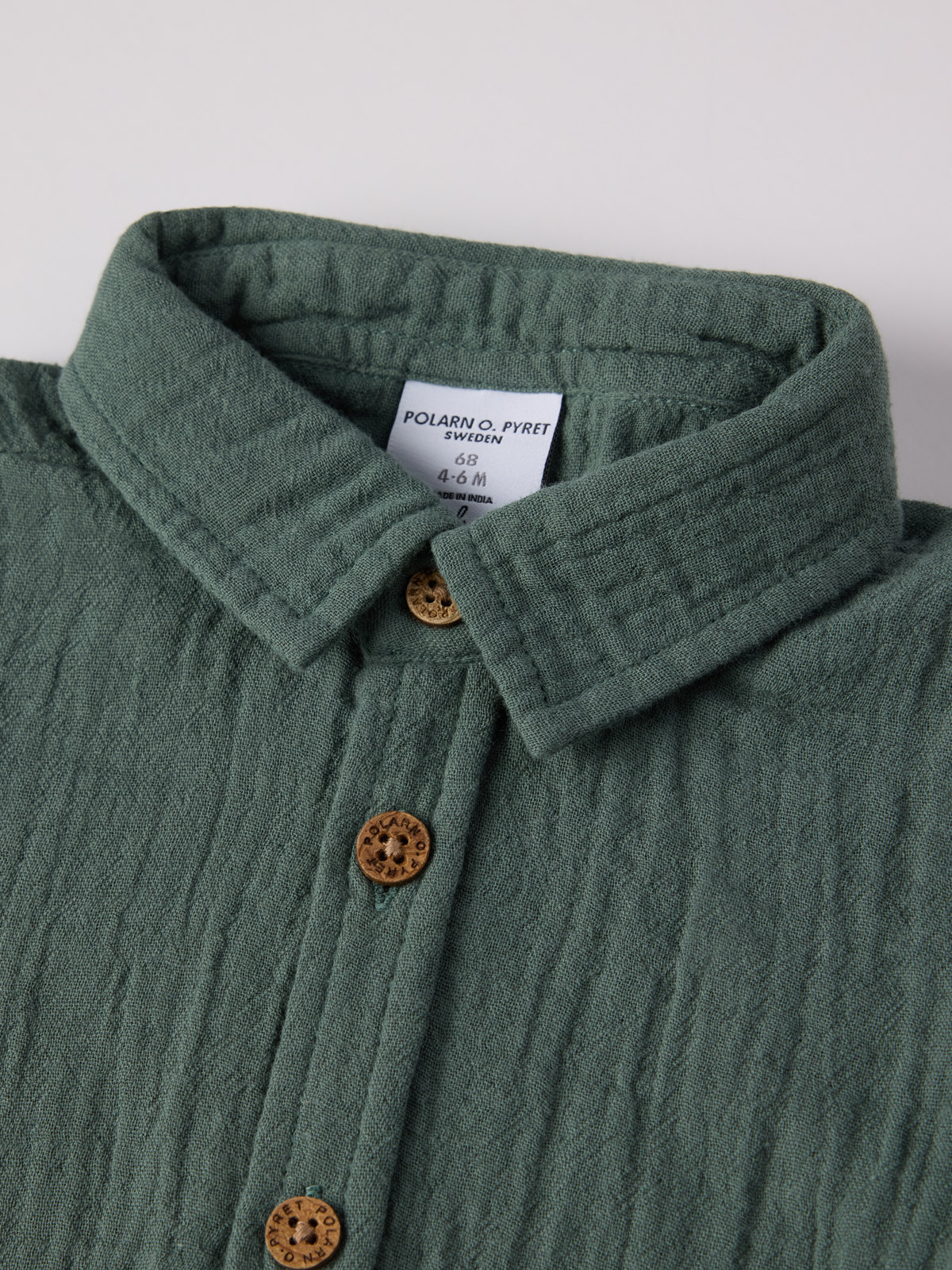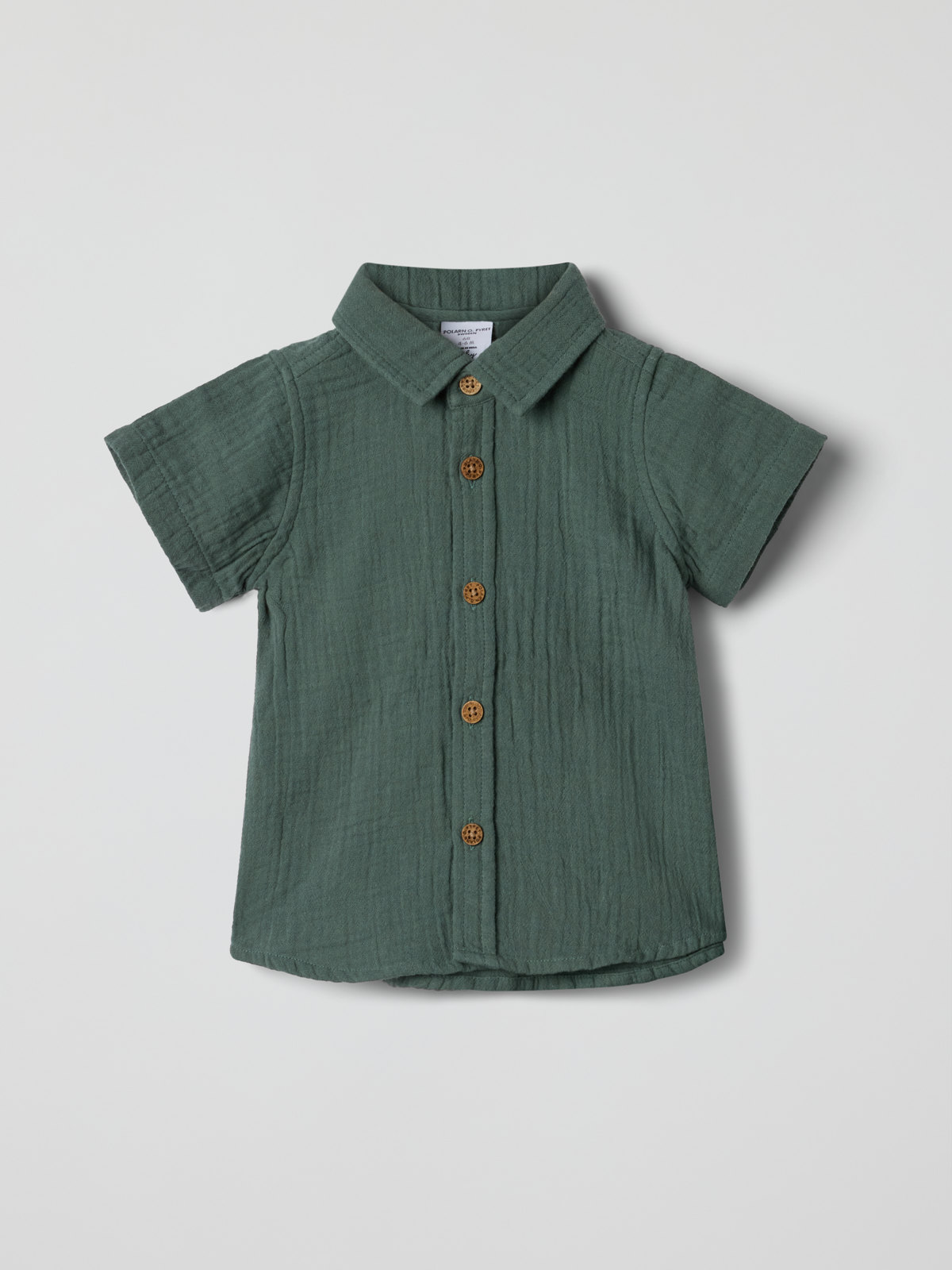 Kortärmad skjorta i mjuk muslin av ekologisk bomull för baby – perfekt både till vardags och sommarfesten! Skjortan har mjuk krage och stängs med knappar fram.