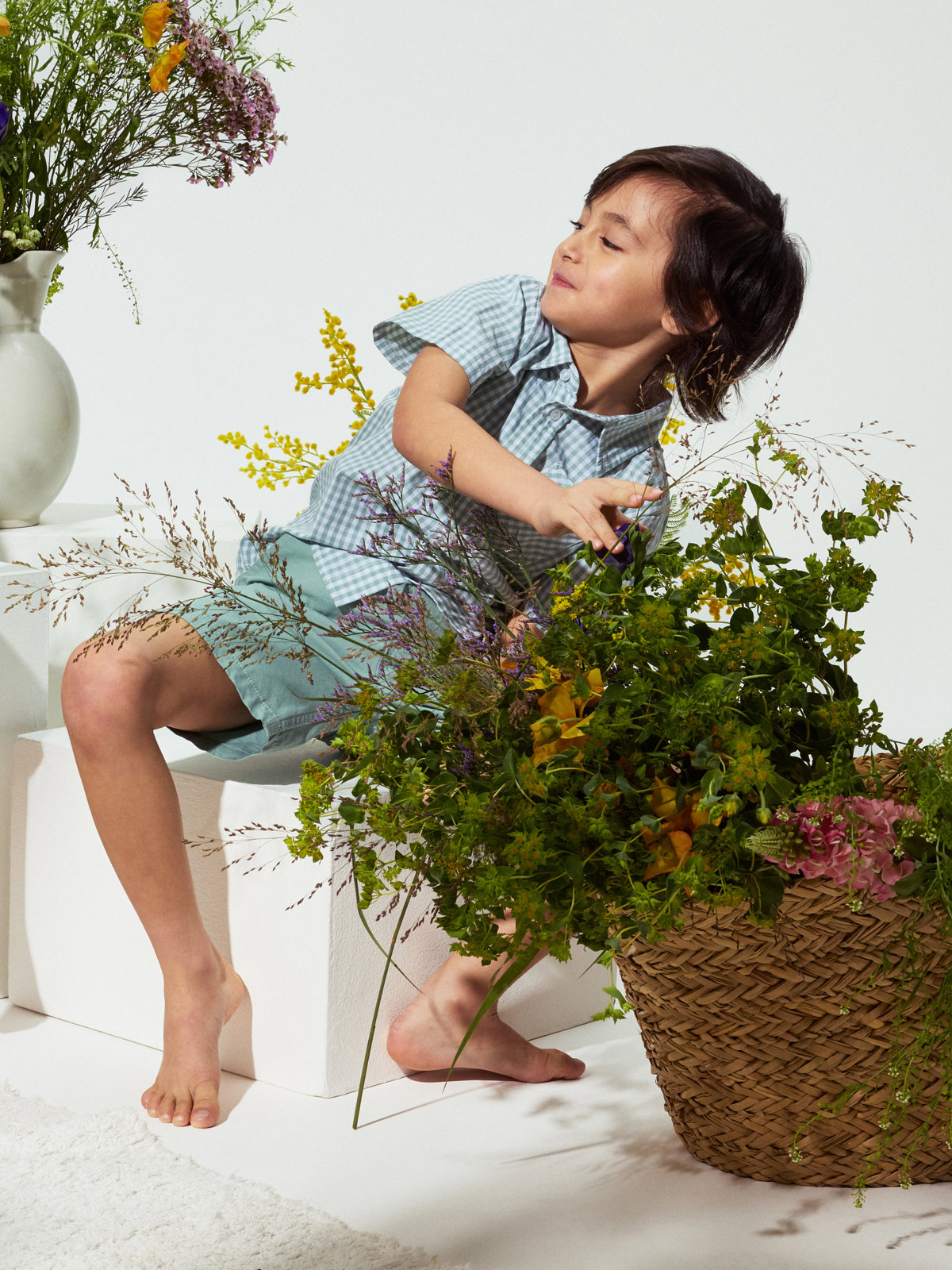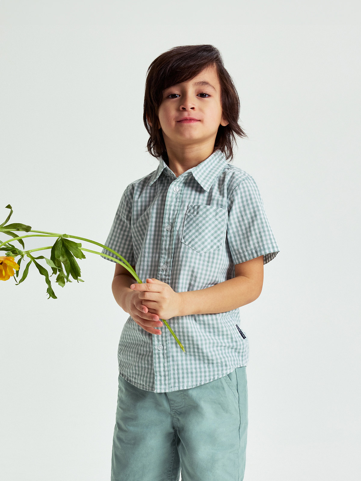 Rutig kortärmad skjorta i mjuk poplin av ekologisk bomull – perfekt både till vardags och sommarfesten! Skjortan har en bröstficka och stängs med stängs med knappar fram.