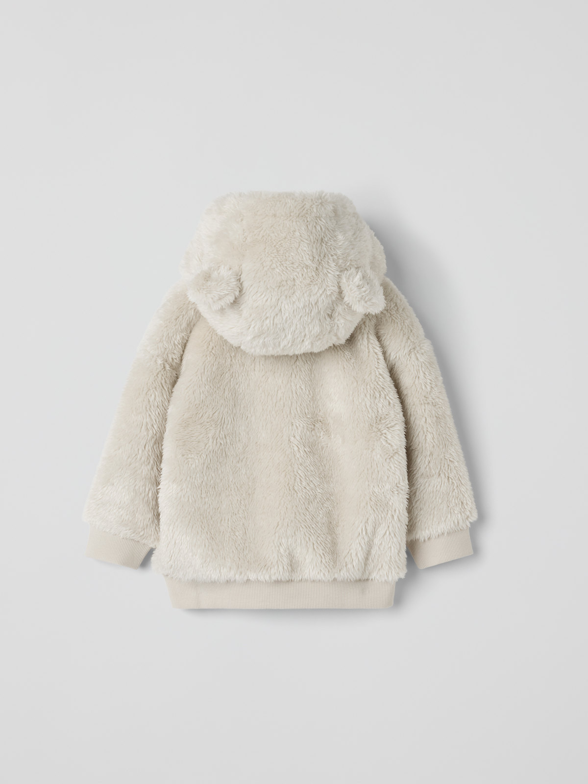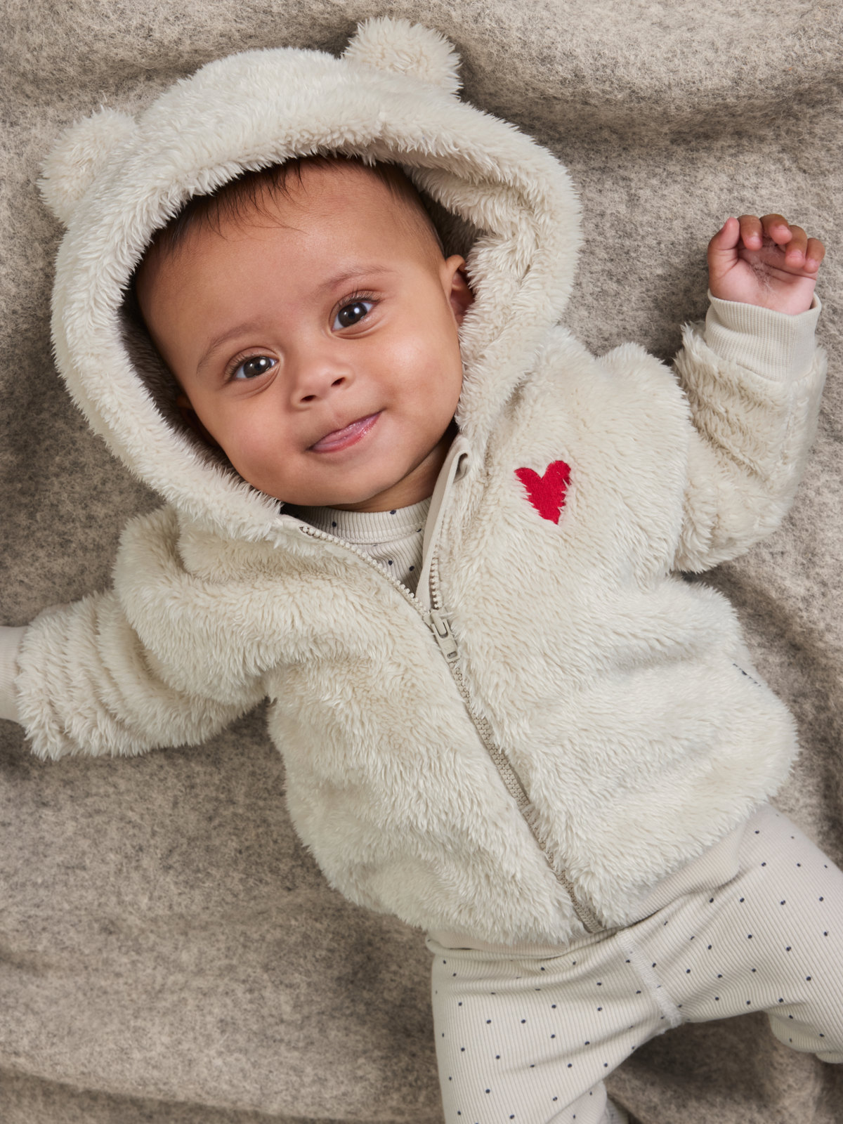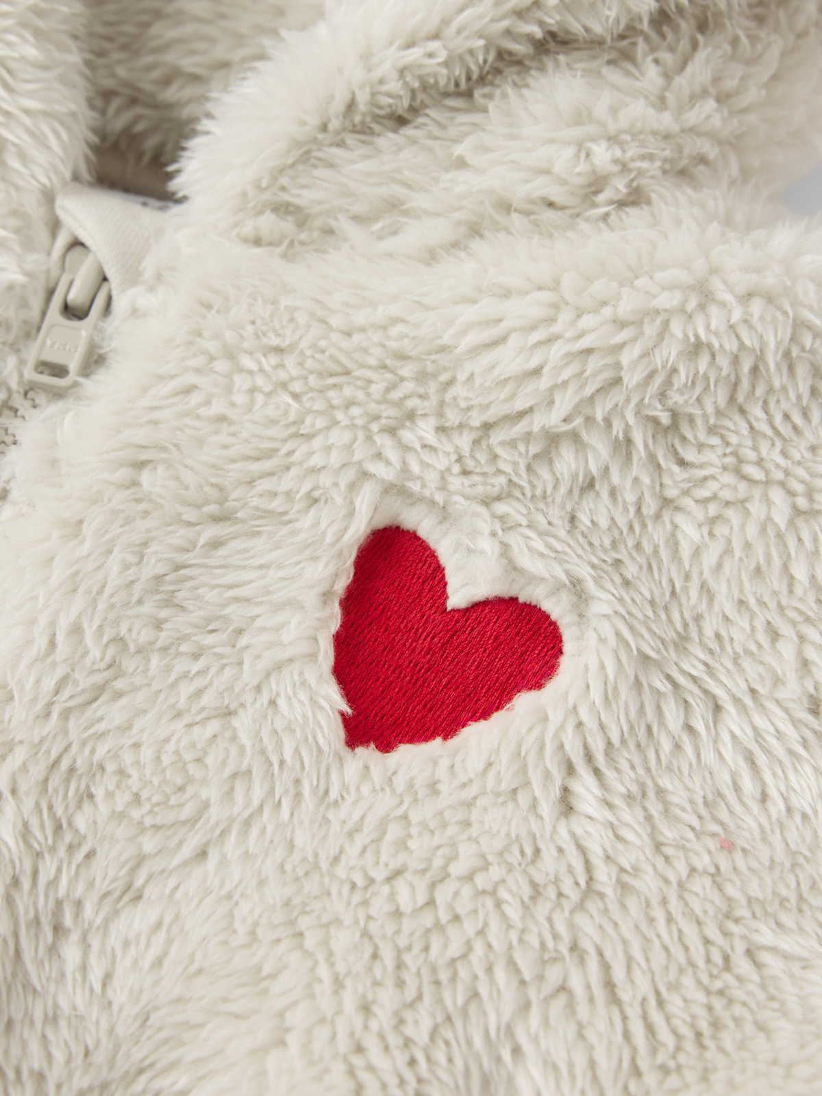 Gosig pilehoodie tillverkad av 100% återvunnen polyester. Hoodien har avtagbar huva med söta små öron. De ribbade muddarna i ärmslut och nederkant ger en skön passform. Dragkedjan har ett skydd högst upp för att inte skava mot haka och kind. Hoodien har även ett broderat litet hjärta på bröstet.