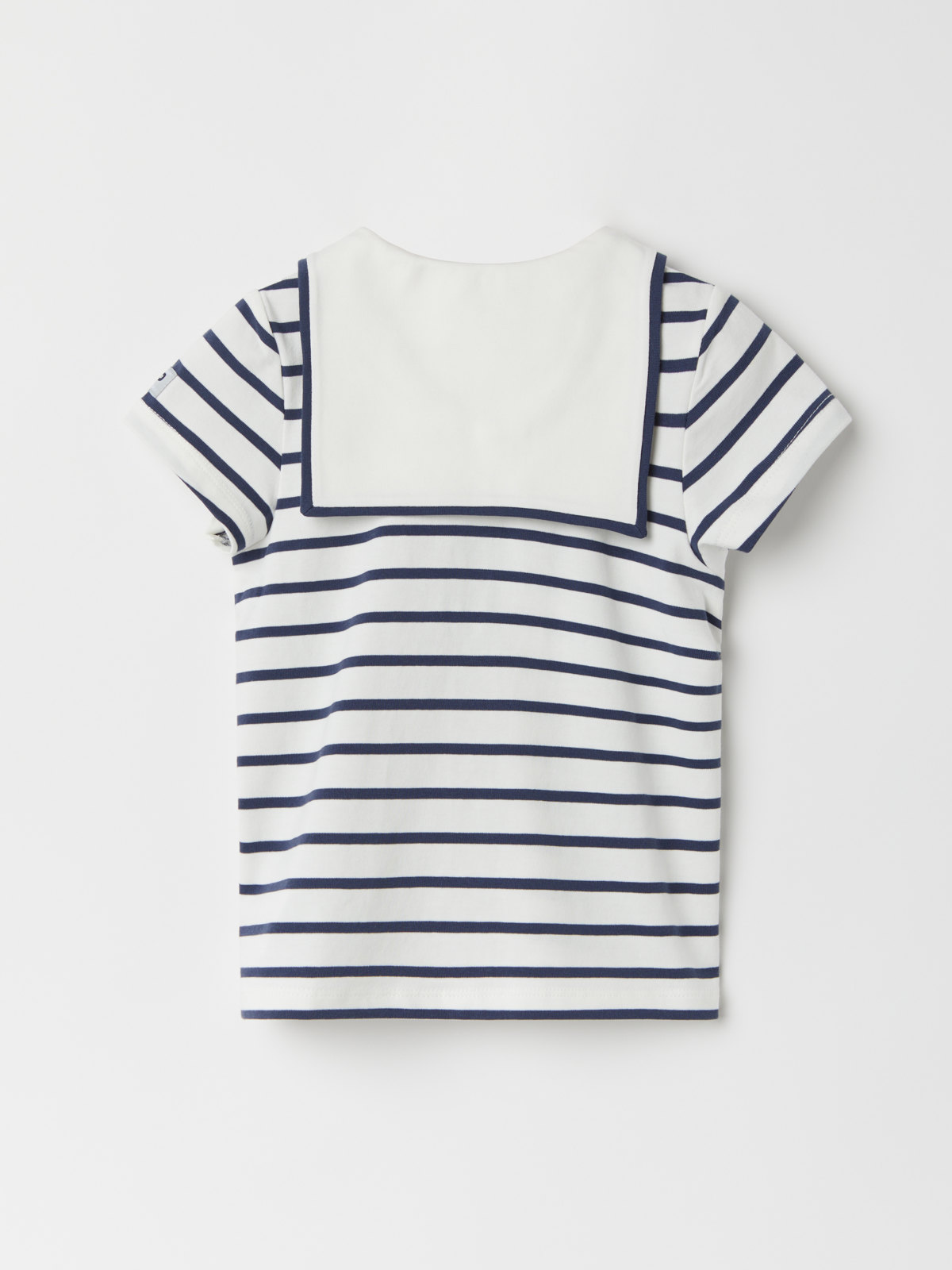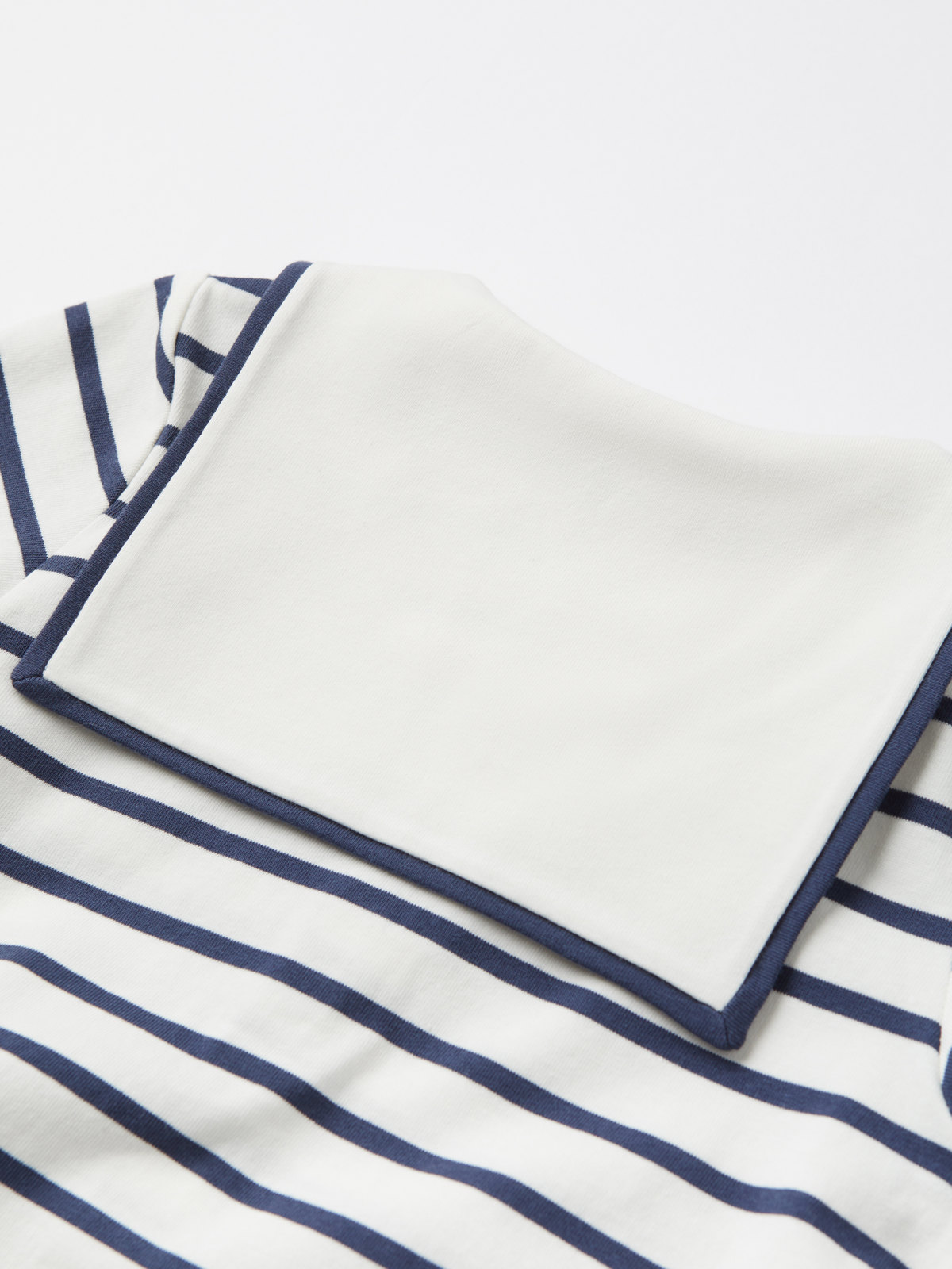 Skjortan har vår klassiska rand och en fin sjömanskrage som fortsätter ned på ryggen.